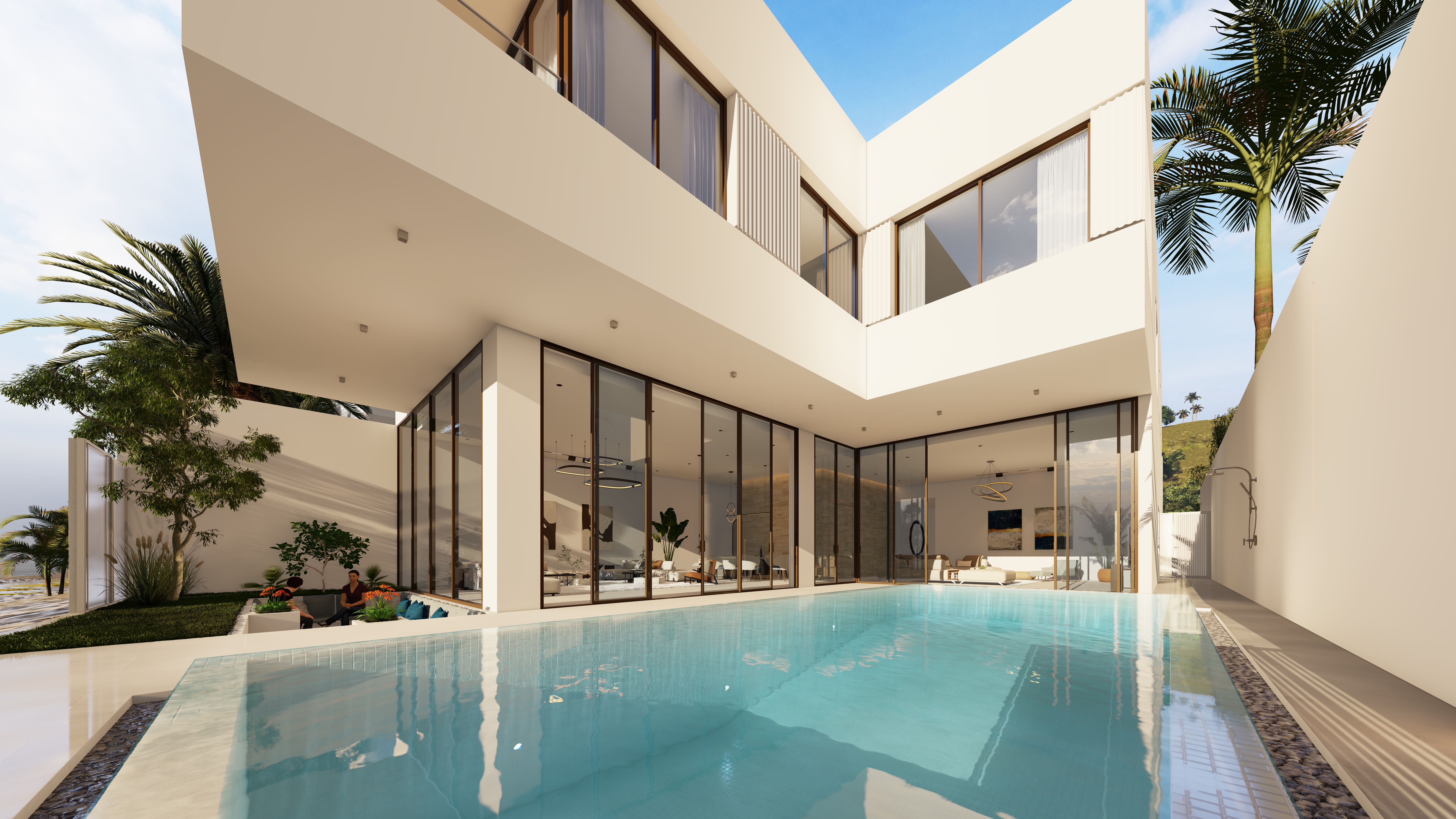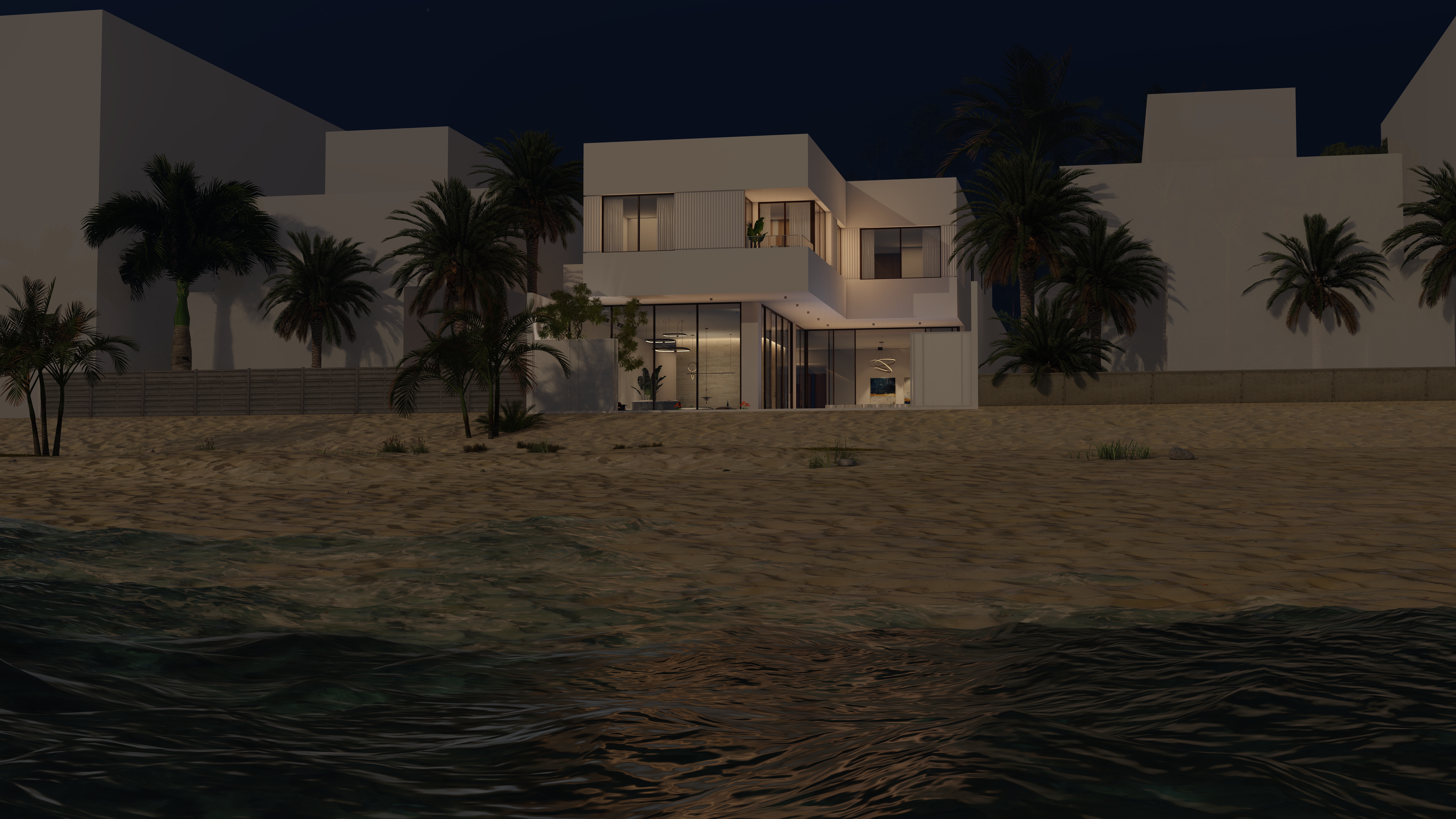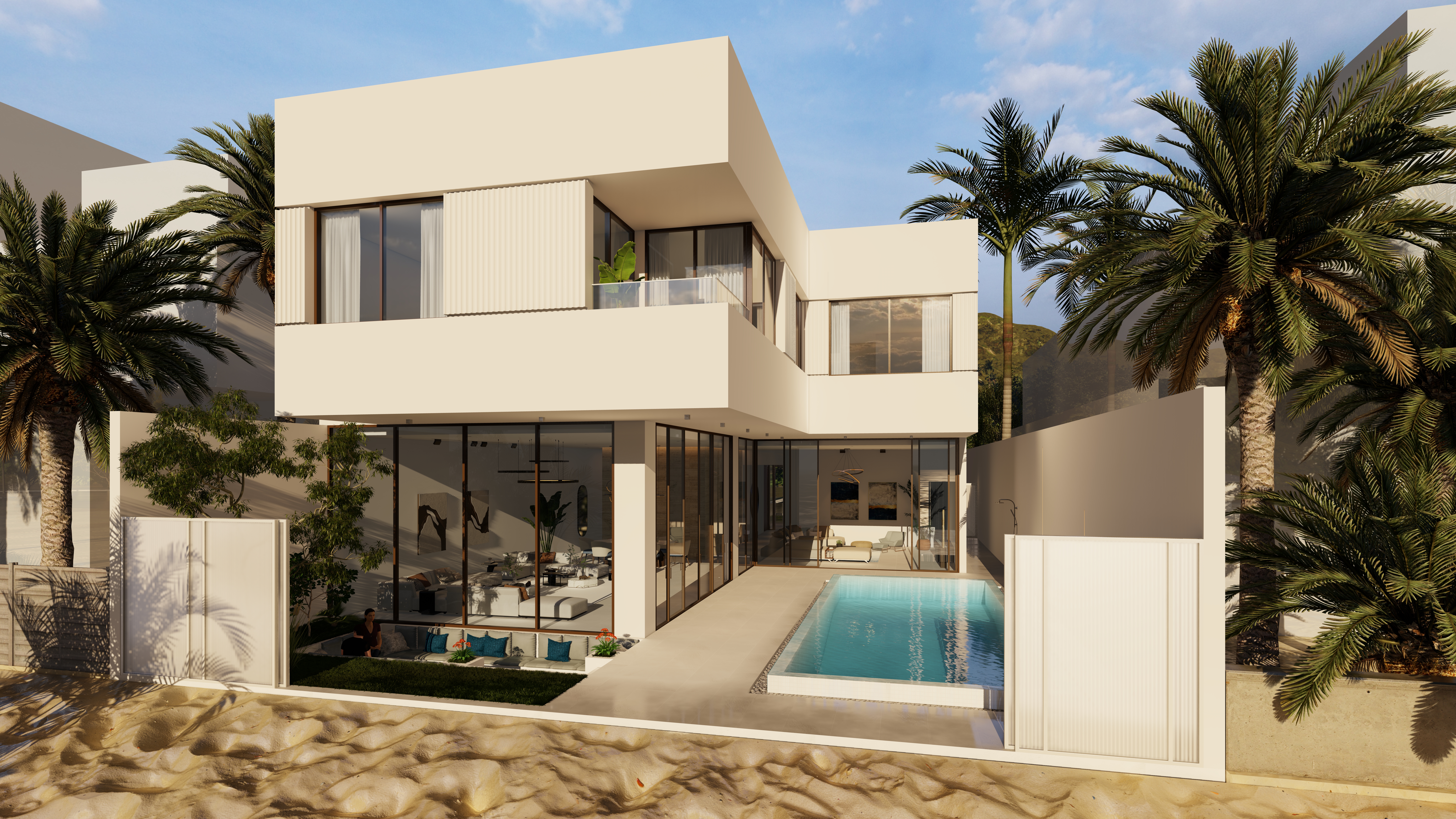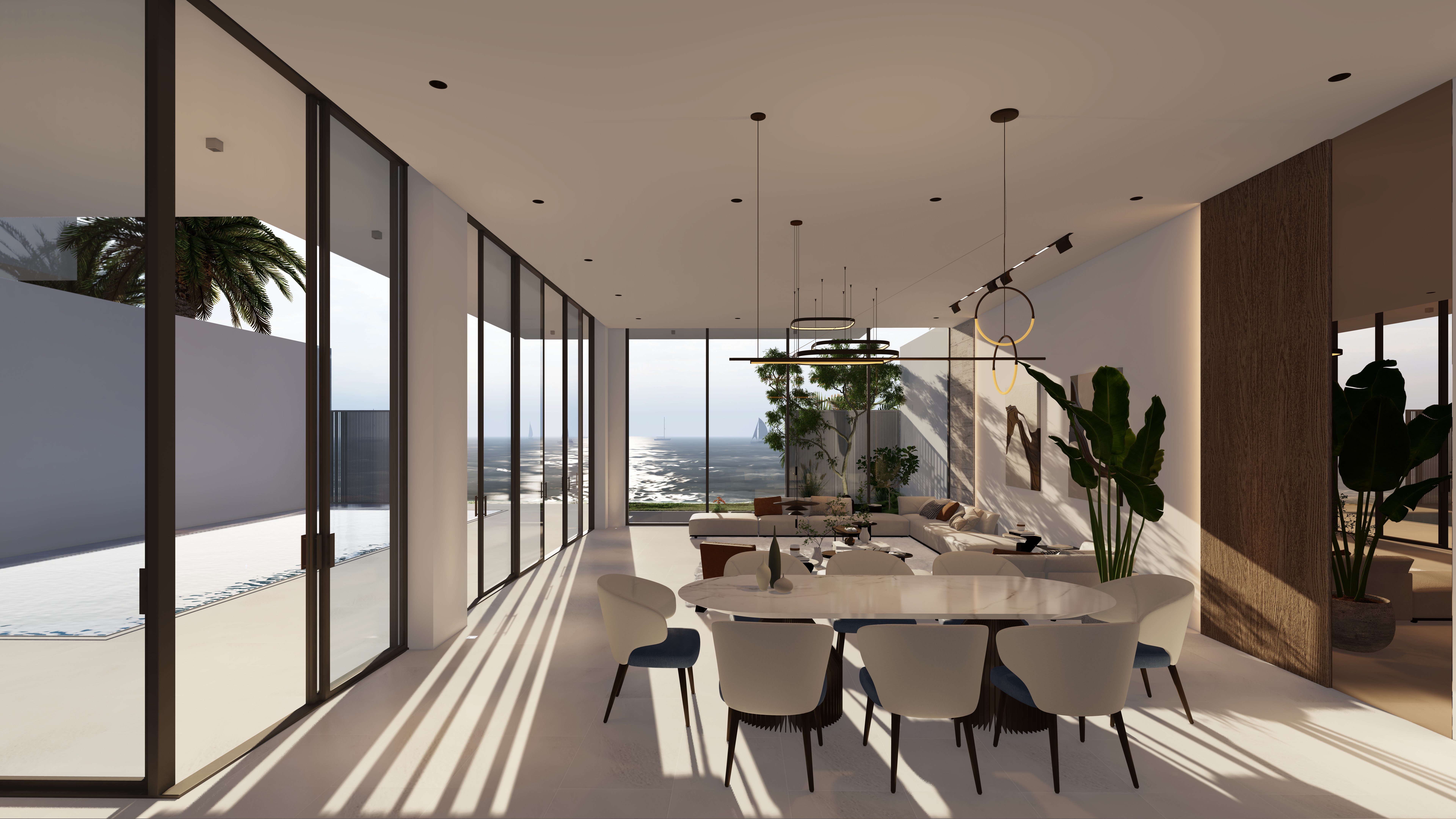 Generous outdoor terraces, poolside living spaces, and minimal white volumes create a serene atmosphere where simplicity meets sophistication. The composition balances privacy and openness, offering tranquil family spaces while maintaining strong visual connections to the surrounding marine environment.