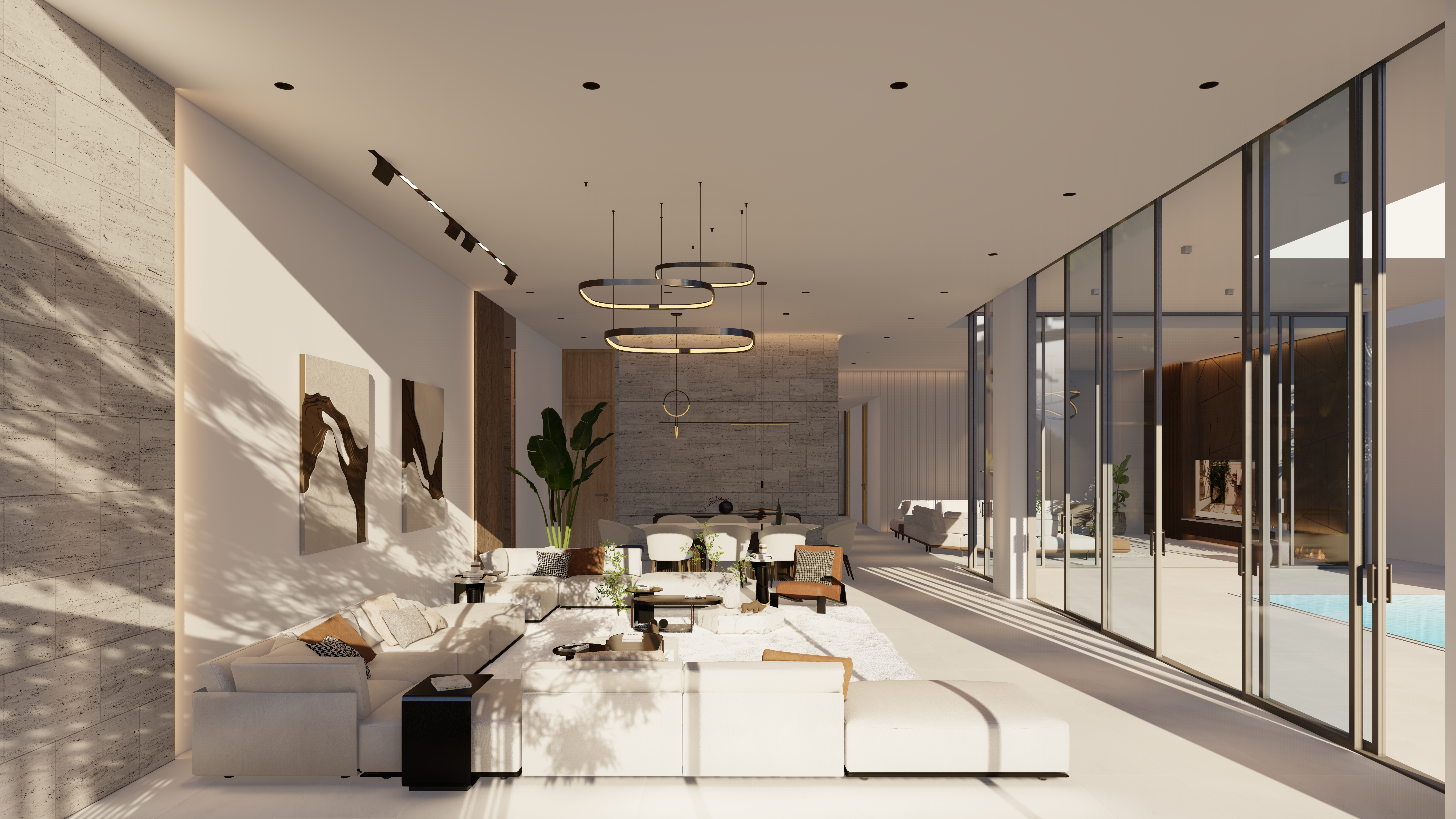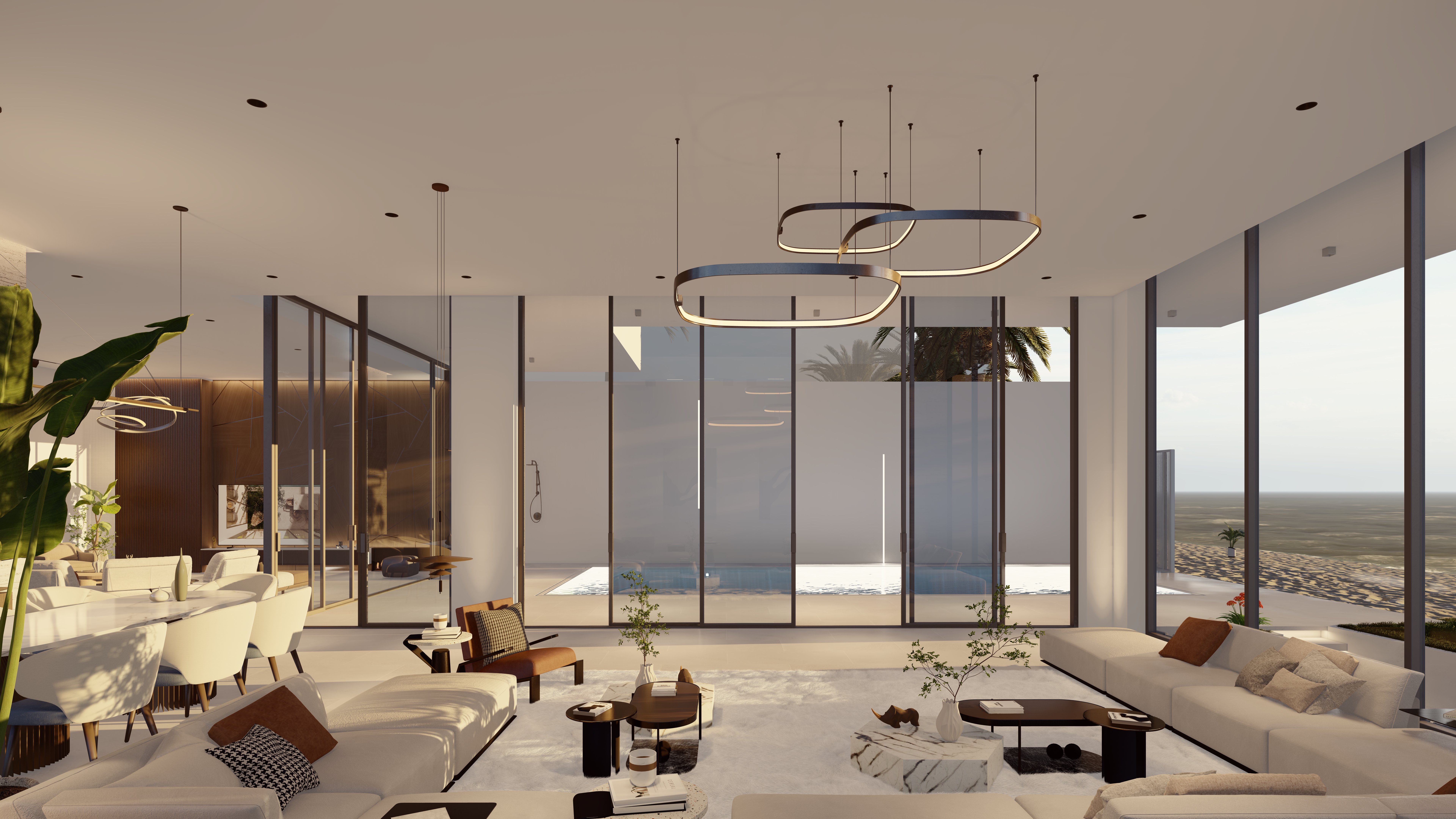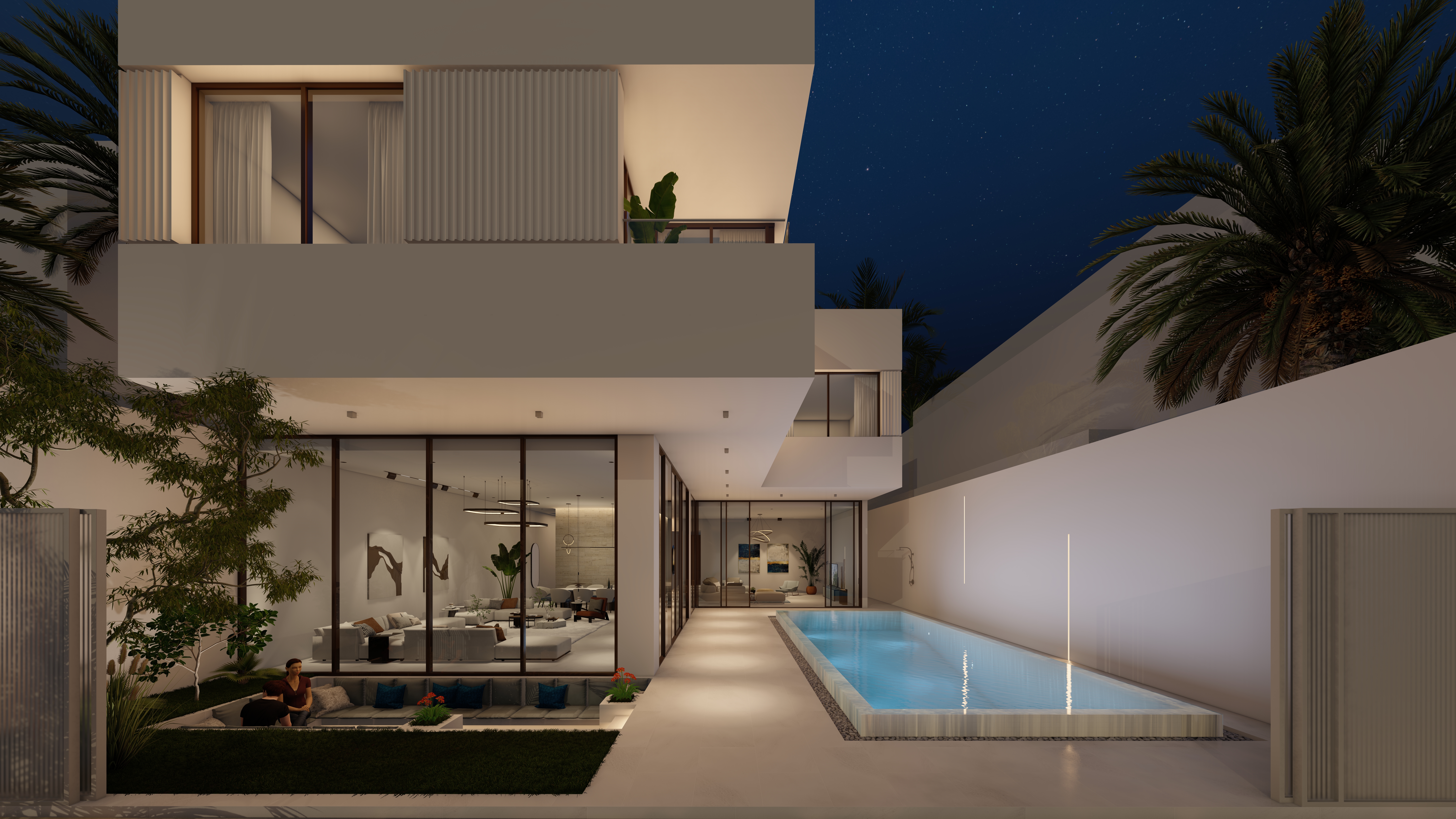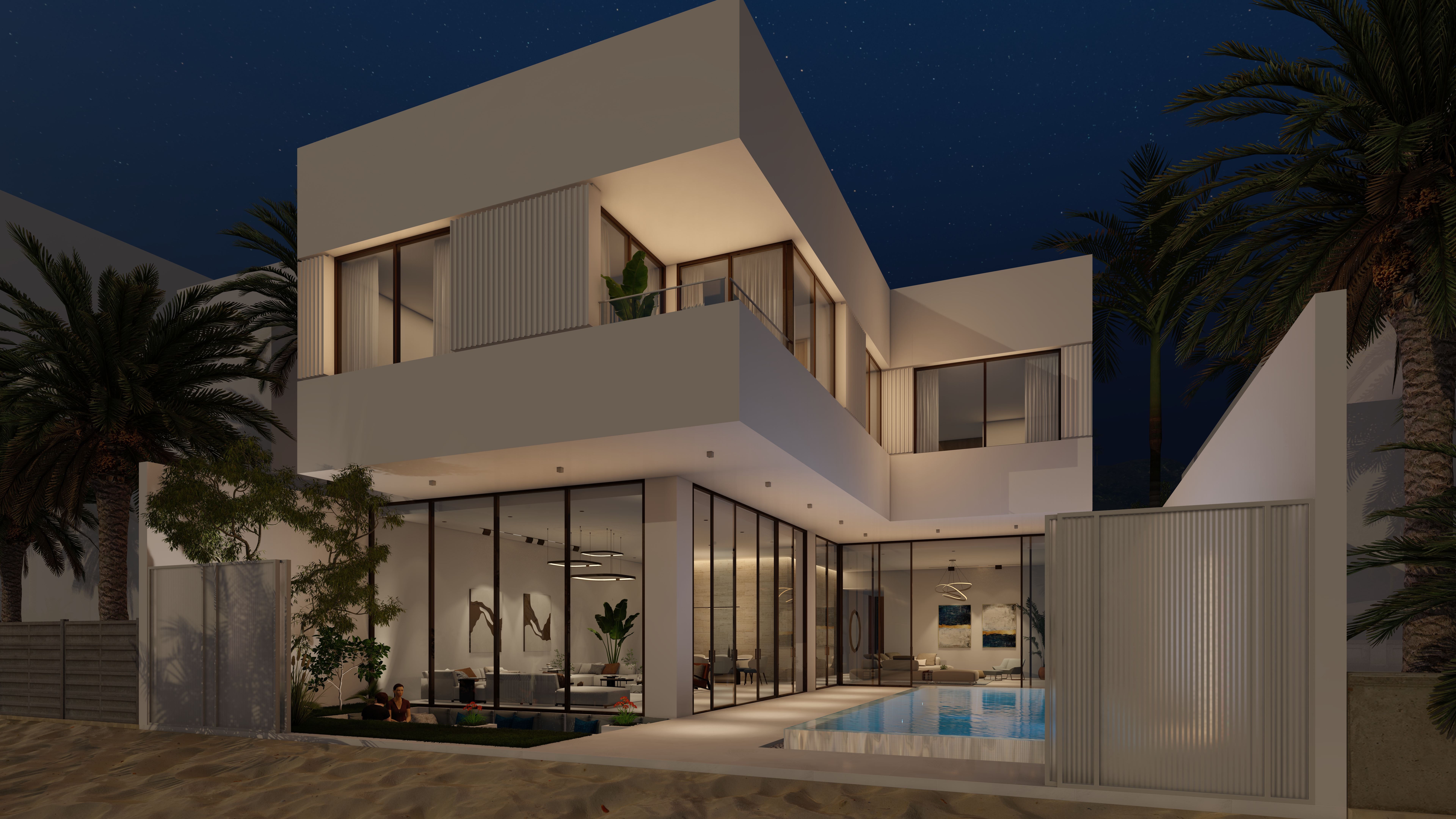 Generous outdoor terraces, poolside living spaces, and minimal white volumes create a serene atmosphere where simplicity meets sophistication. The composition balances privacy and openness, offering tranquil family spaces while maintaining strong visual connections to the surrounding marine environment.