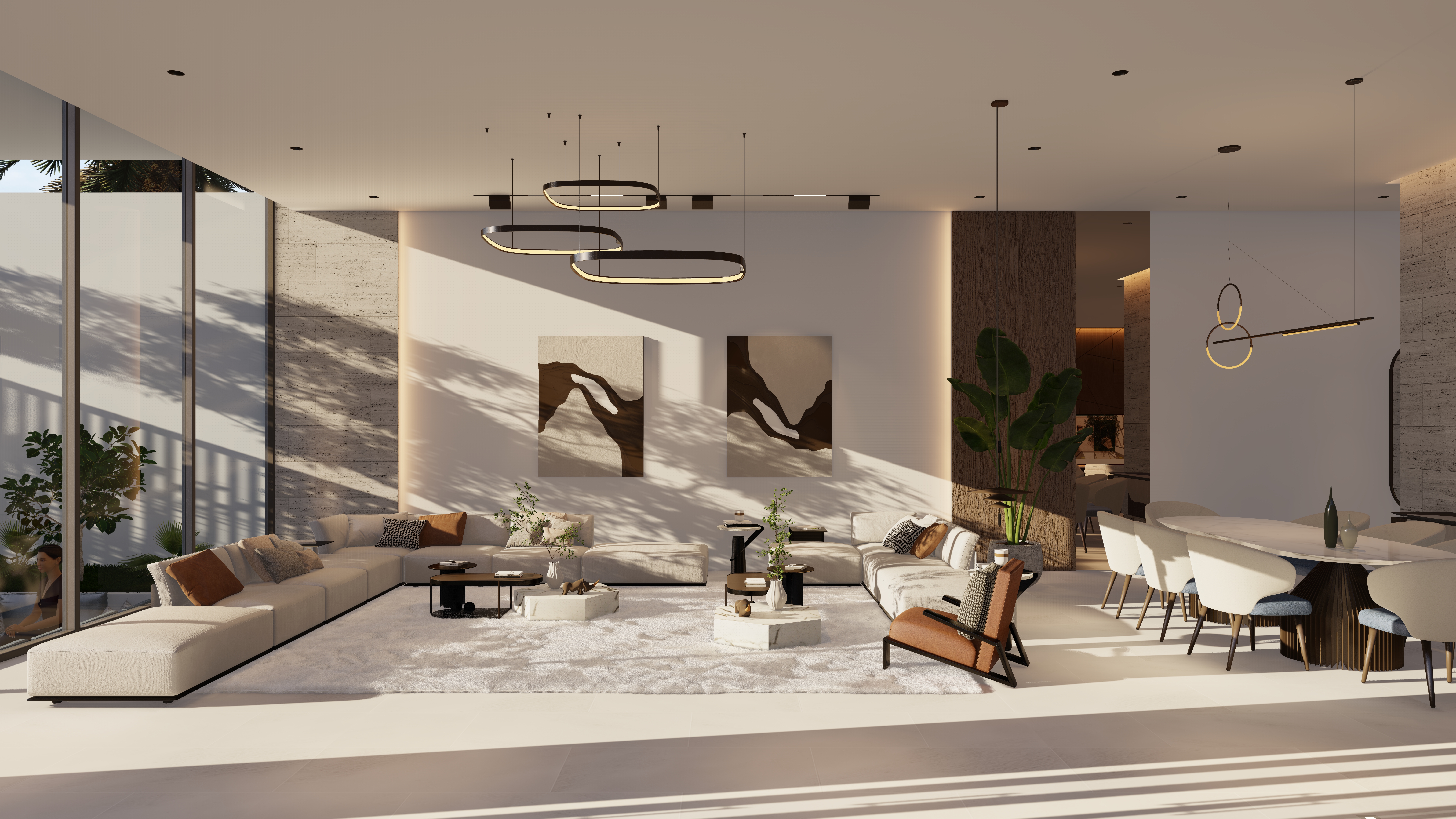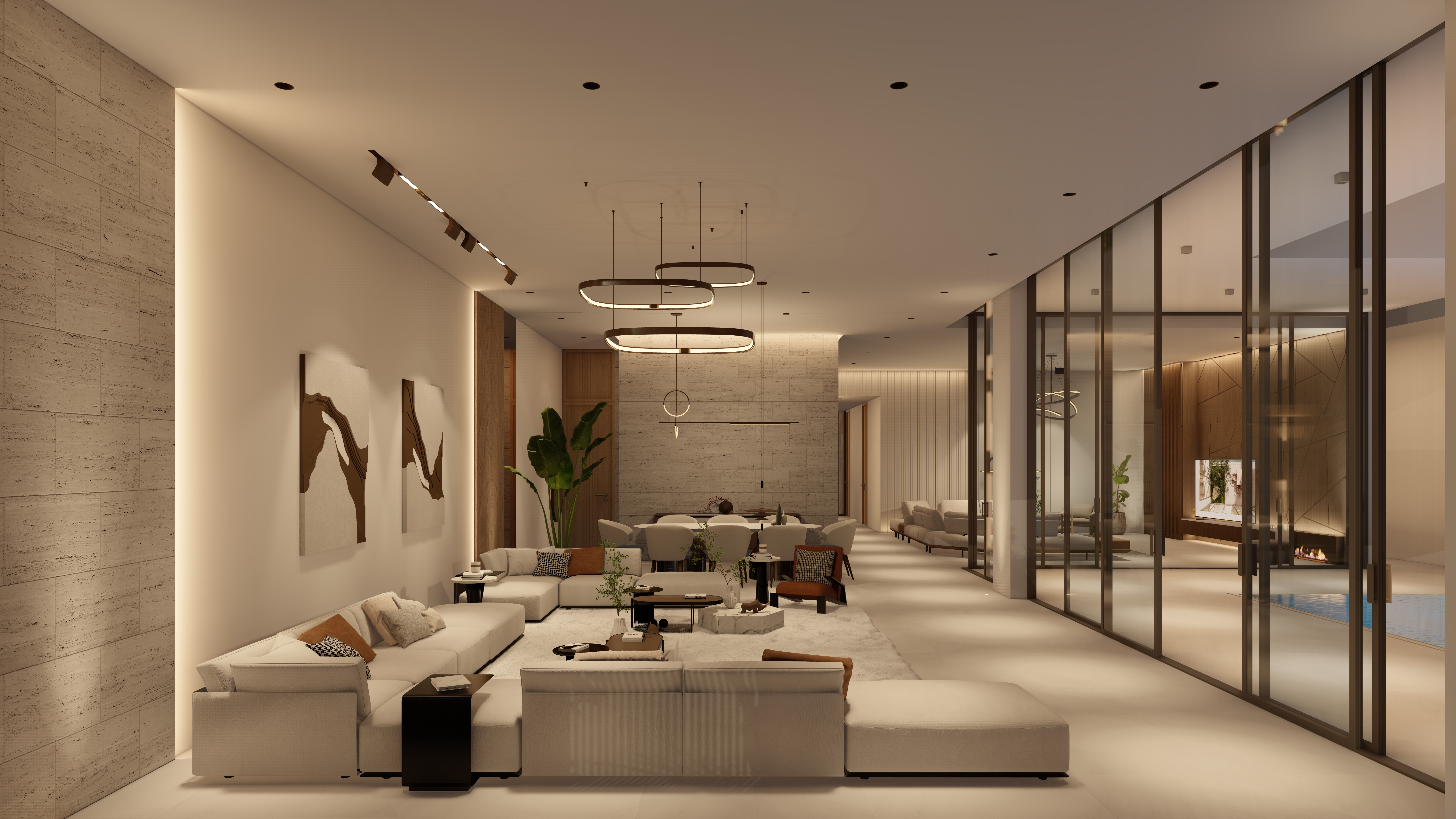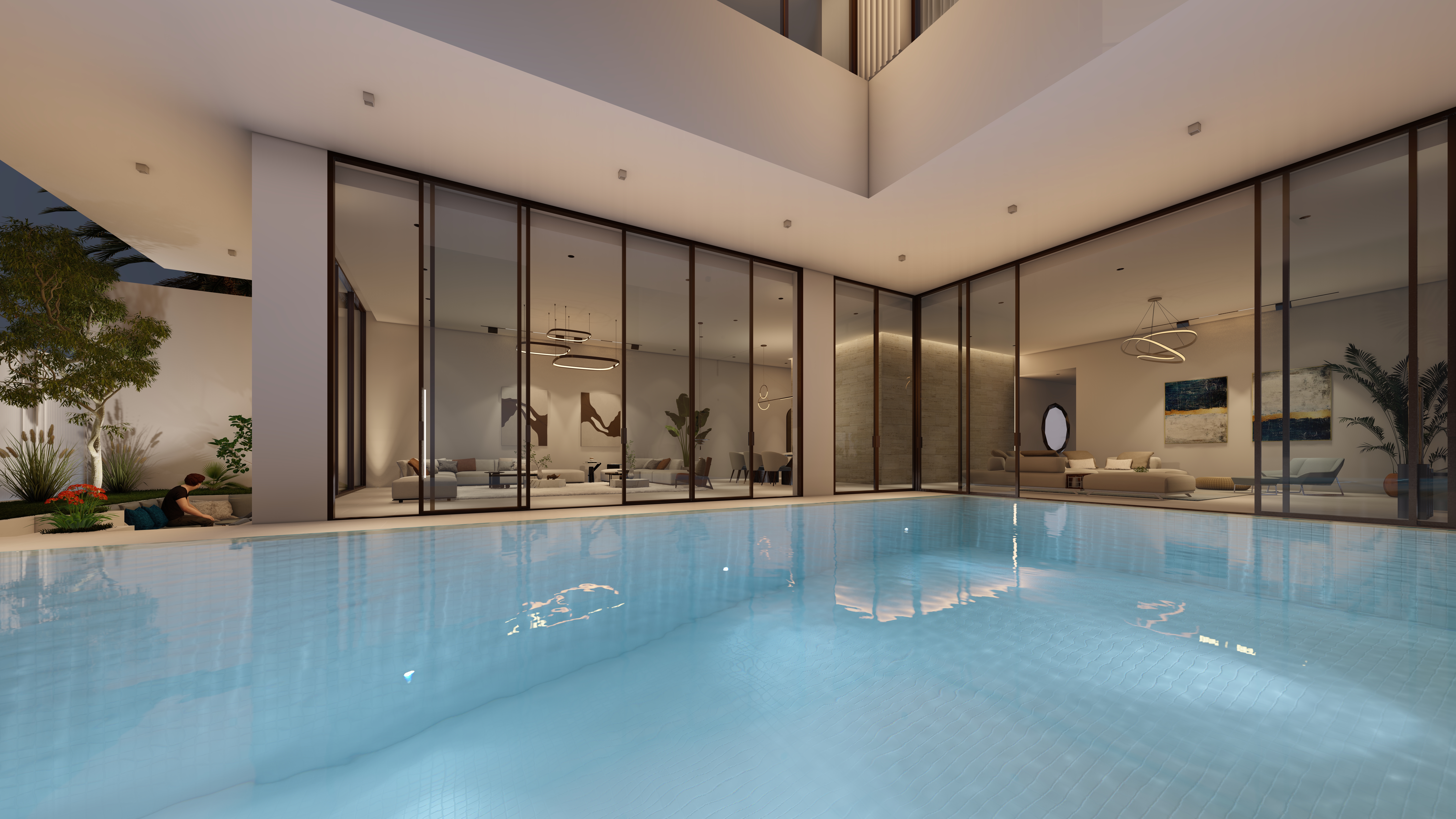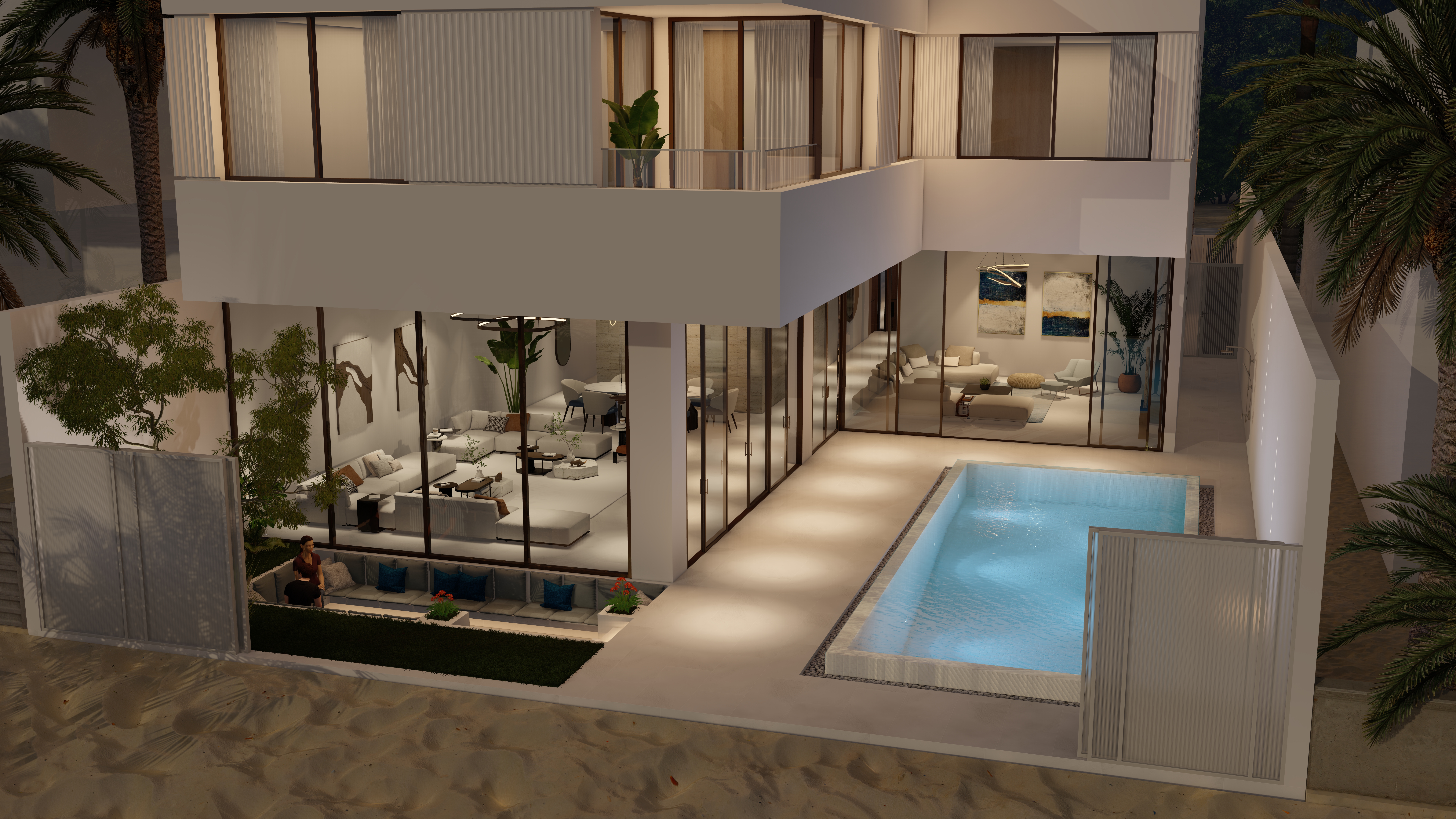 Generous outdoor terraces, poolside living spaces, and minimal white volumes create a serene atmosphere where simplicity meets sophistication. The composition balances privacy and openness, offering tranquil family spaces while maintaining strong visual connections to the surrounding marine environment.