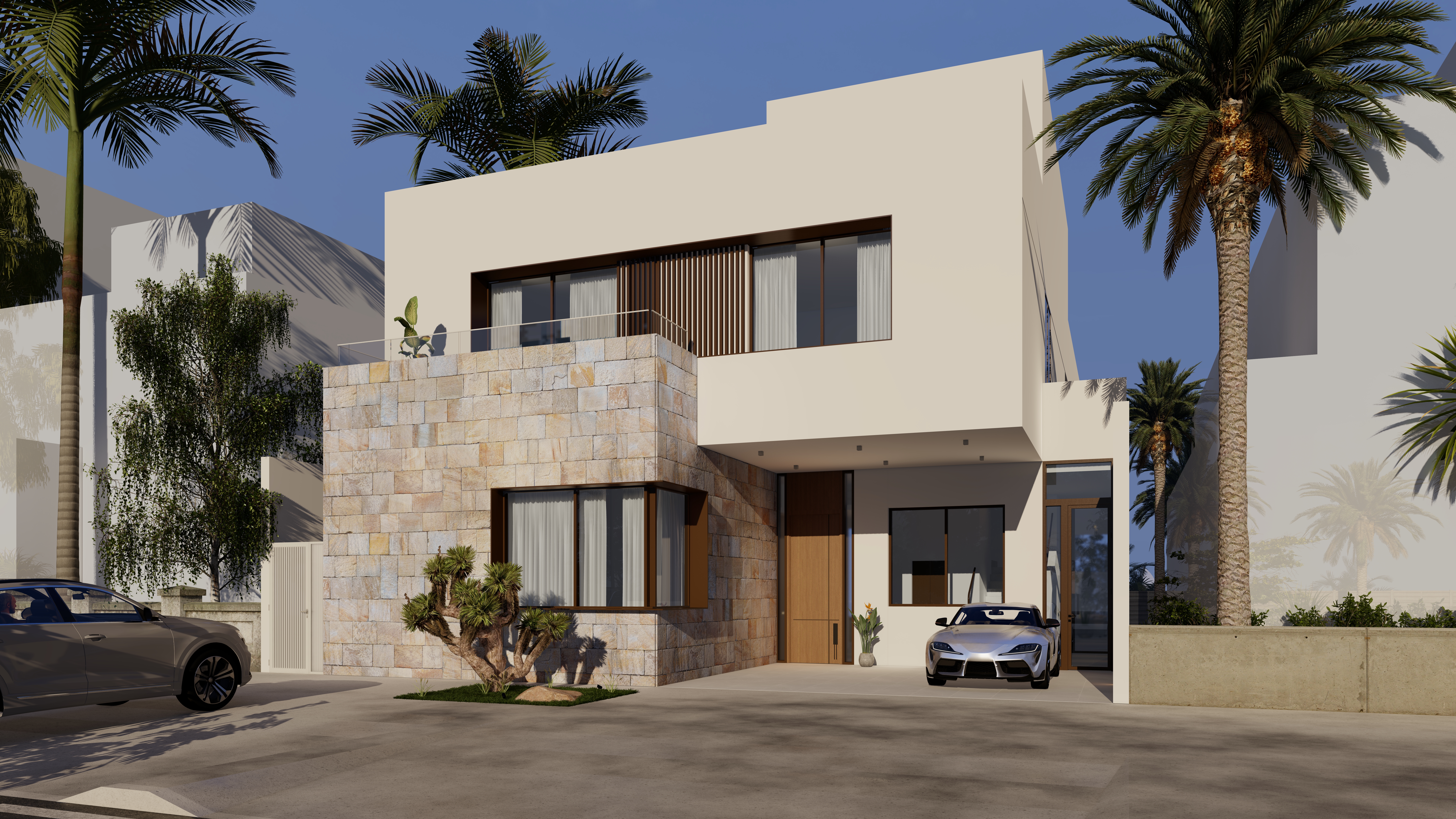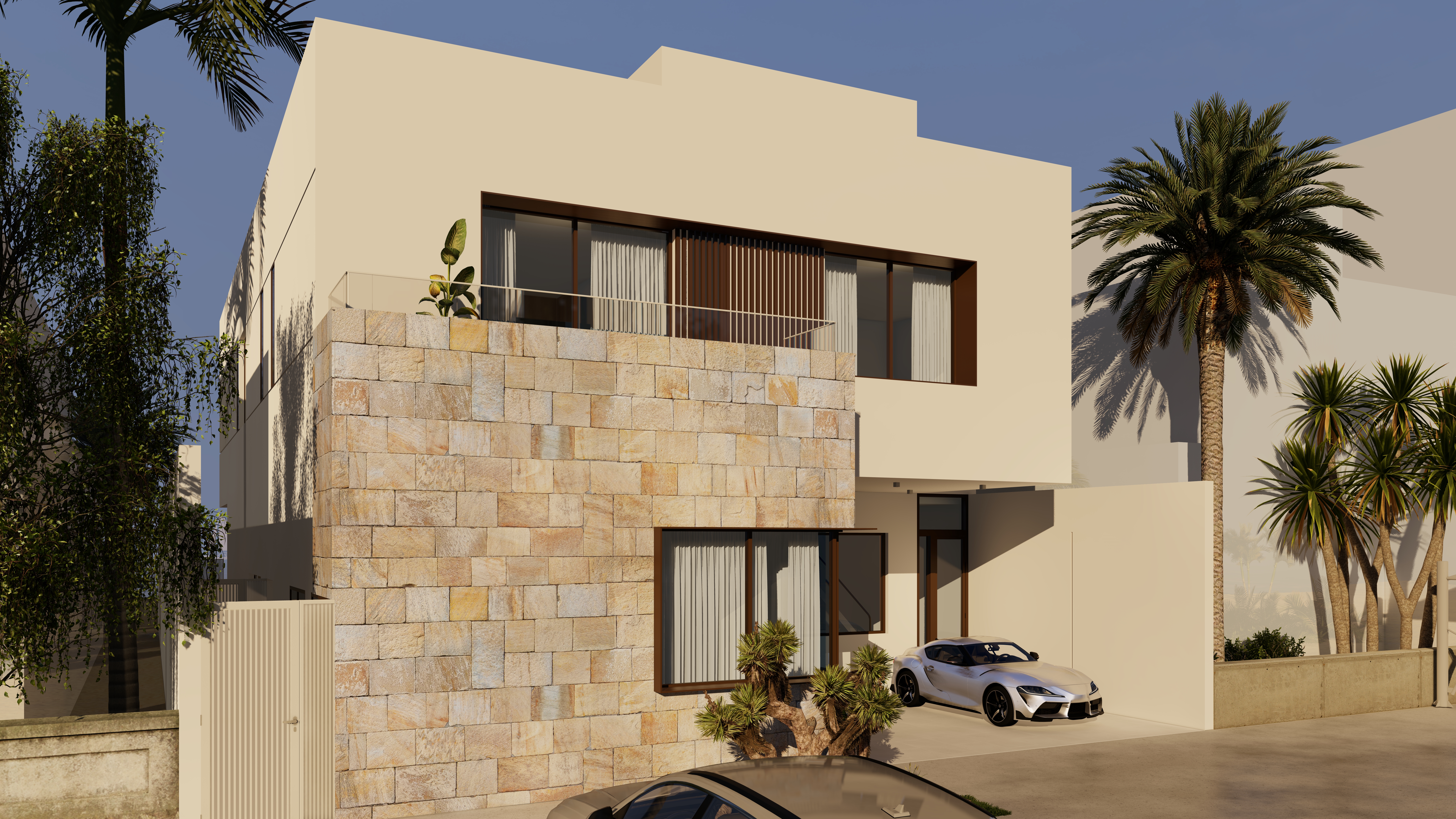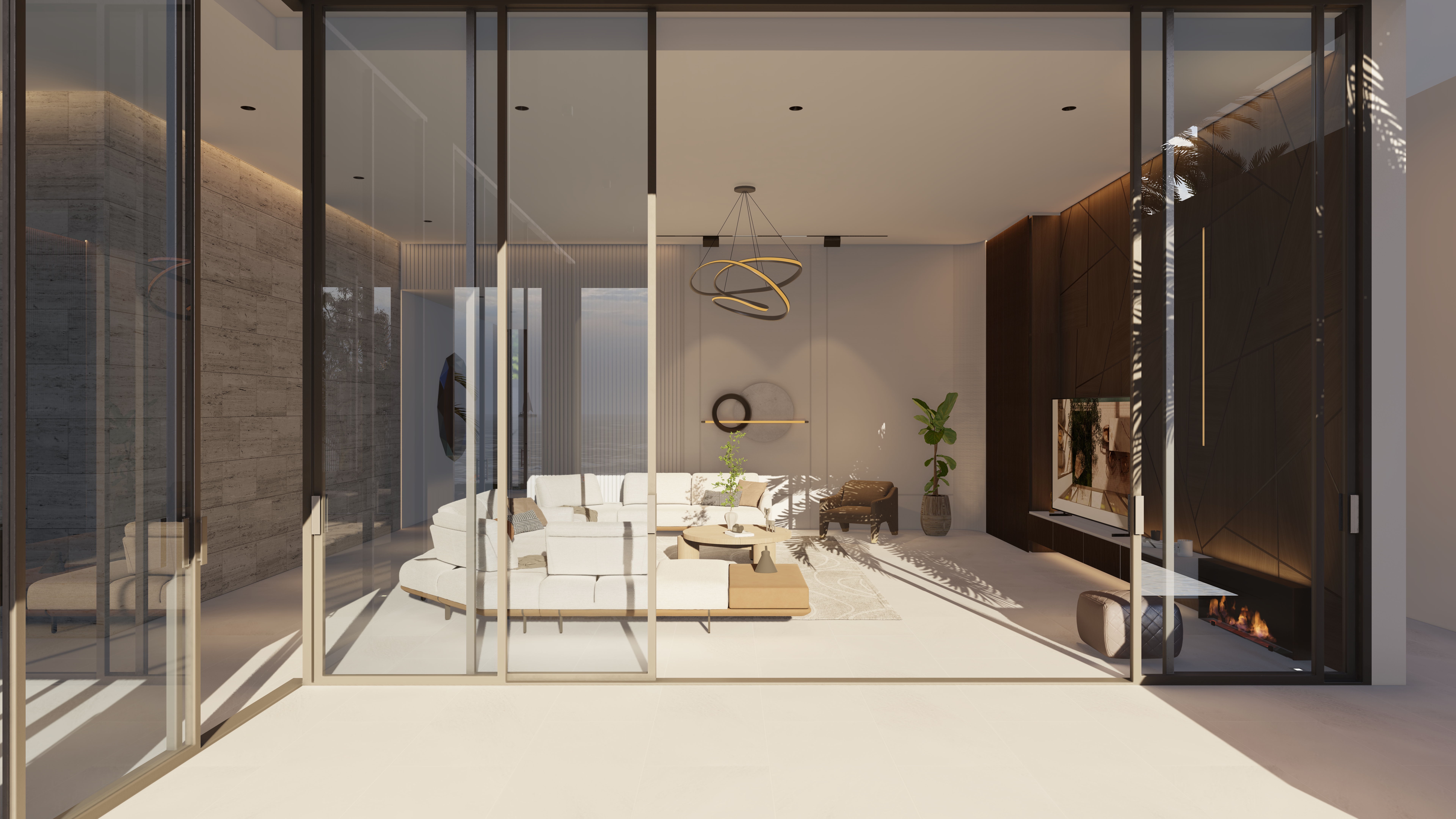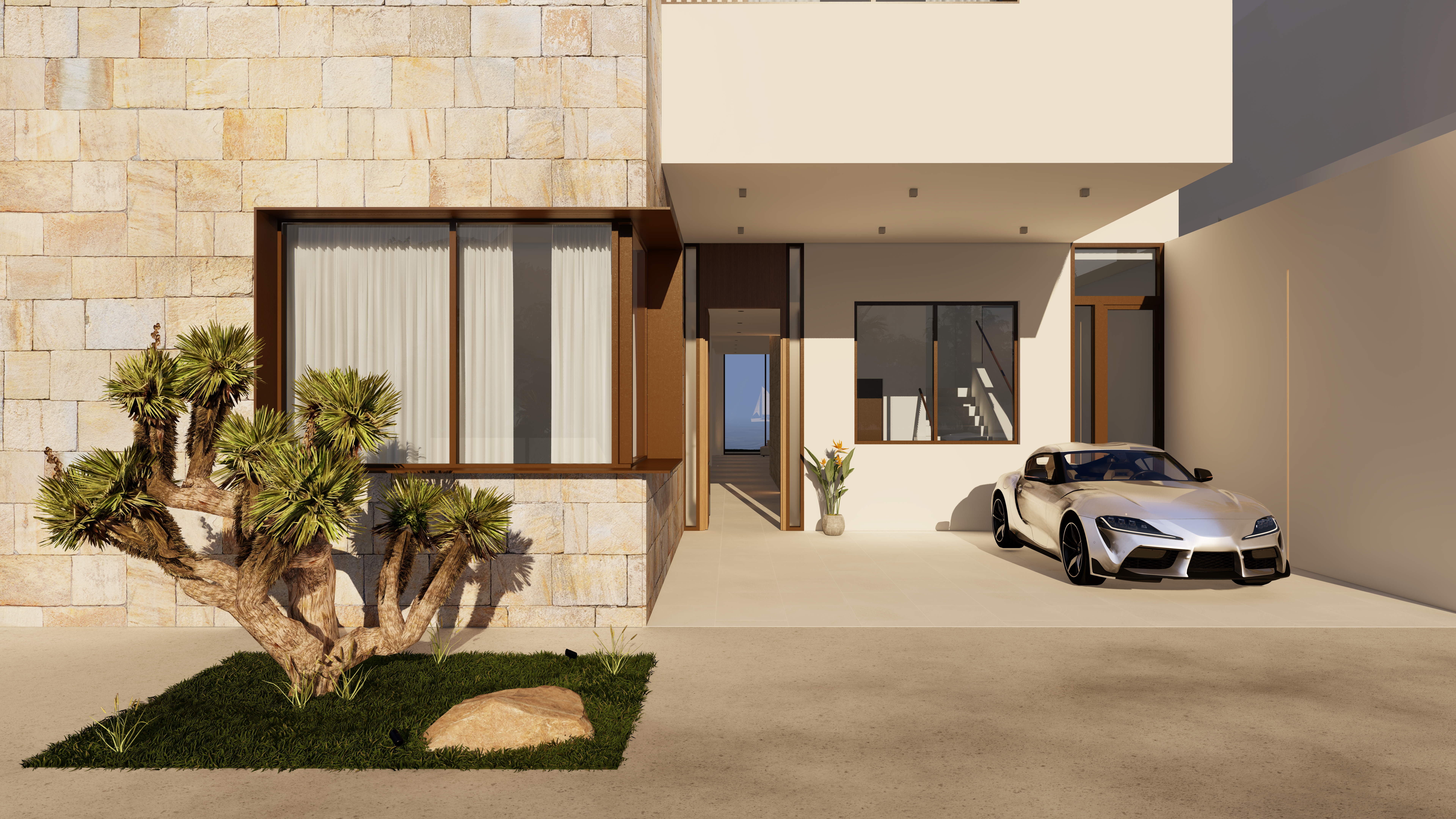 Located 100 km from the city center, this chalet is envisioned as a calm retreat that blurs the boundaries between built form and nature. The design emphasizes seamless integration of architecture and landscape, with expansive glazing, open courtyards, and fluid circulation that draw the sea breeze and natural light deep into the interiors. The entrance opens directly to a framed view of the sea, offering an immediate connection between arrival and the horizon beyond.