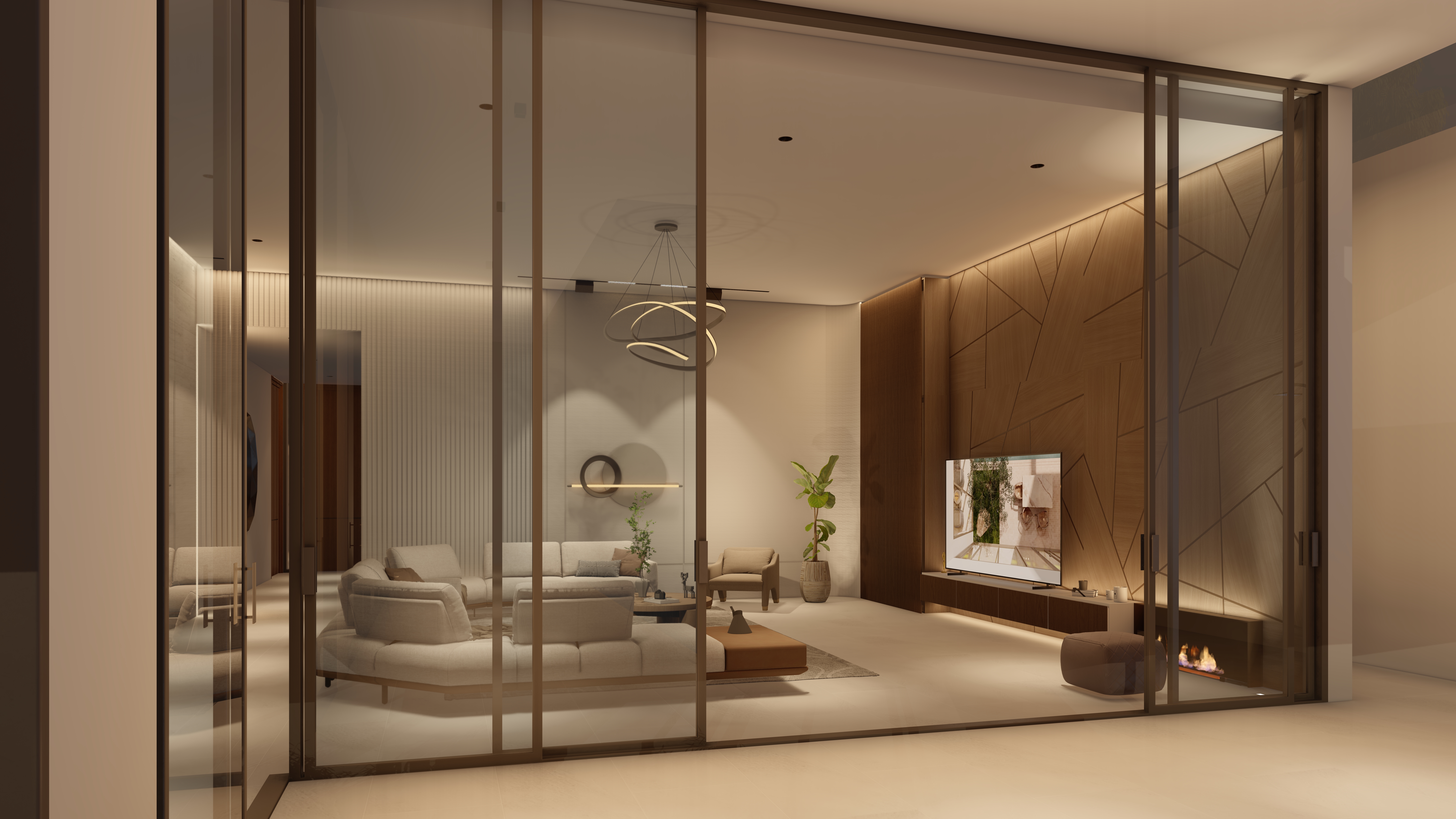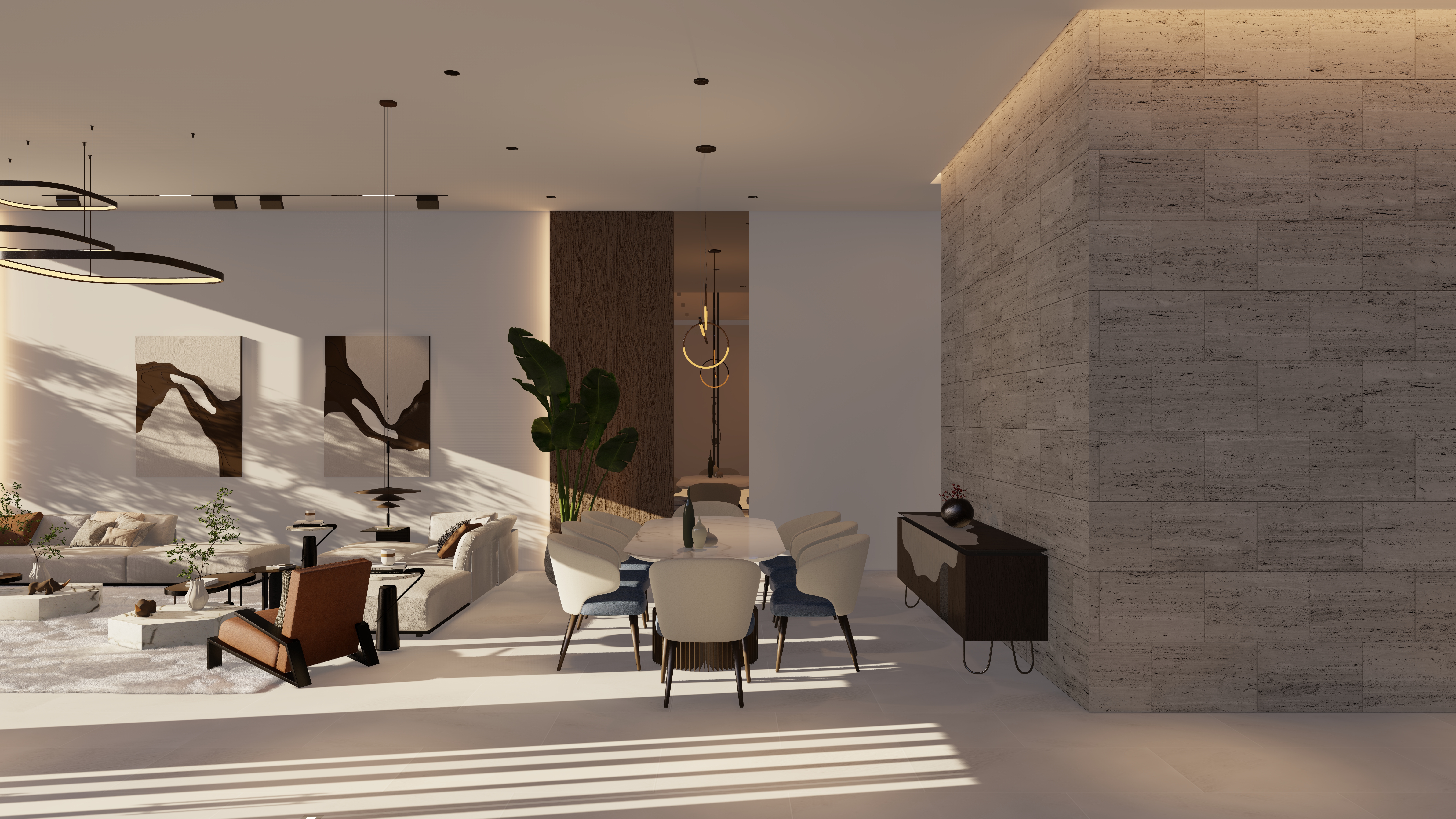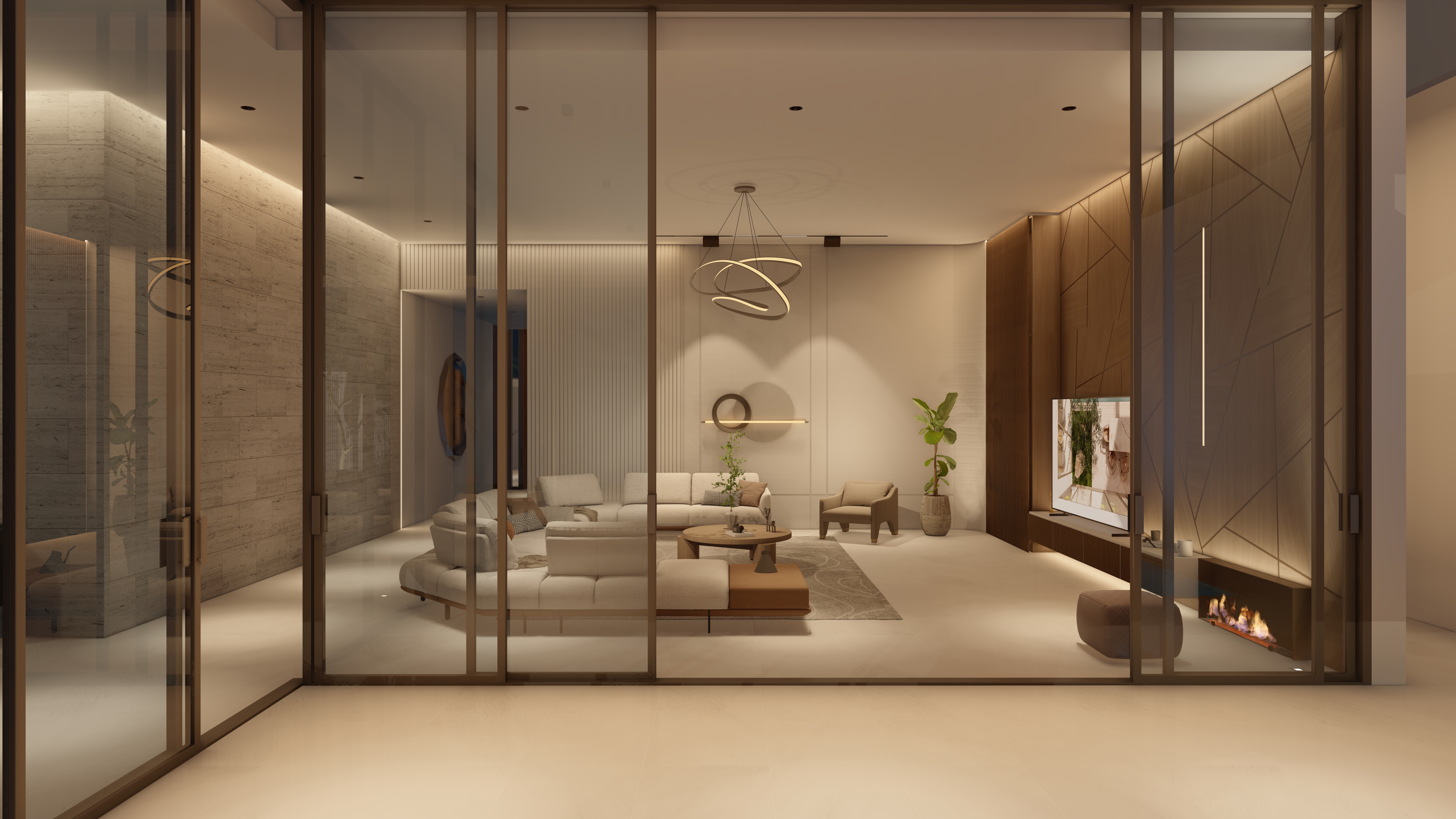 Located 100 km from the city center, this chalet is envisioned as a calm retreat that blurs the boundaries between built form and nature. The design emphasizes seamless integration of architecture and landscape, with expansive glazing, open courtyards, and fluid circulation that draw the sea breeze and natural light deep into the interiors. The entrance opens directly to a framed view of the sea, offering an immediate connection between arrival and the horizon beyond.