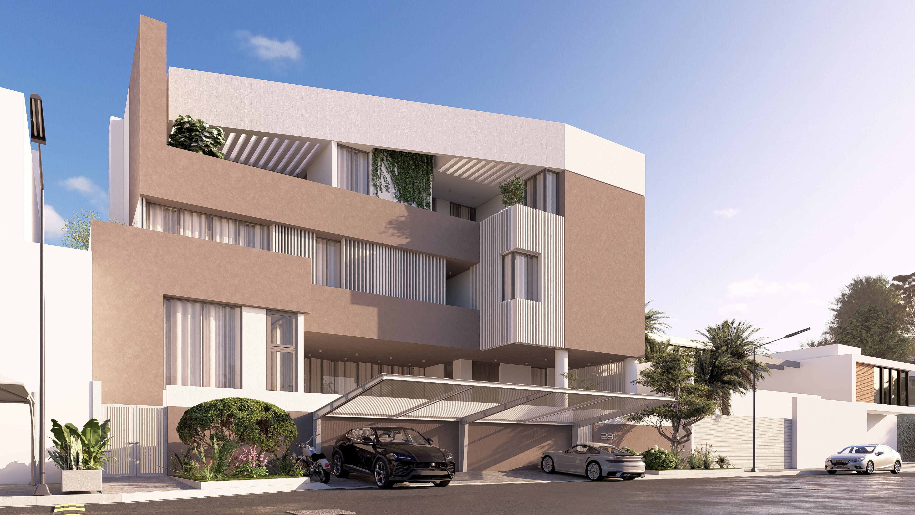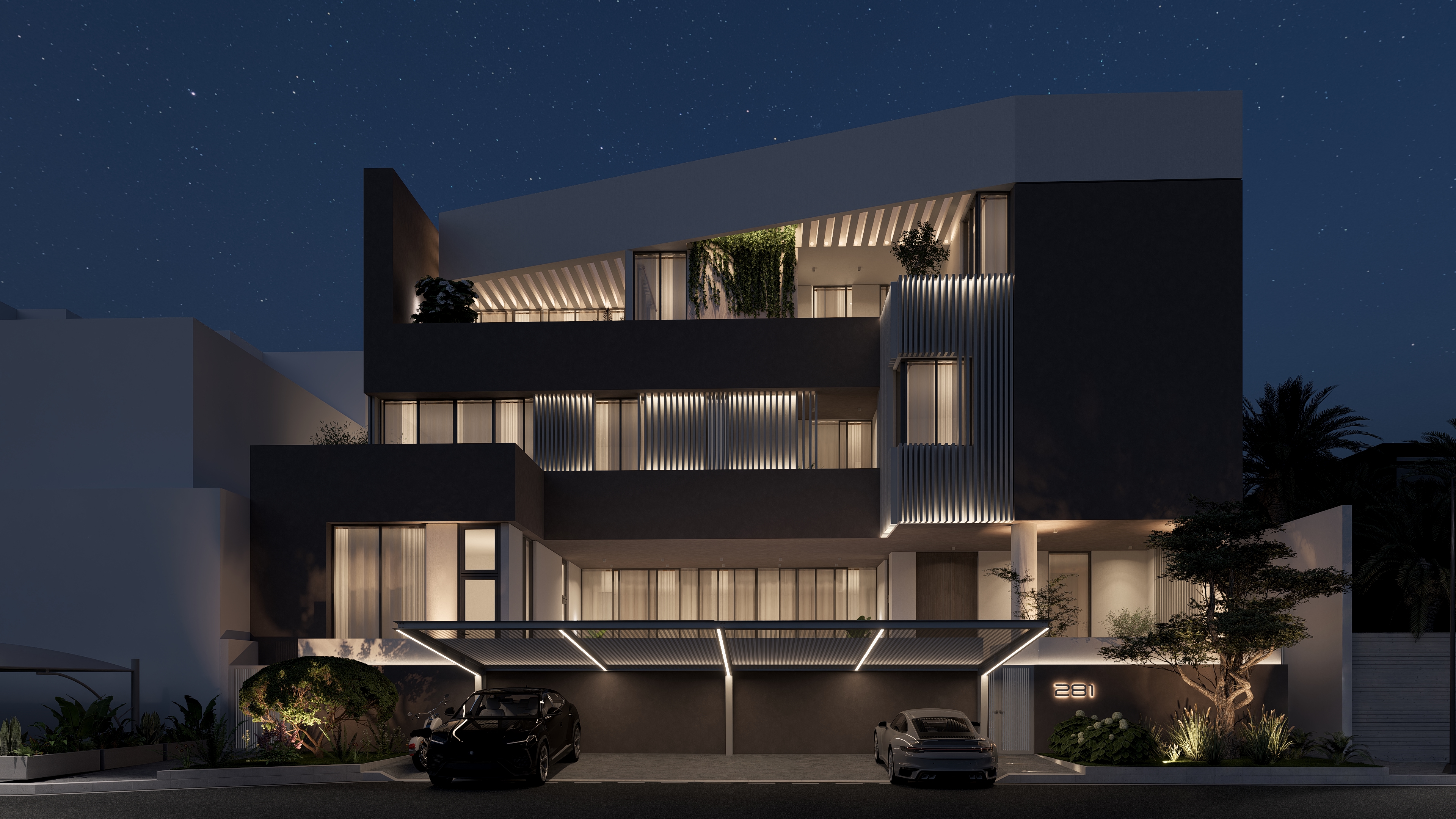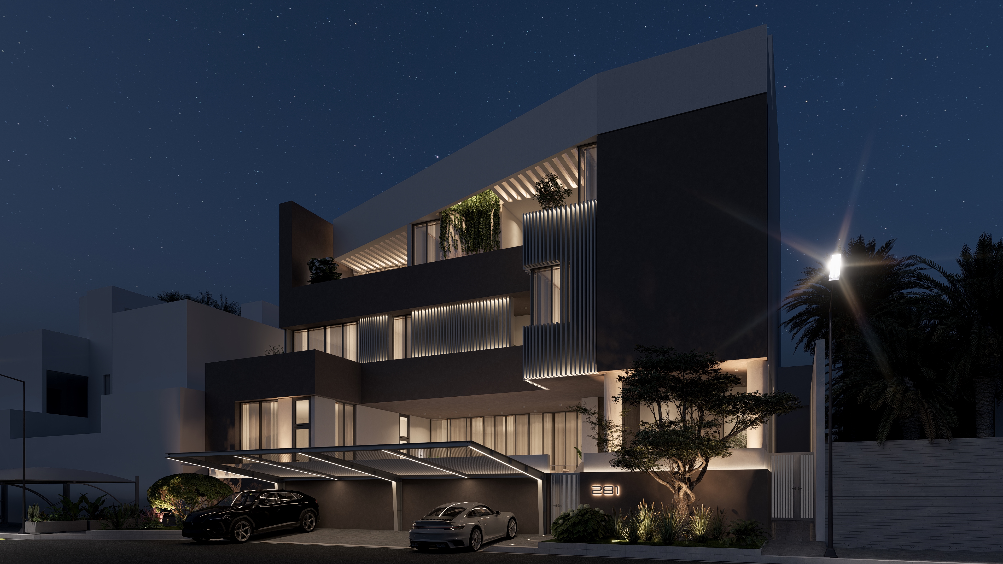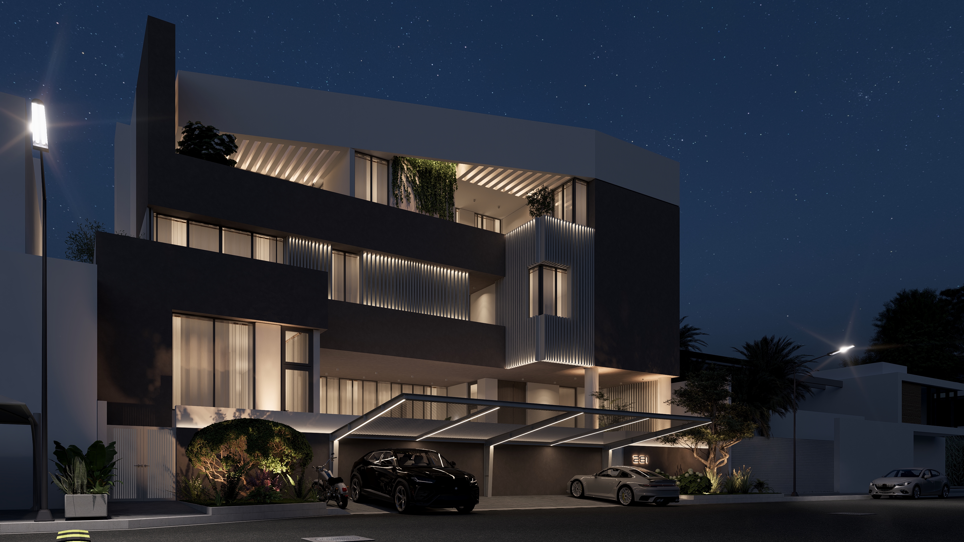 Located on a generous 500 sqm corner plot in the prestigious residential district of Khaldiya, Kuwait, this four-storey family home has been carefully designed to respect traditional Kuwaiti values of privacy, hospitality, and multi-generational living while embracing a clean, modern architectural language.