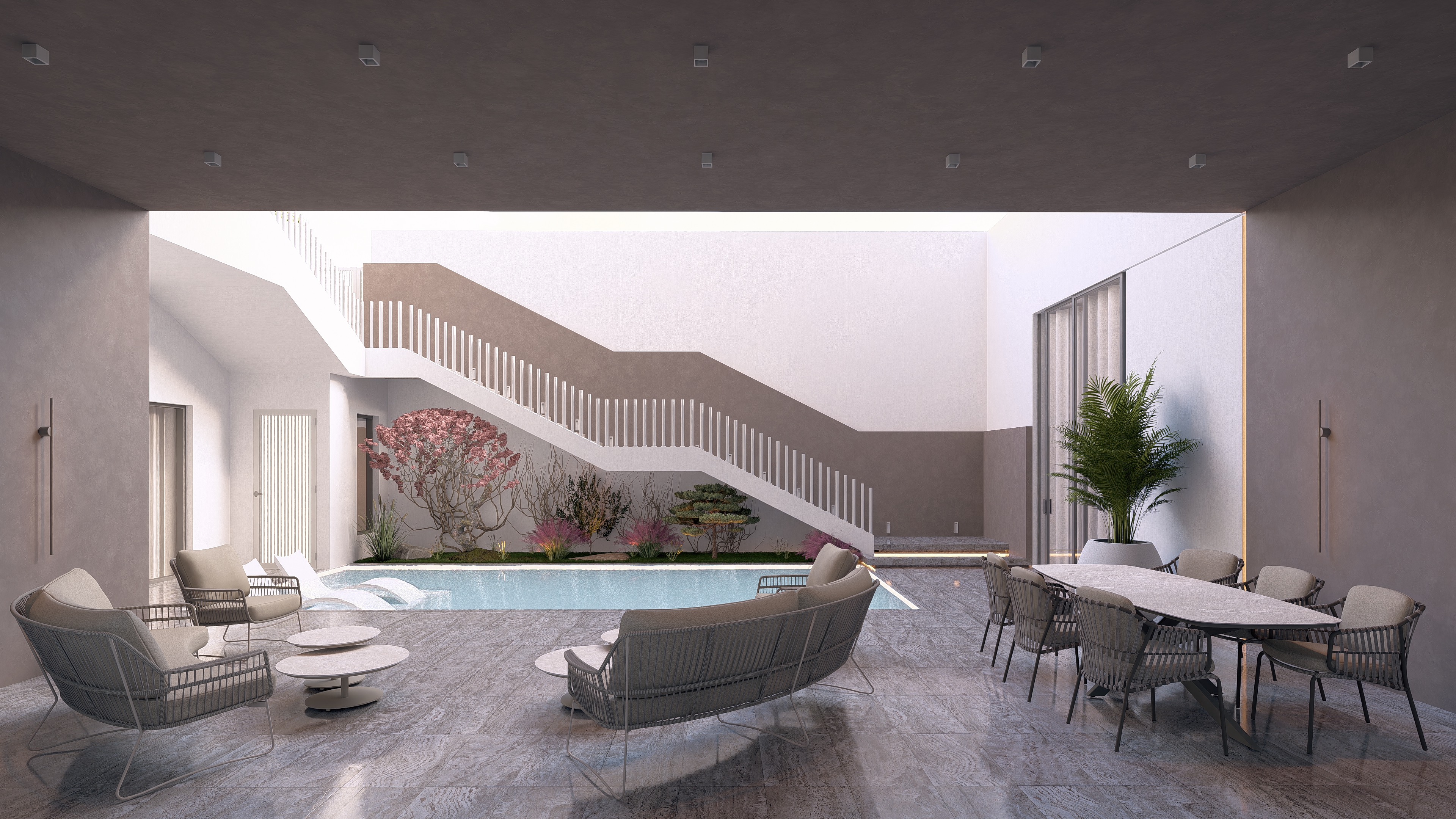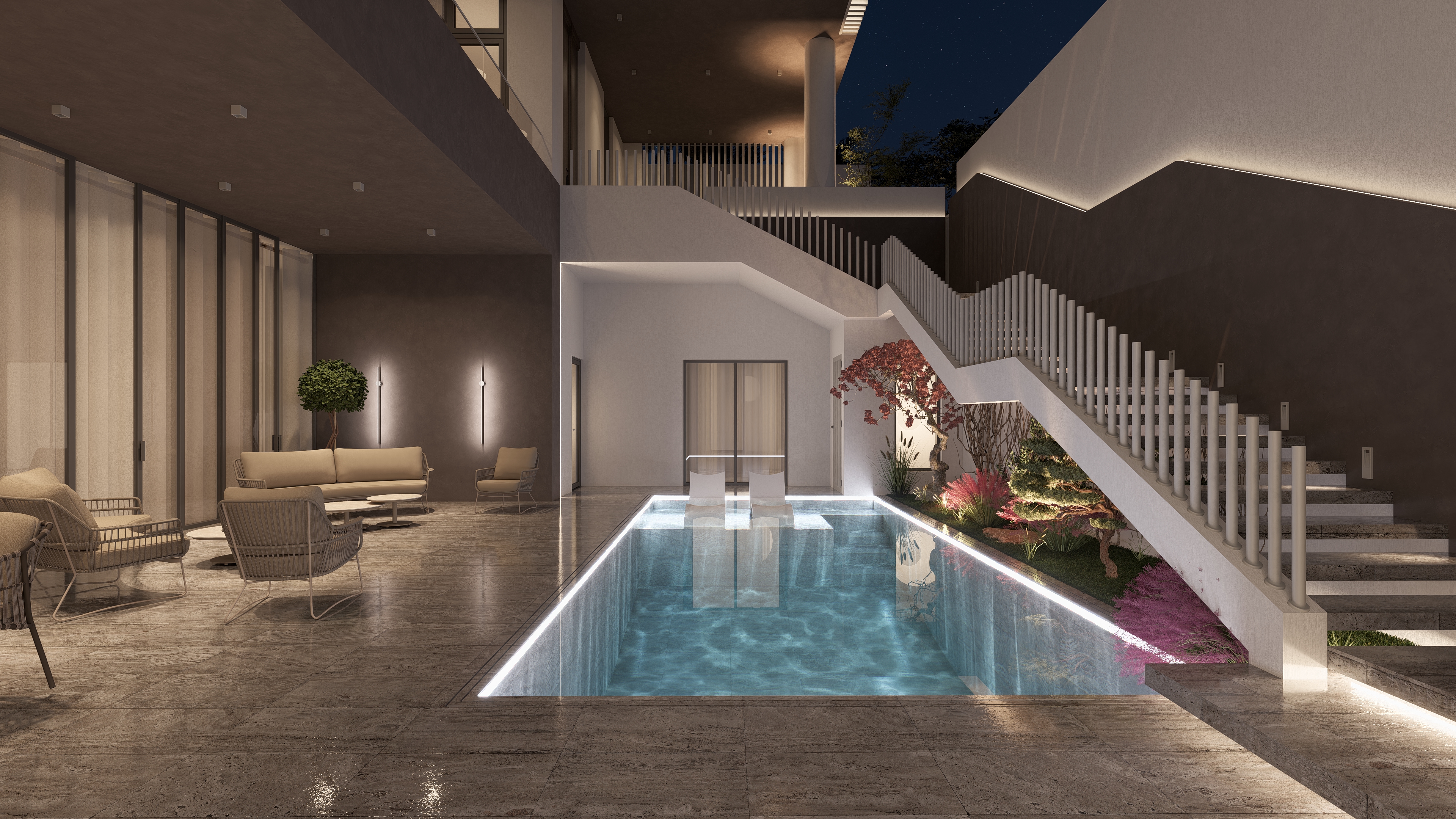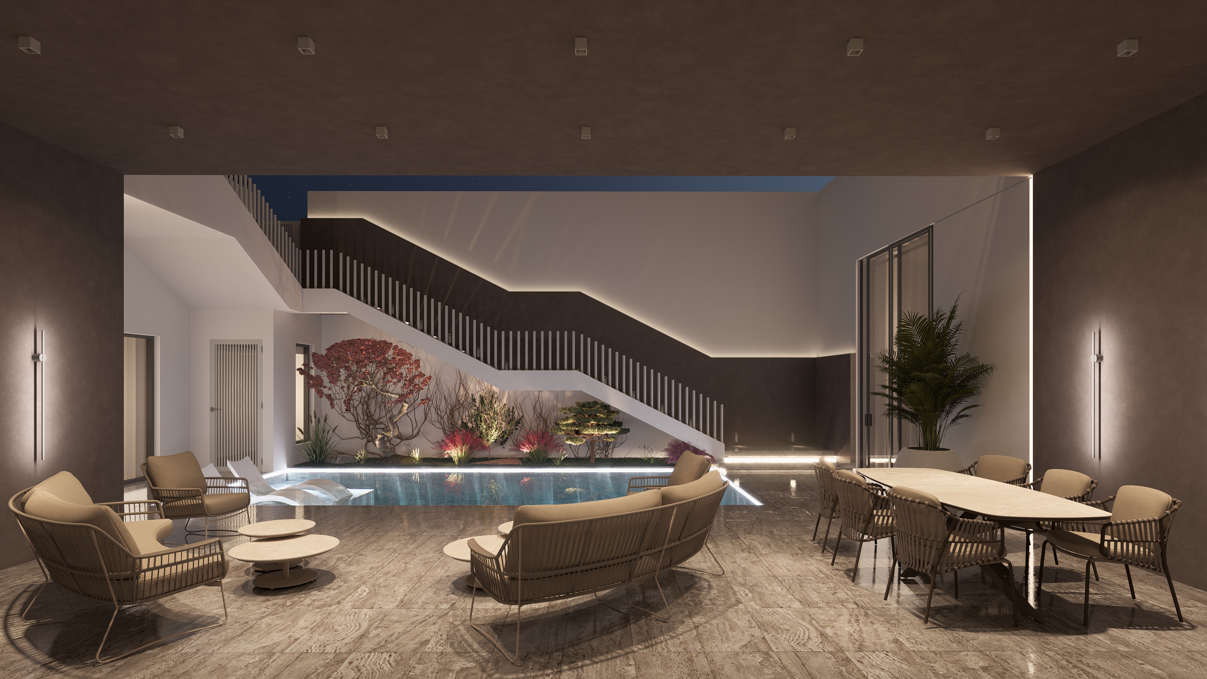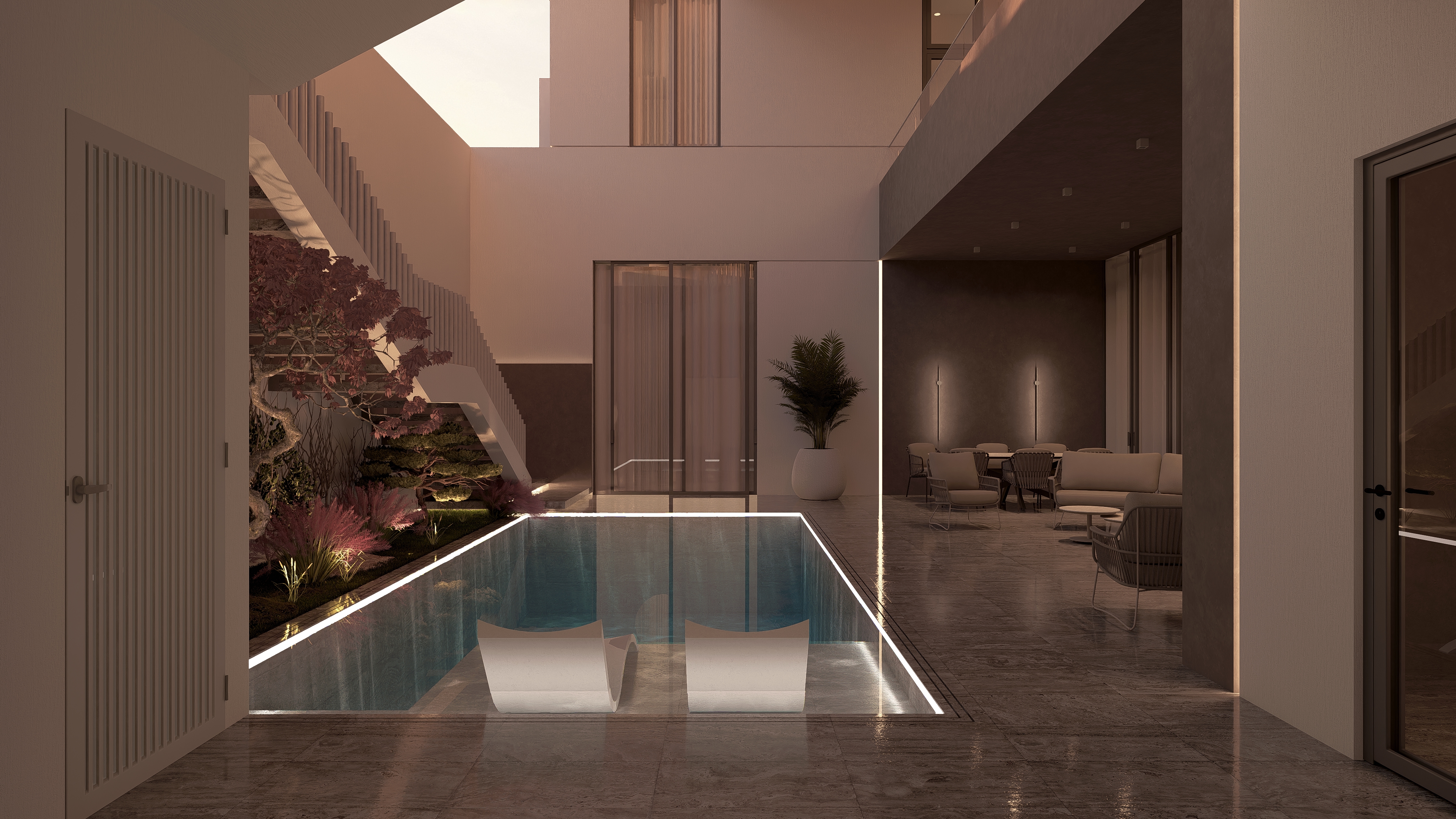 A calm sunken space where water, light, and clean modern lines create a refined, atmospheric retreat.
