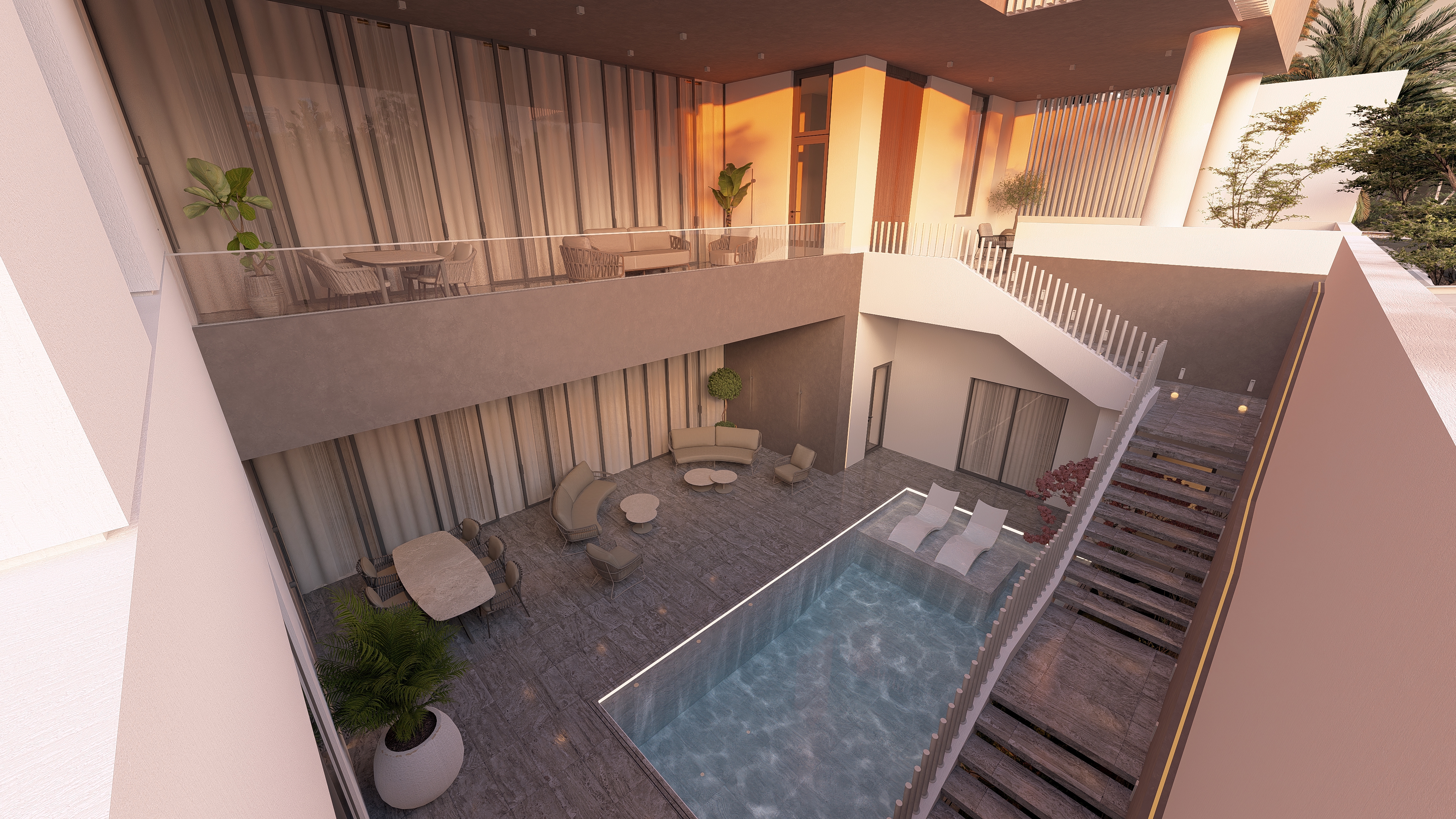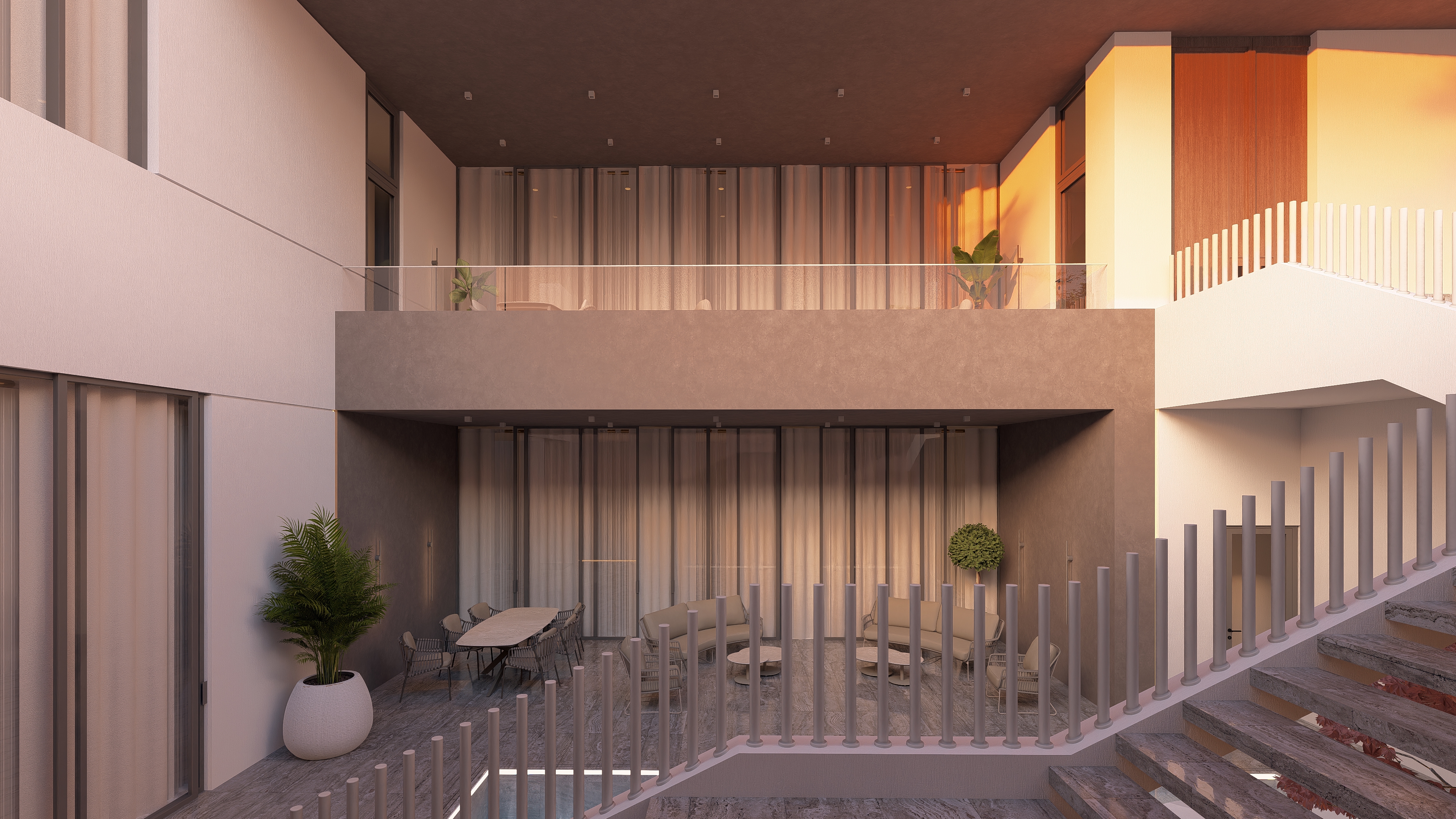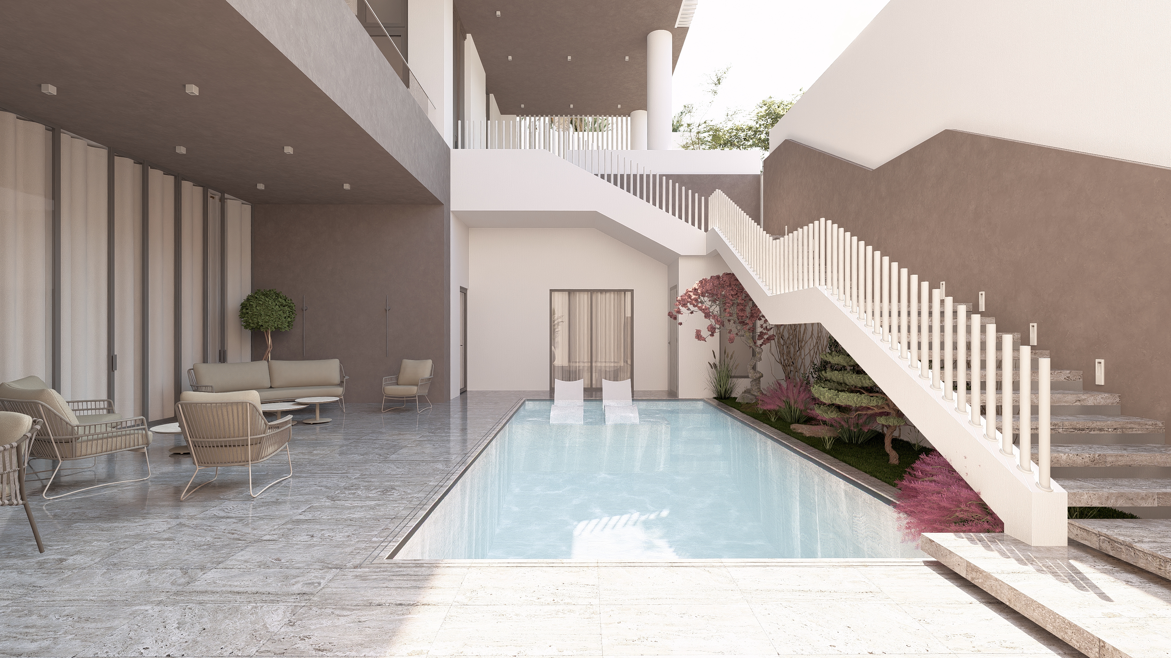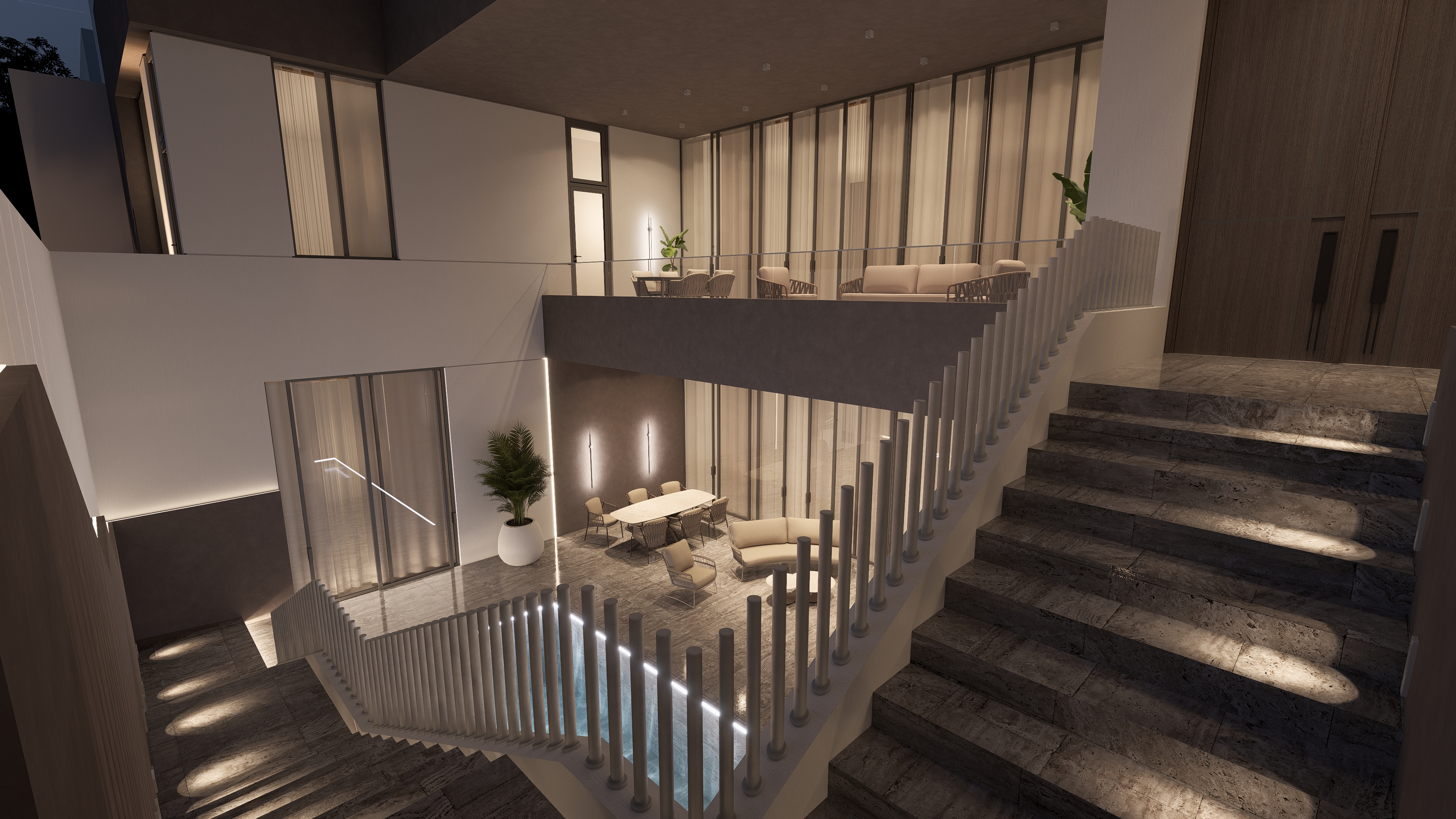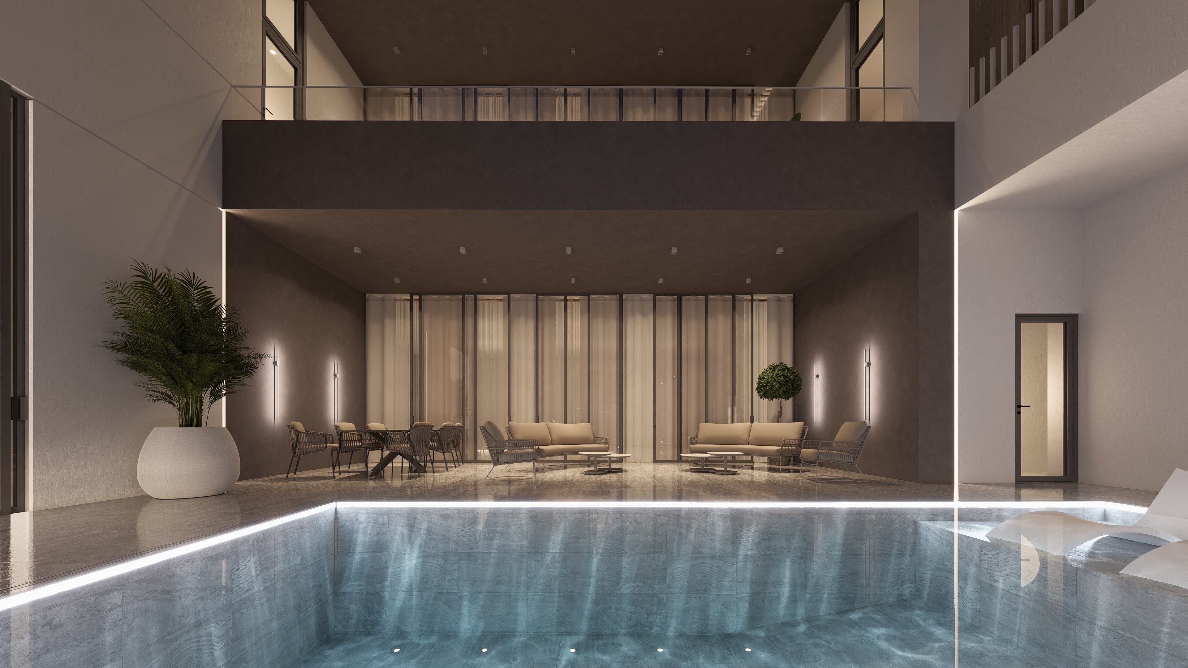 A calm sunken space where water, light, and clean modern lines create a refined, atmospheric retreat.