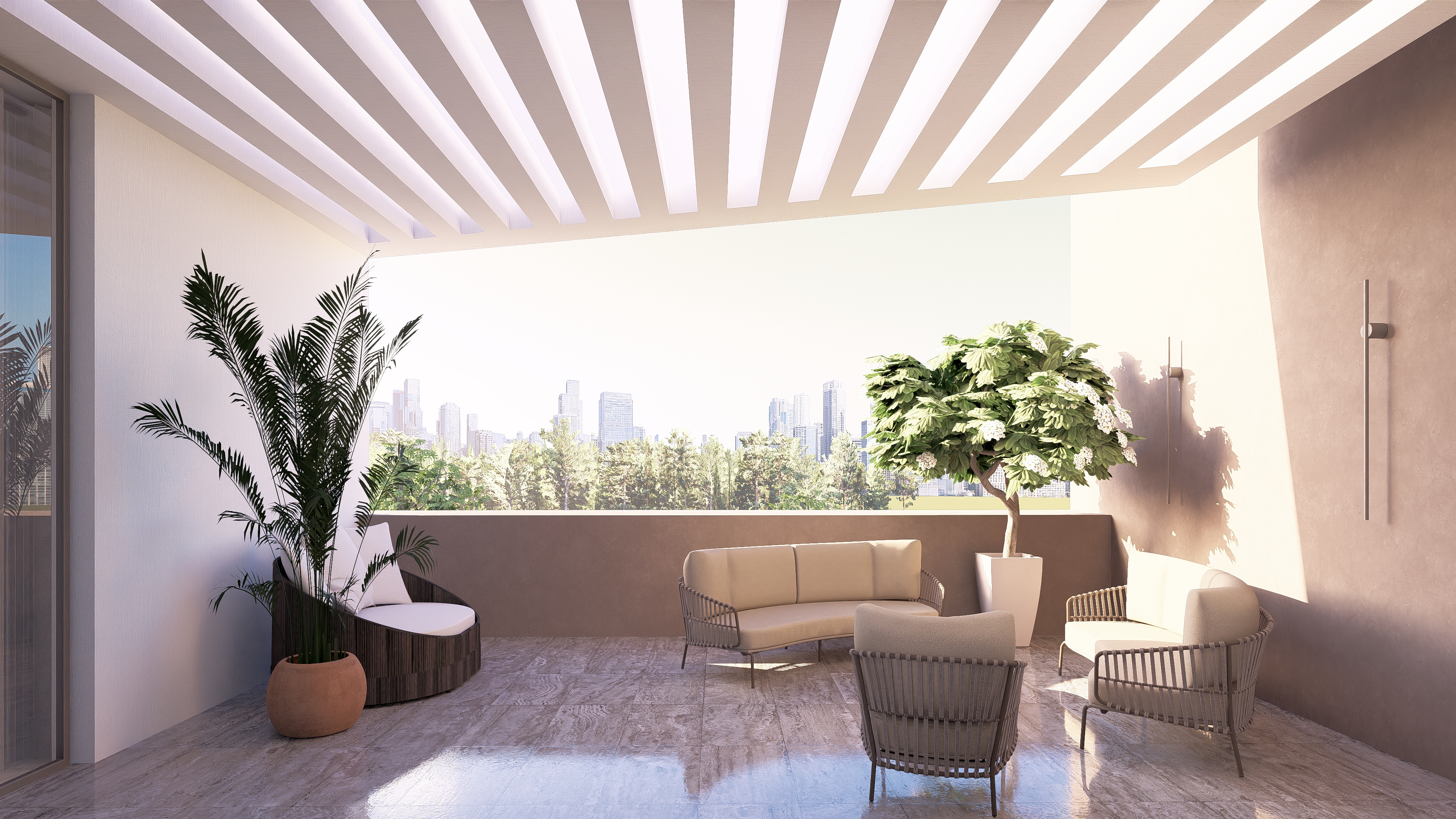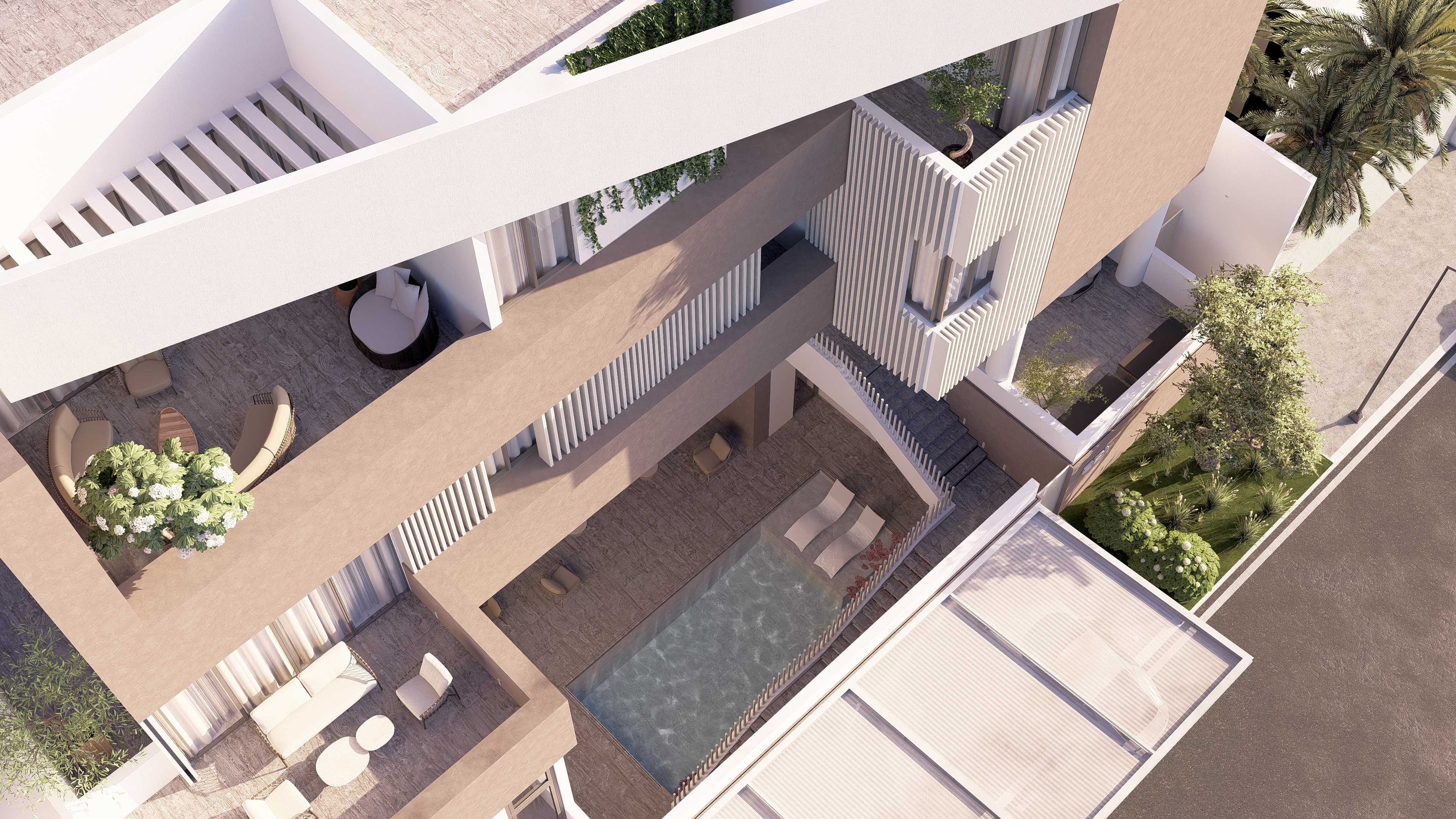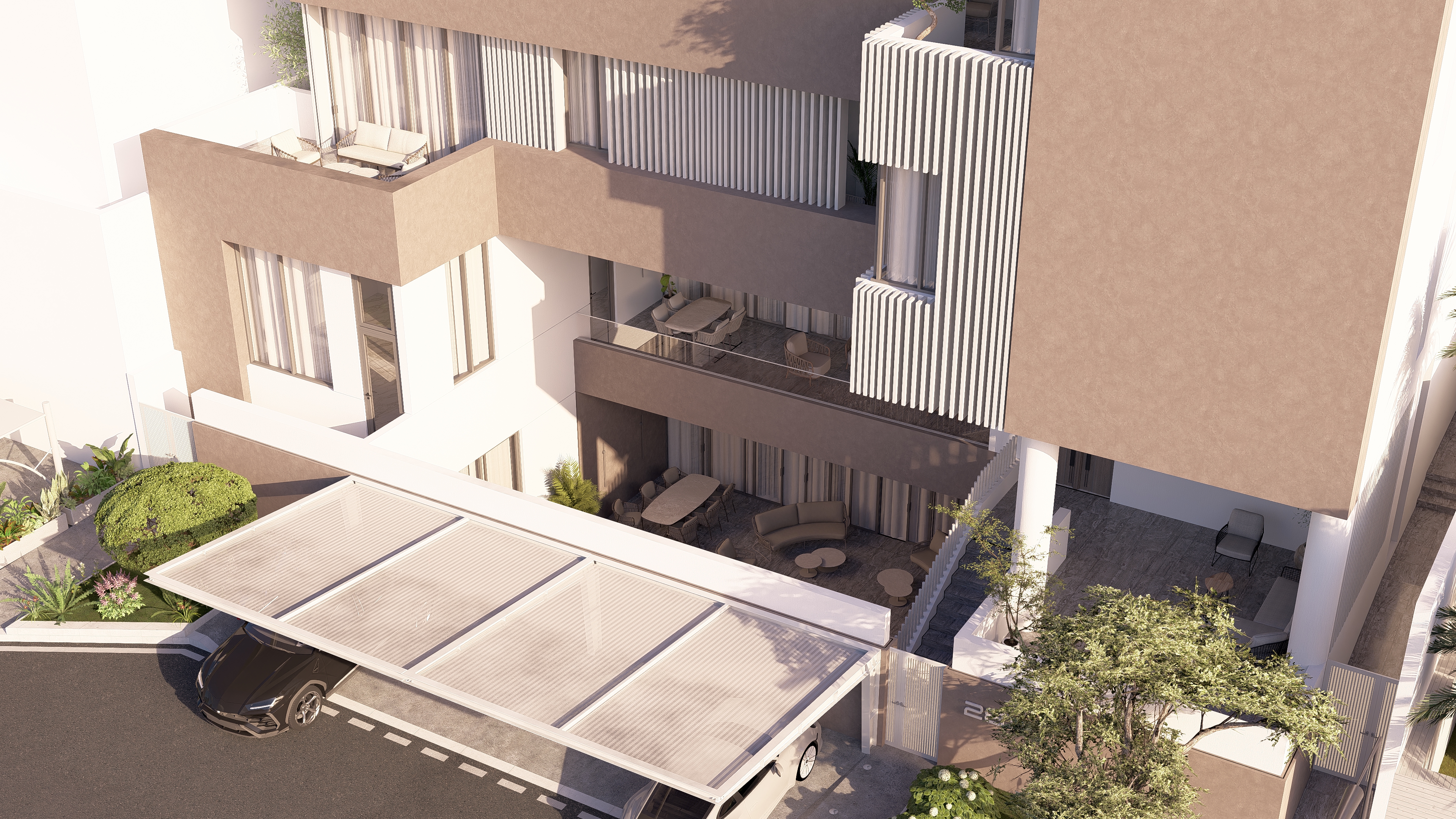 The first floor splits into an independent apartment for the eldest son and two luxurious master suites for the daughters sharing a small lobby and terrace, while the second floor is reserved for the parents and two younger children – each child with their own master bedroom – and an expansive parental suite occupying over half the floor, featuring a large bedroom, separate his-and-hers dressing rooms and bathrooms, private living room and a generous terrace shaded by an elegant pergola.
