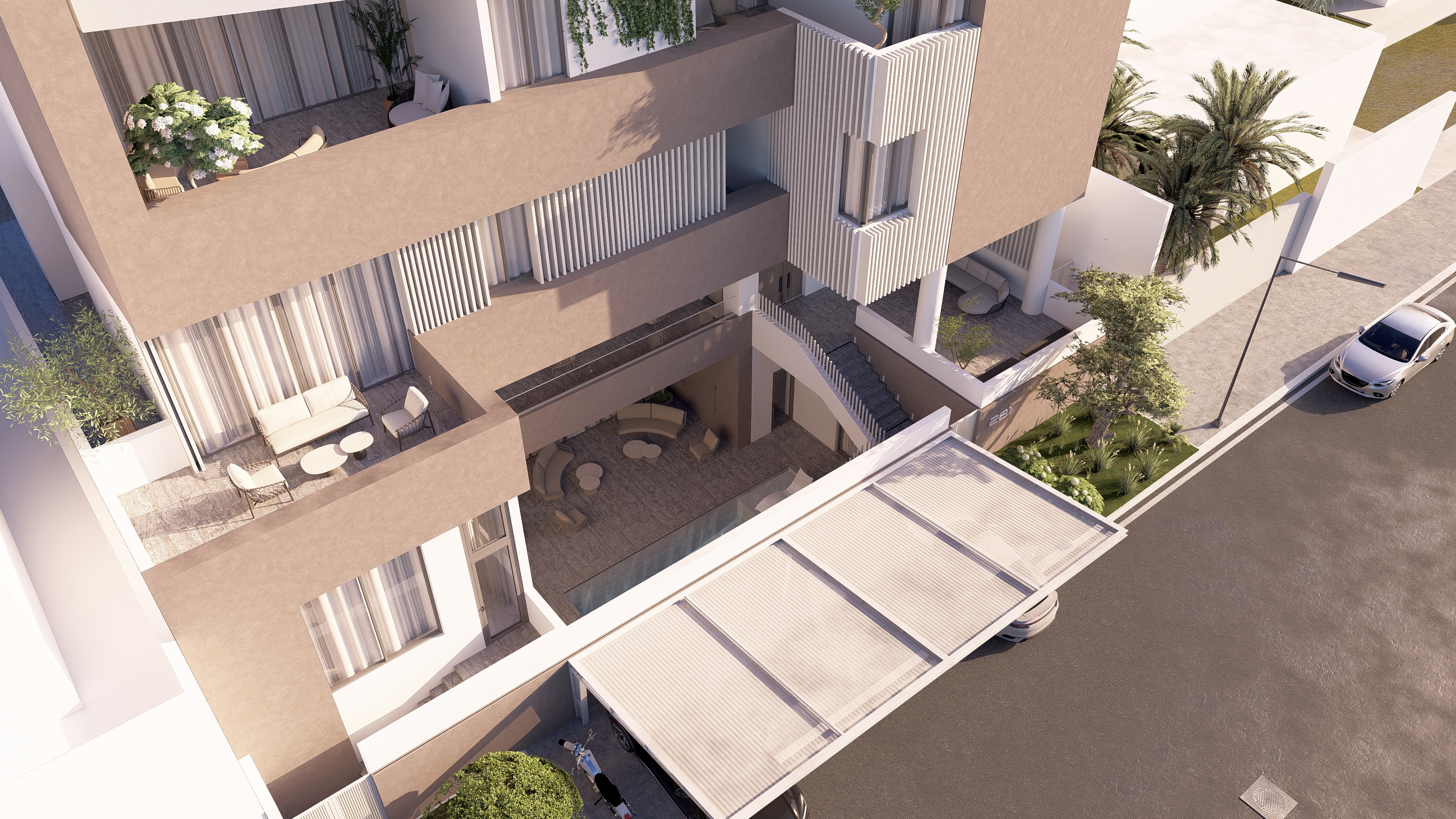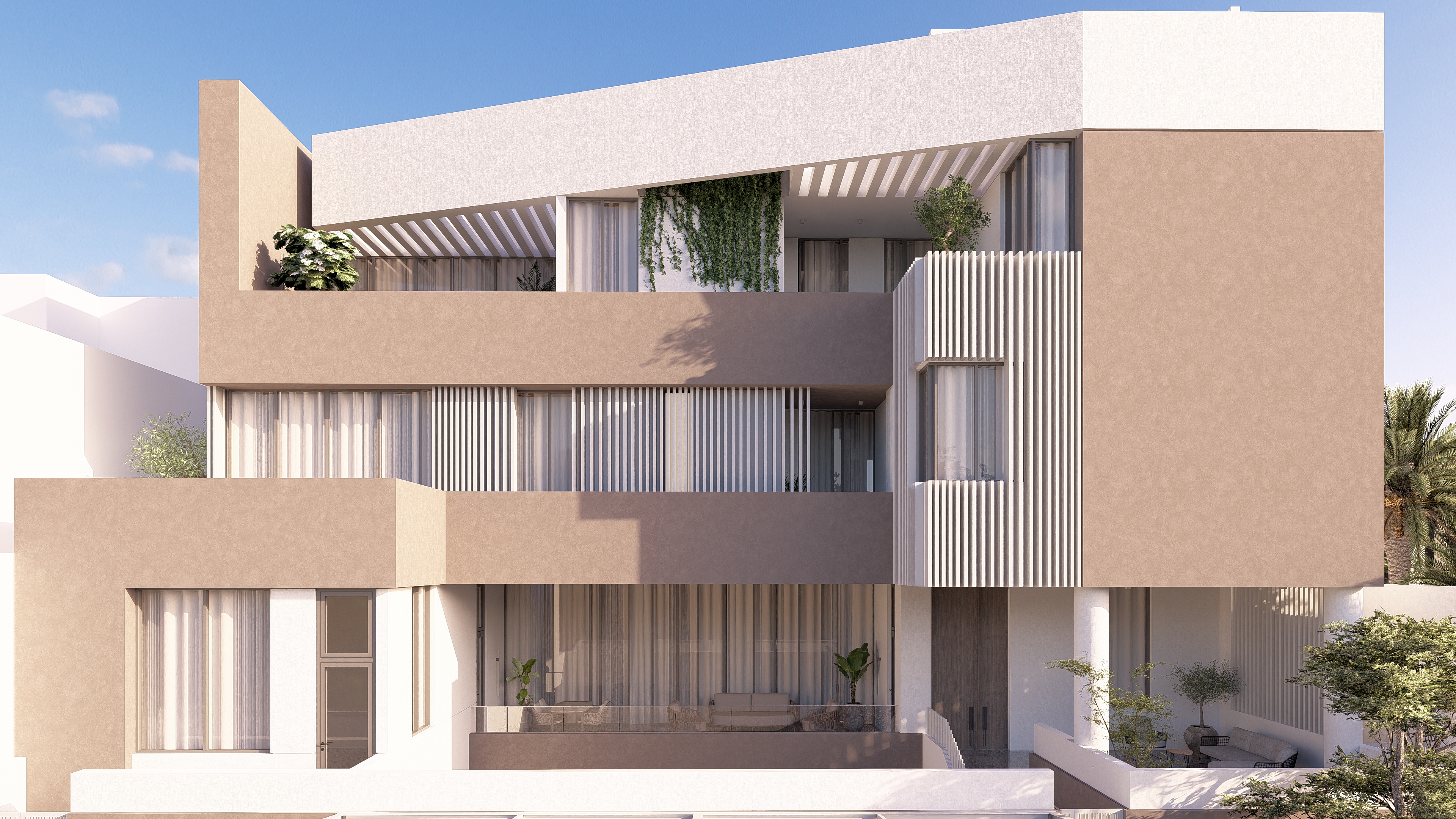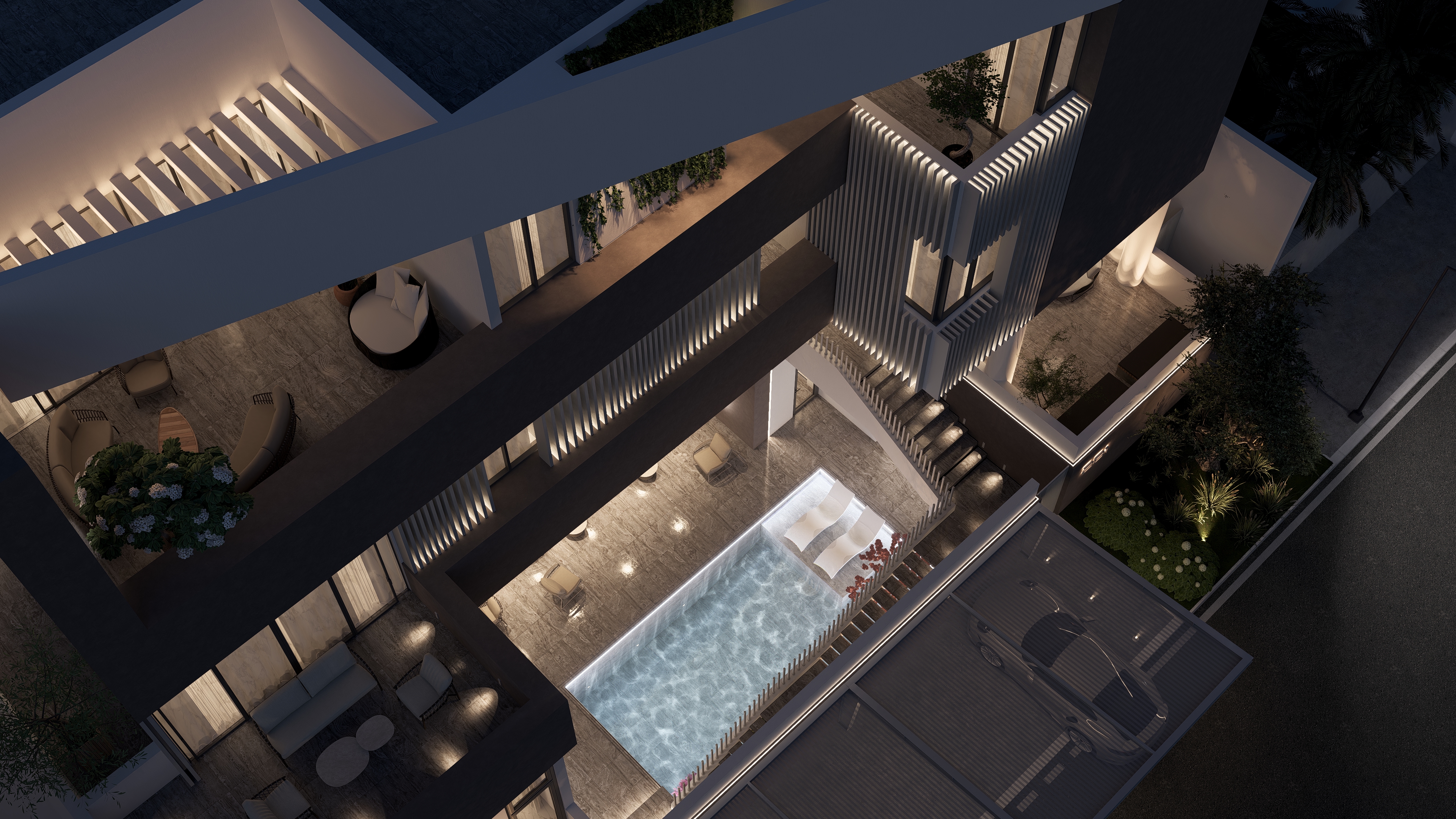 The first floor splits into an independent apartment for the eldest son and two luxurious master suites for the daughters sharing a small lobby and terrace, while the second floor is reserved for the parents and two younger children – each child with their own master bedroom – and an expansive parental suite occupying over half the floor, featuring a large bedroom, separate his-and-hers dressing rooms and bathrooms, private living room and a generous terrace shaded by an elegant pergola.