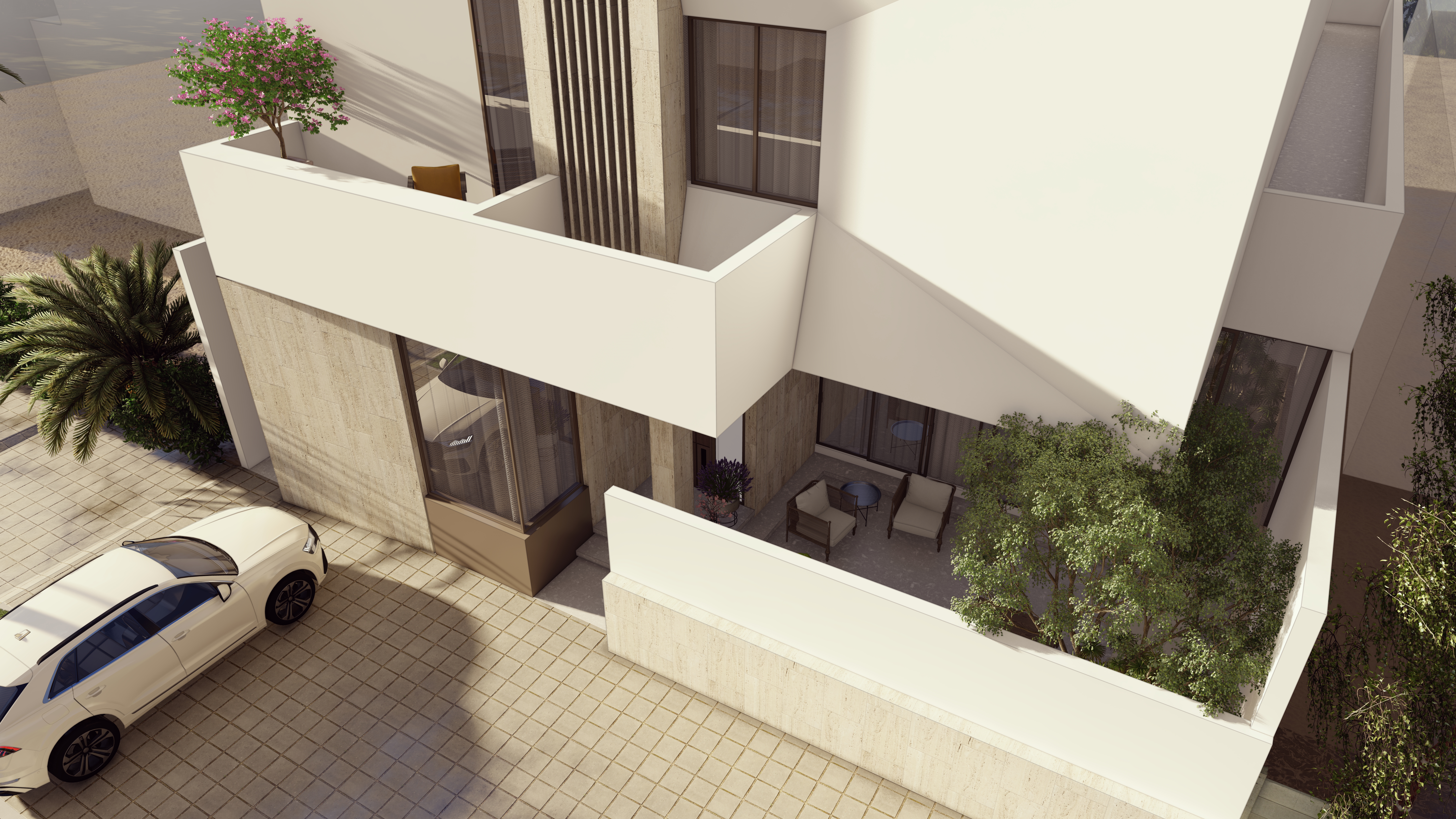 A private forecourt blends light, shadow, and nature at the home’s entry.
