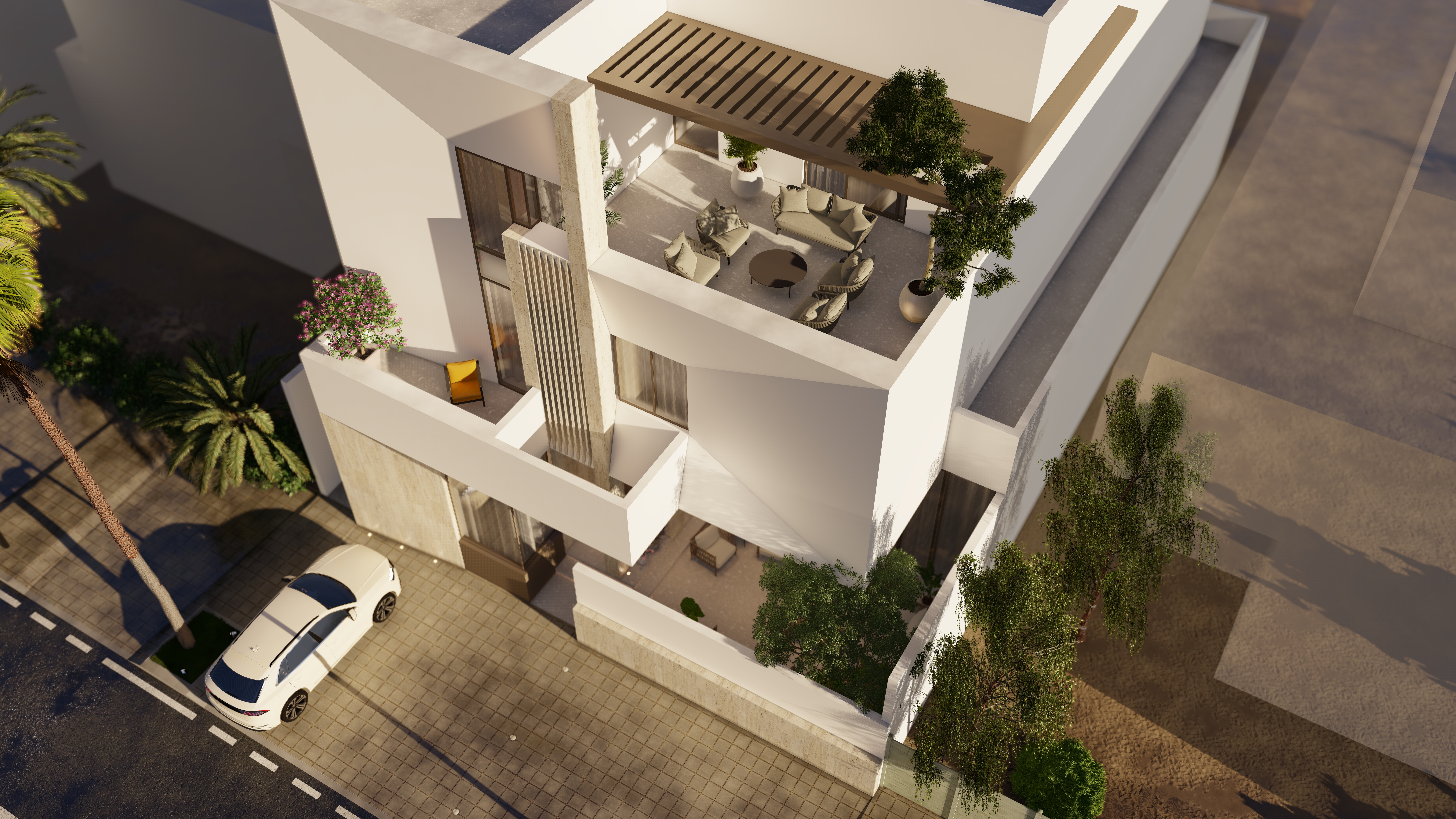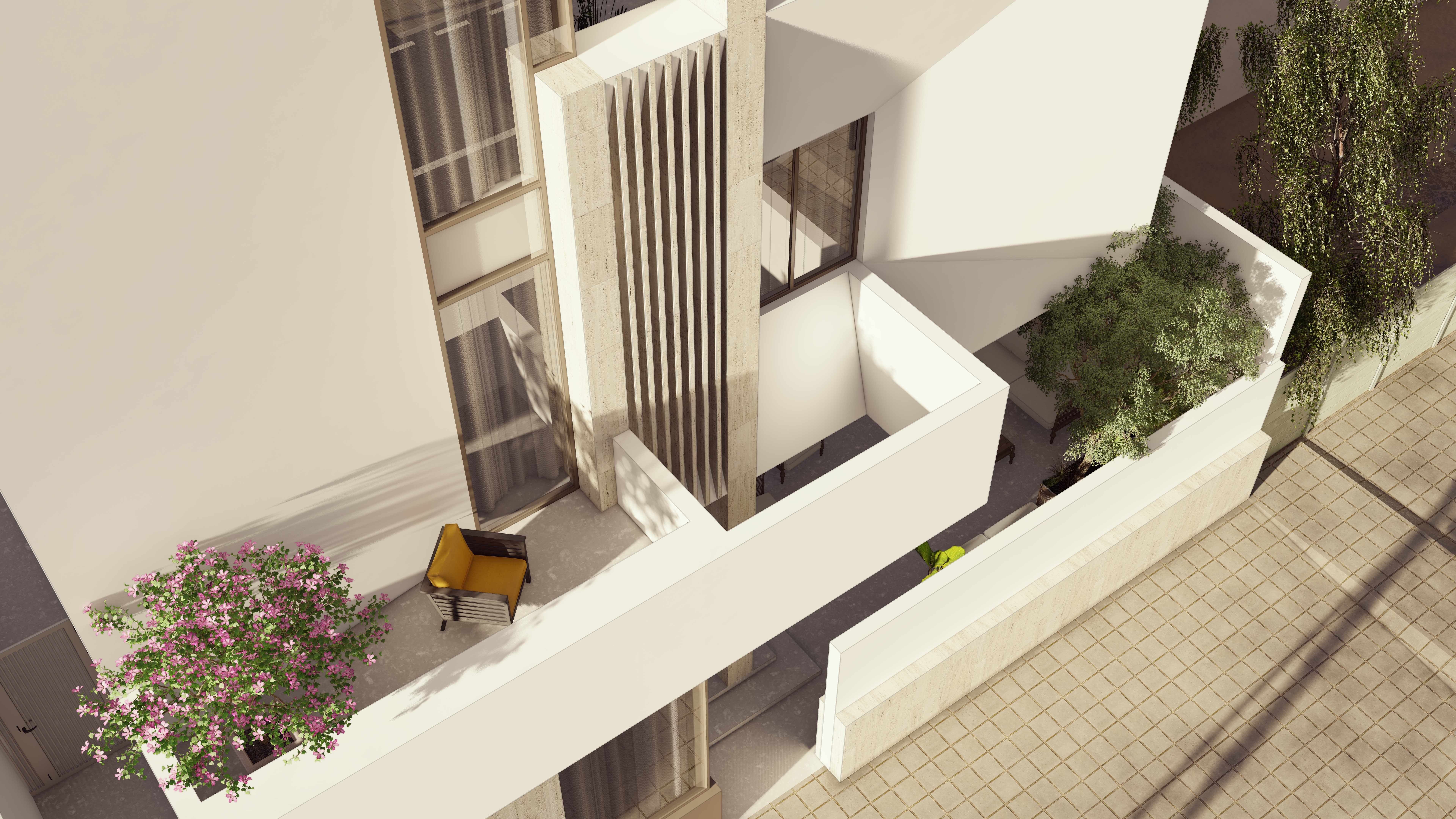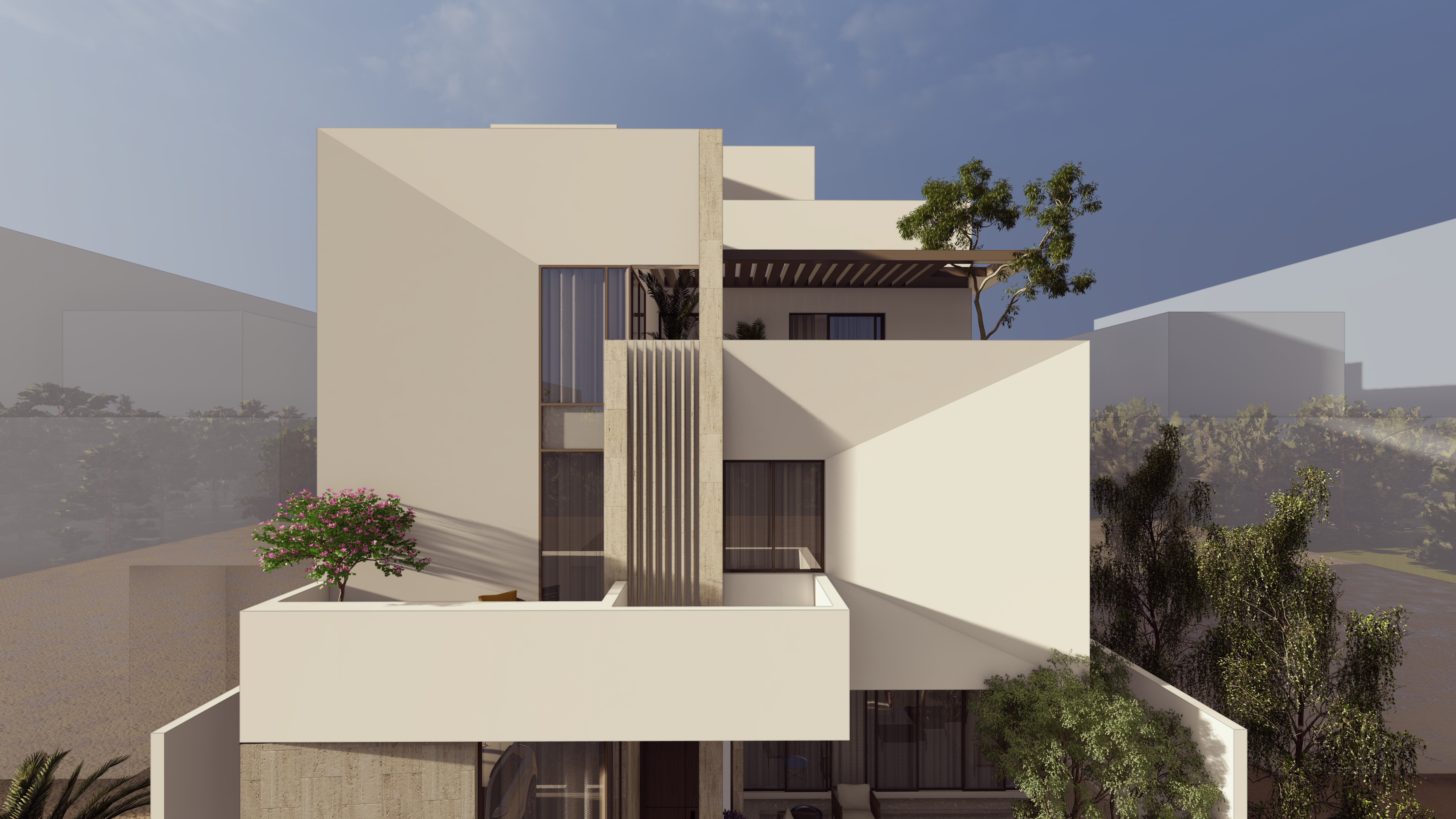 A vertical finned element adds depth, texture, and shadow play to the façade.