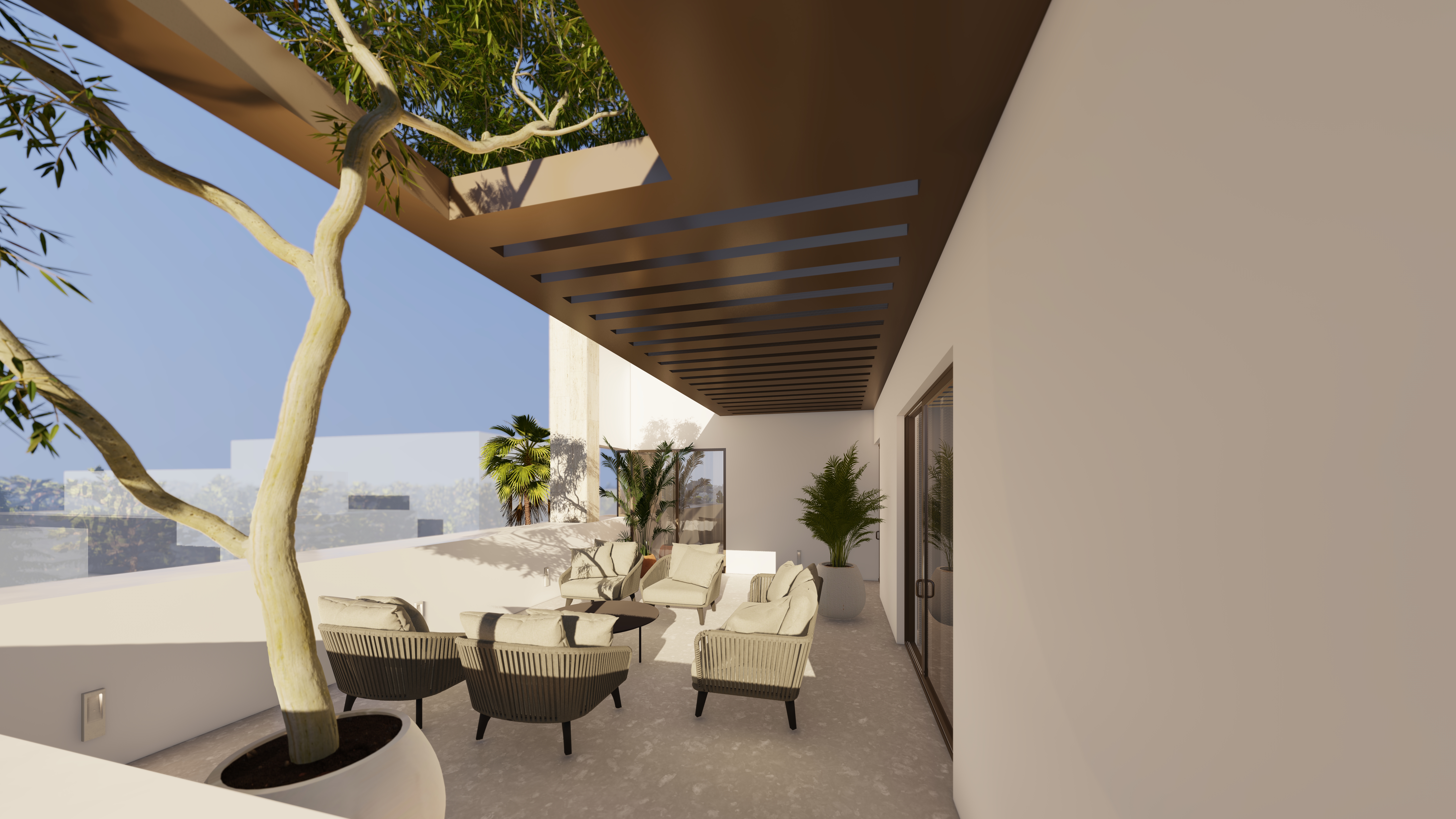 The second floor is dedicated to the main suite, complete with a private terrace and a gym/office overlooking the expansive outdoor area, offering exclusivity and comfort.