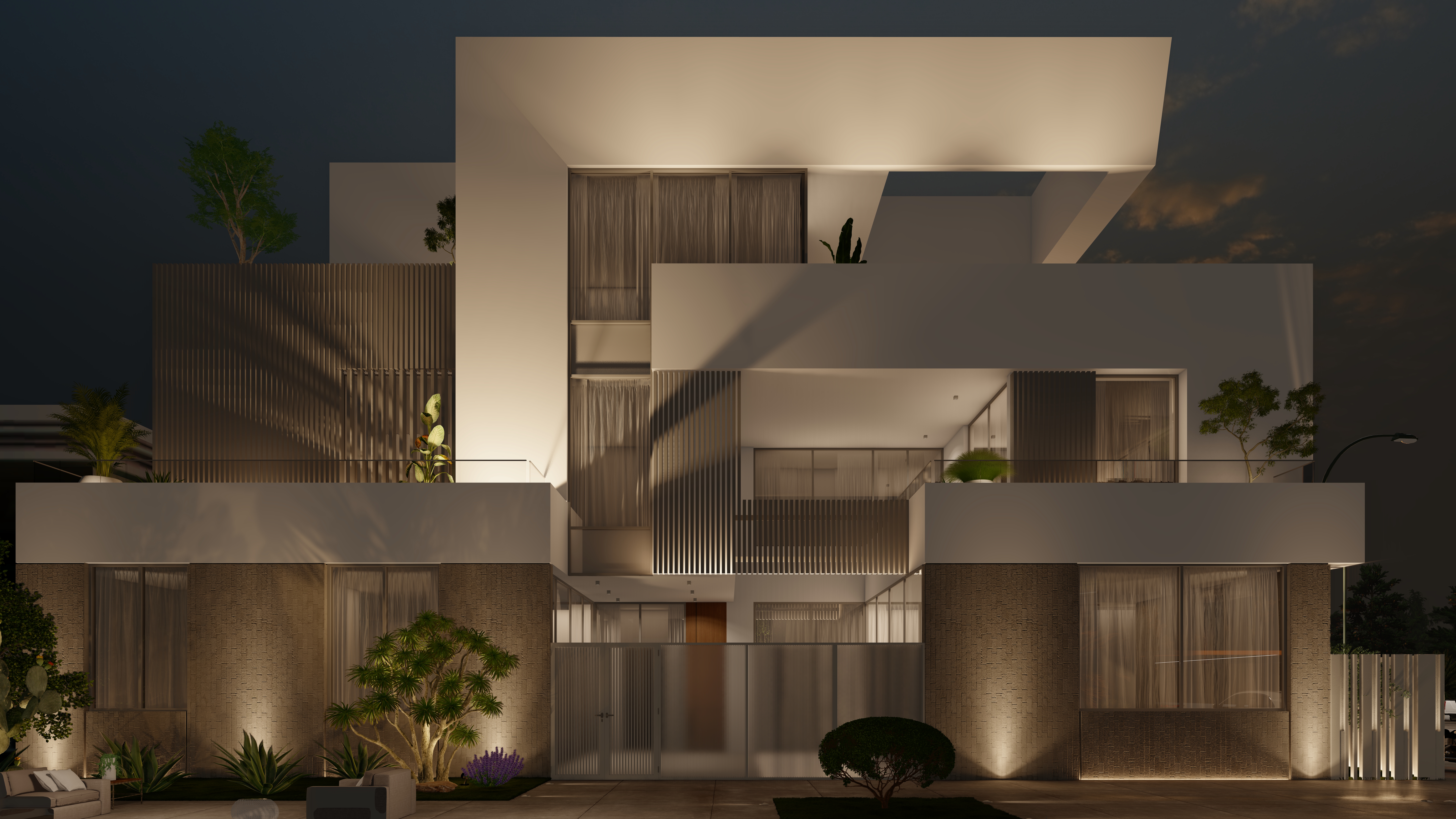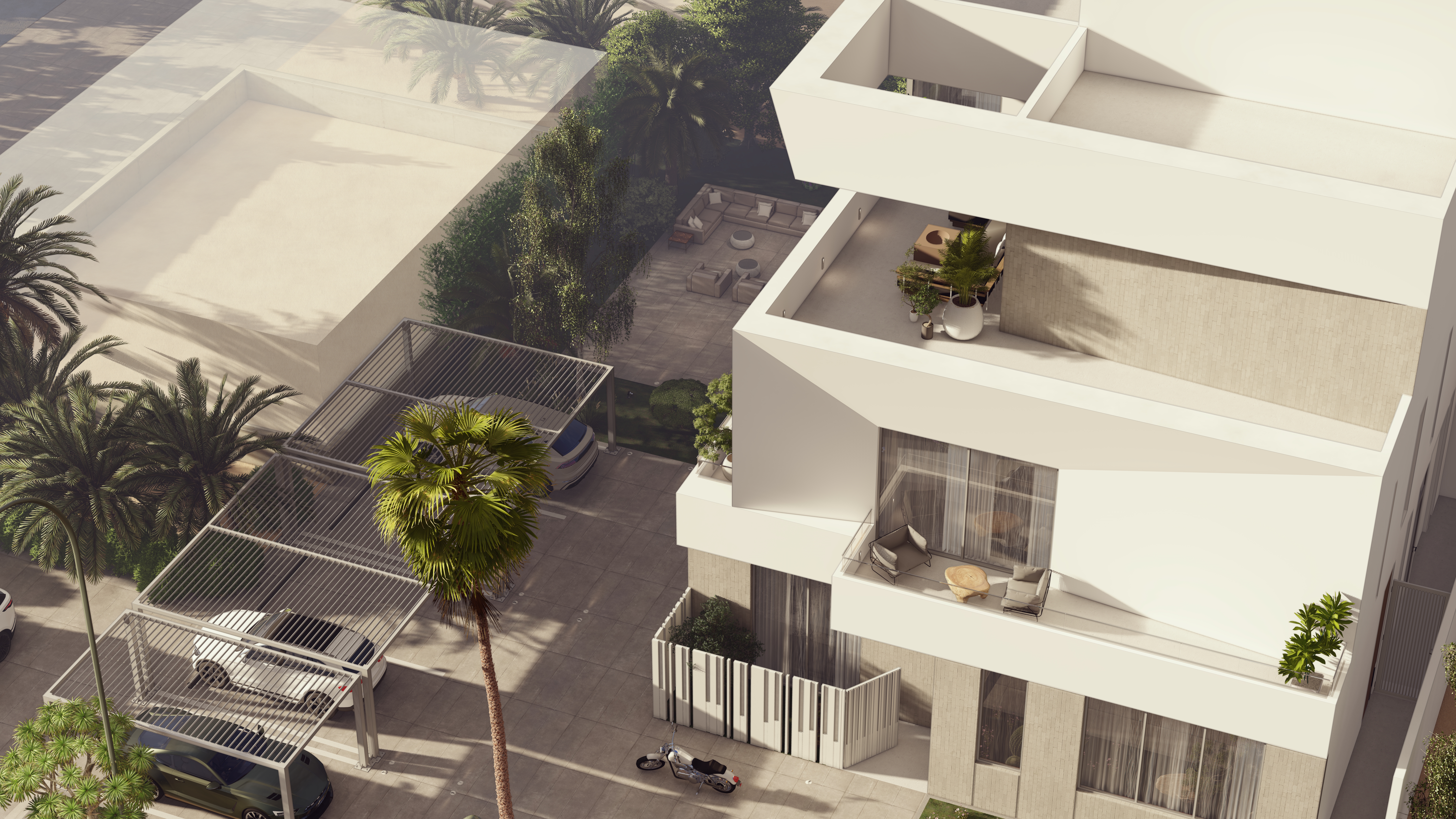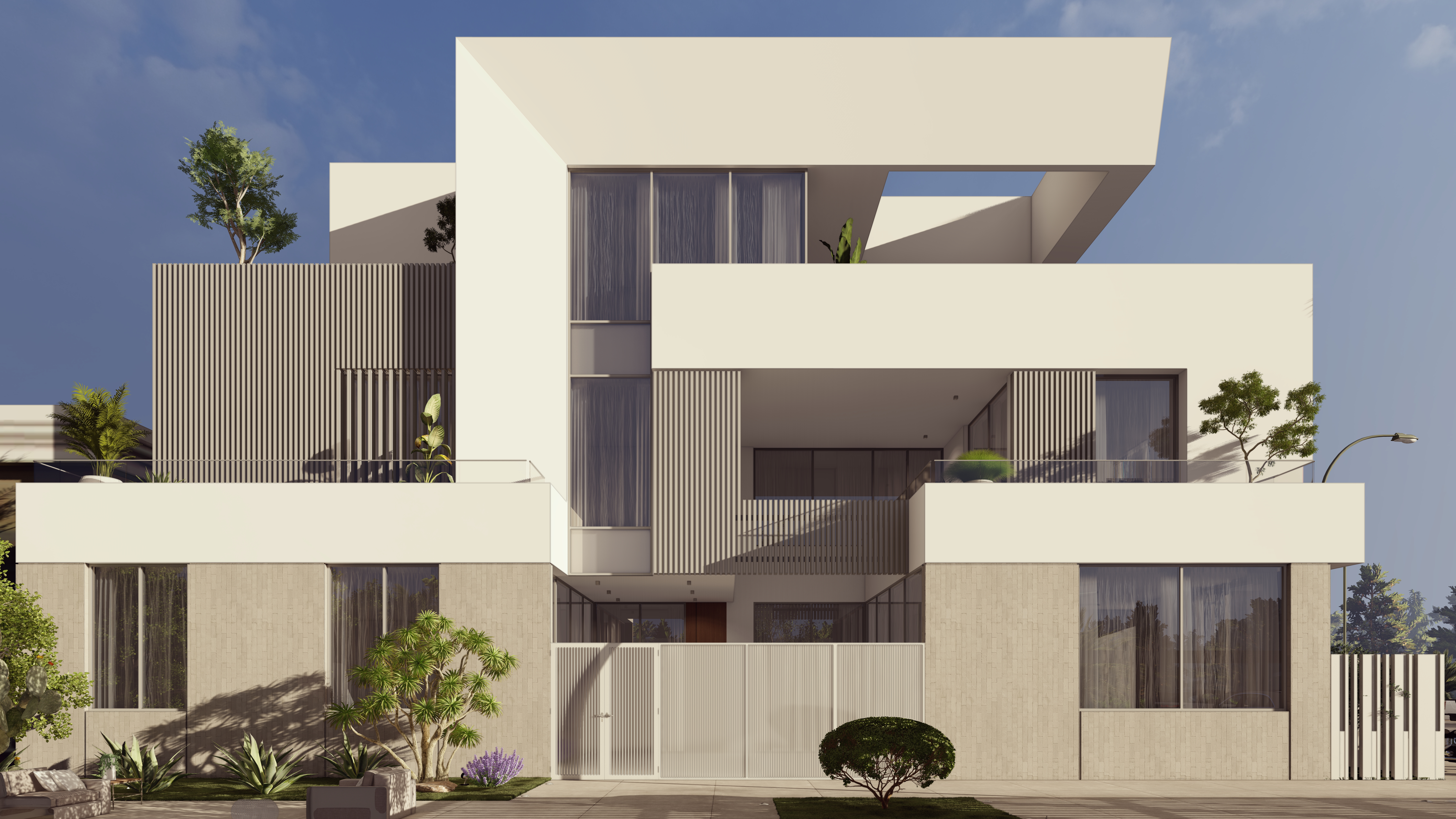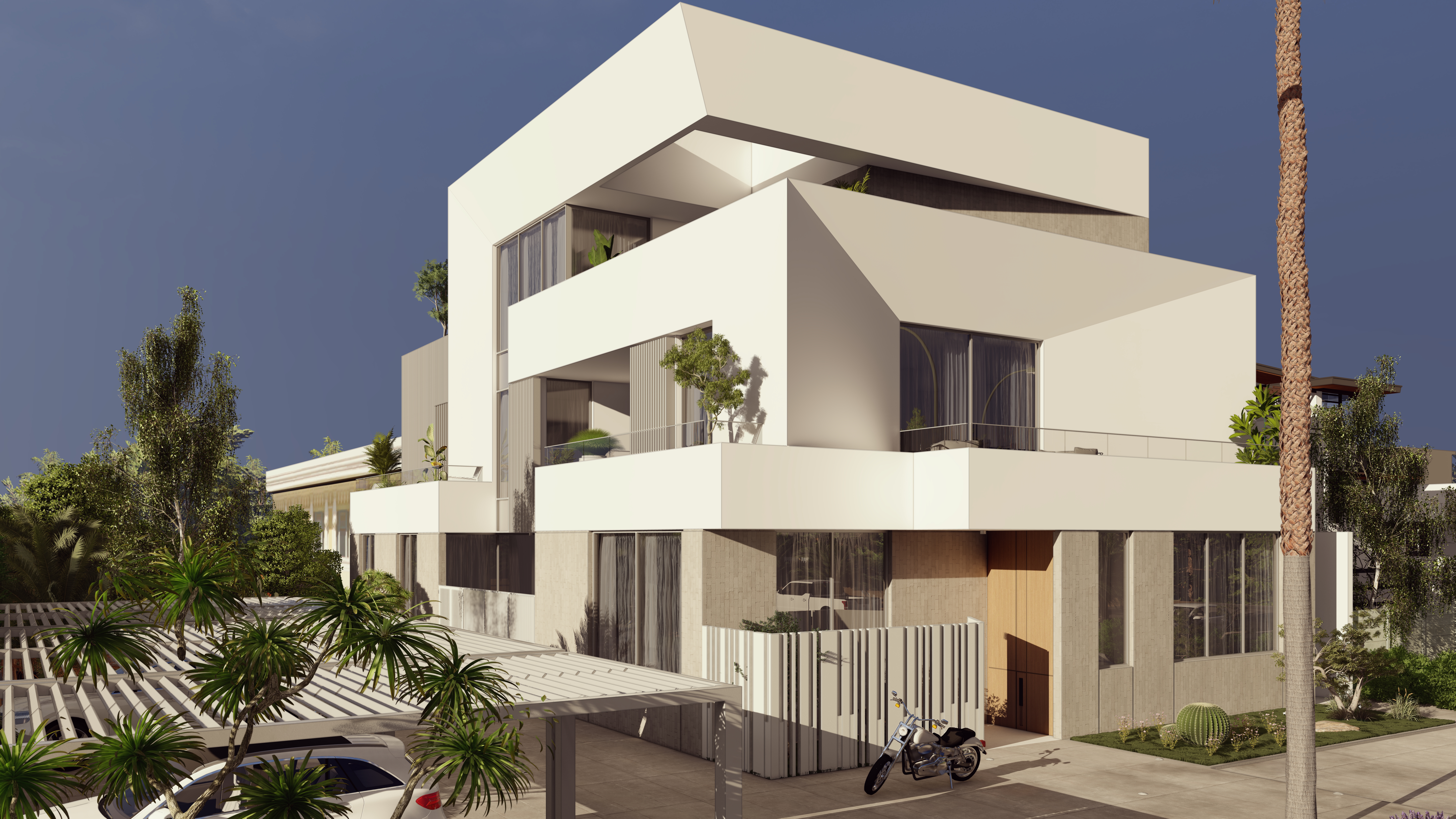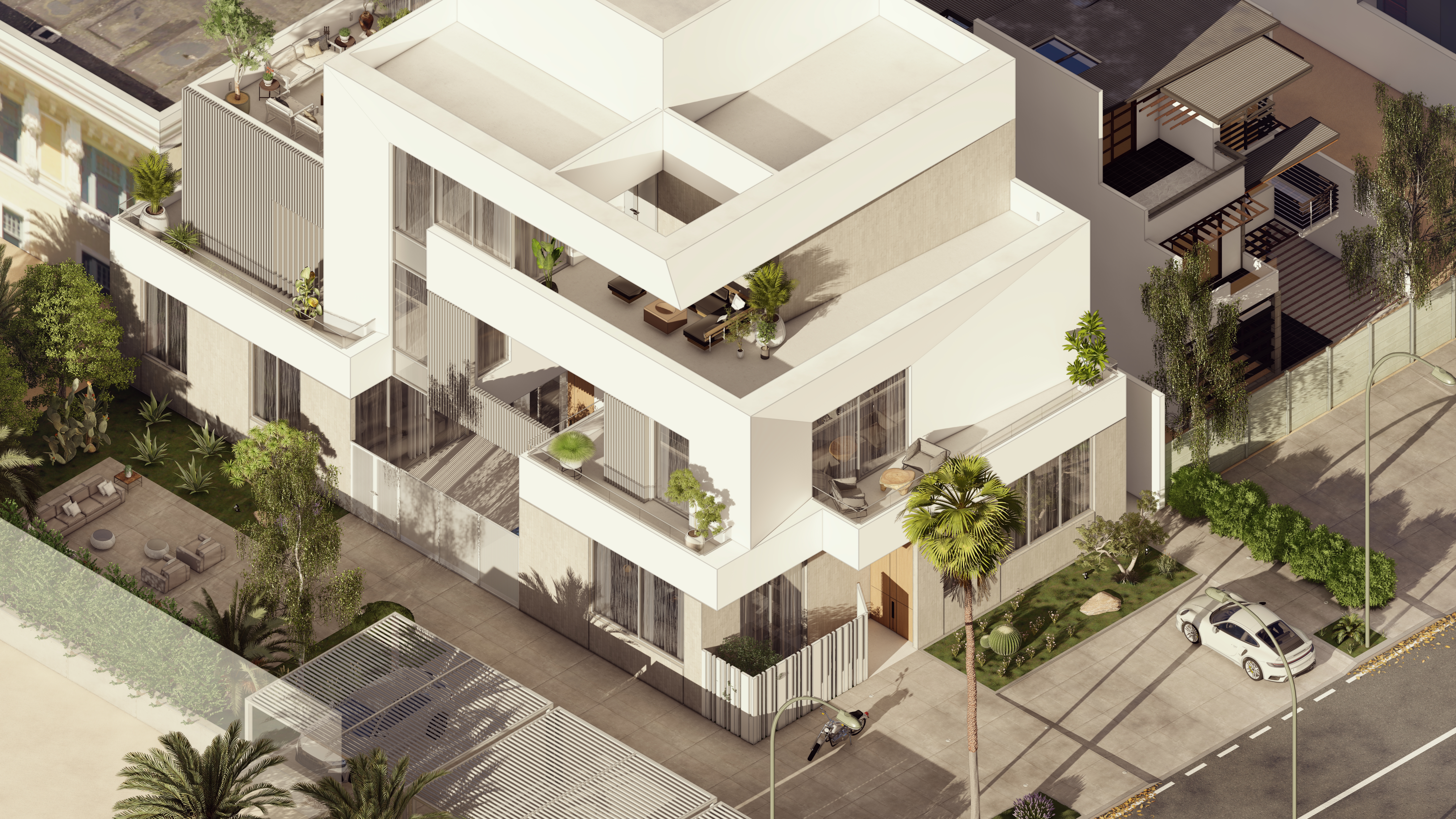 An interplay of stacked volumes and recessed terraces, where outdoor living blends seamlessly with interior spaces. Elevated balconies and rooftop gardens extend the architecture upward, while the landscaped court and shaded parking anchor the design at street level.