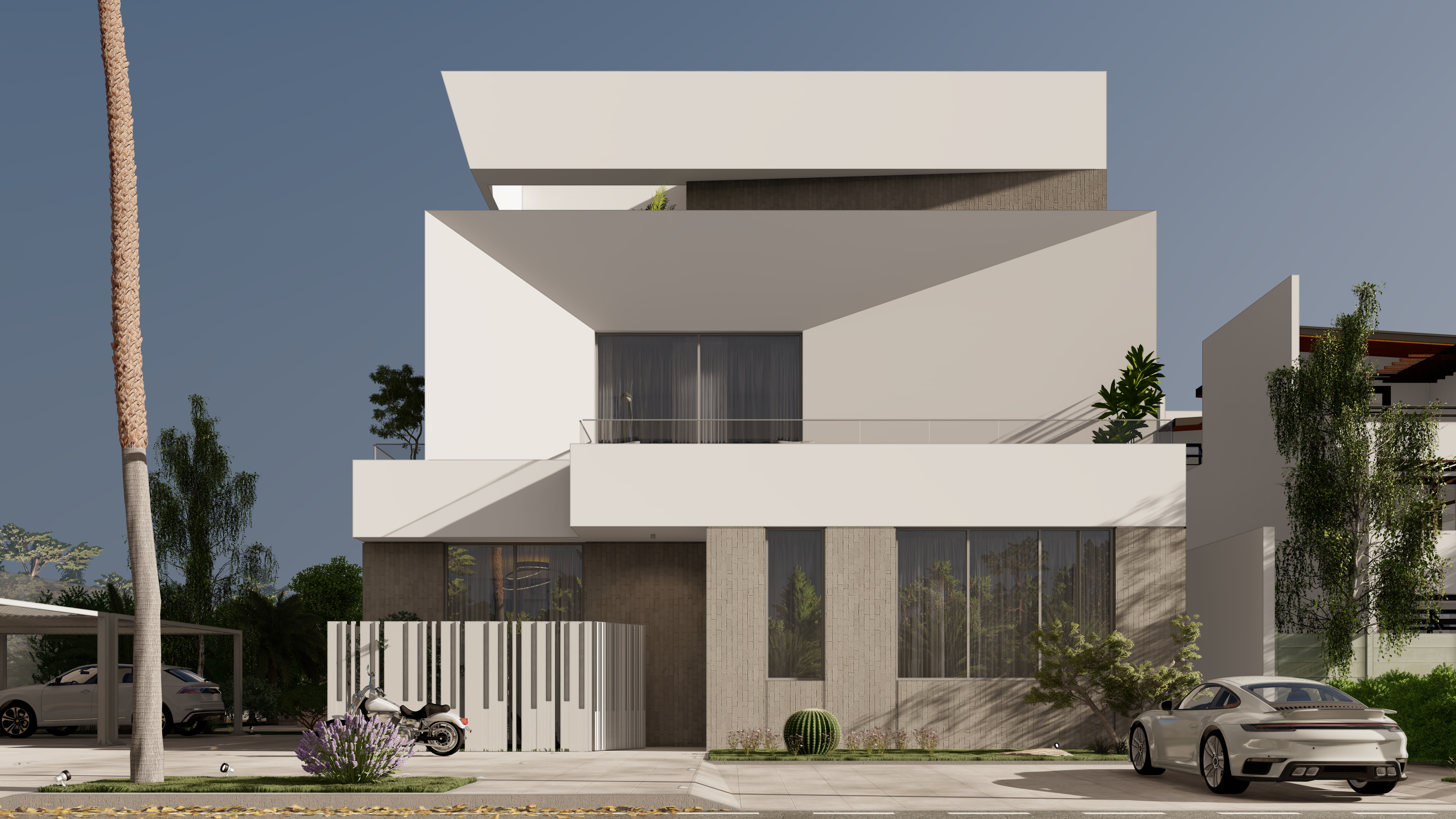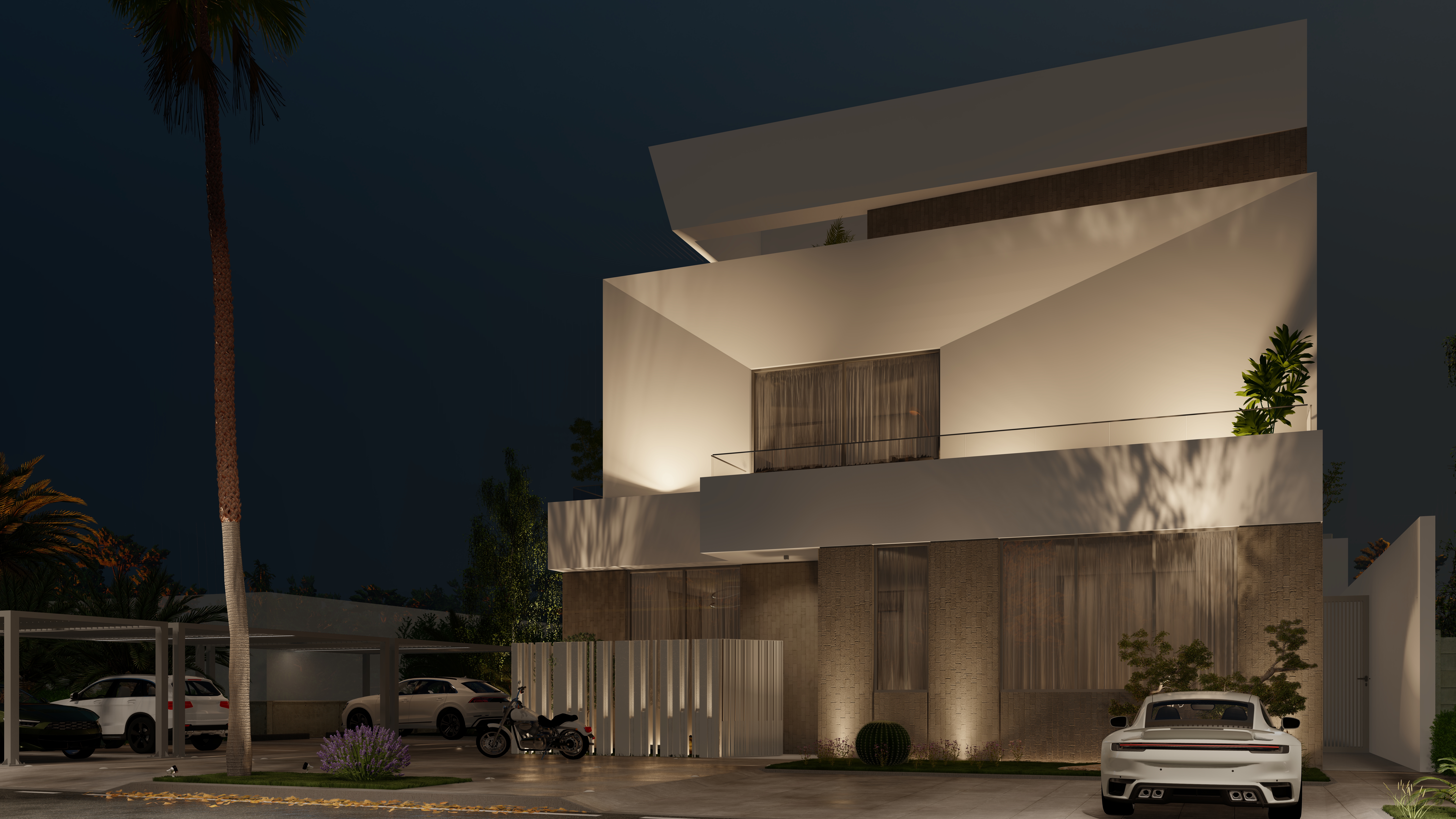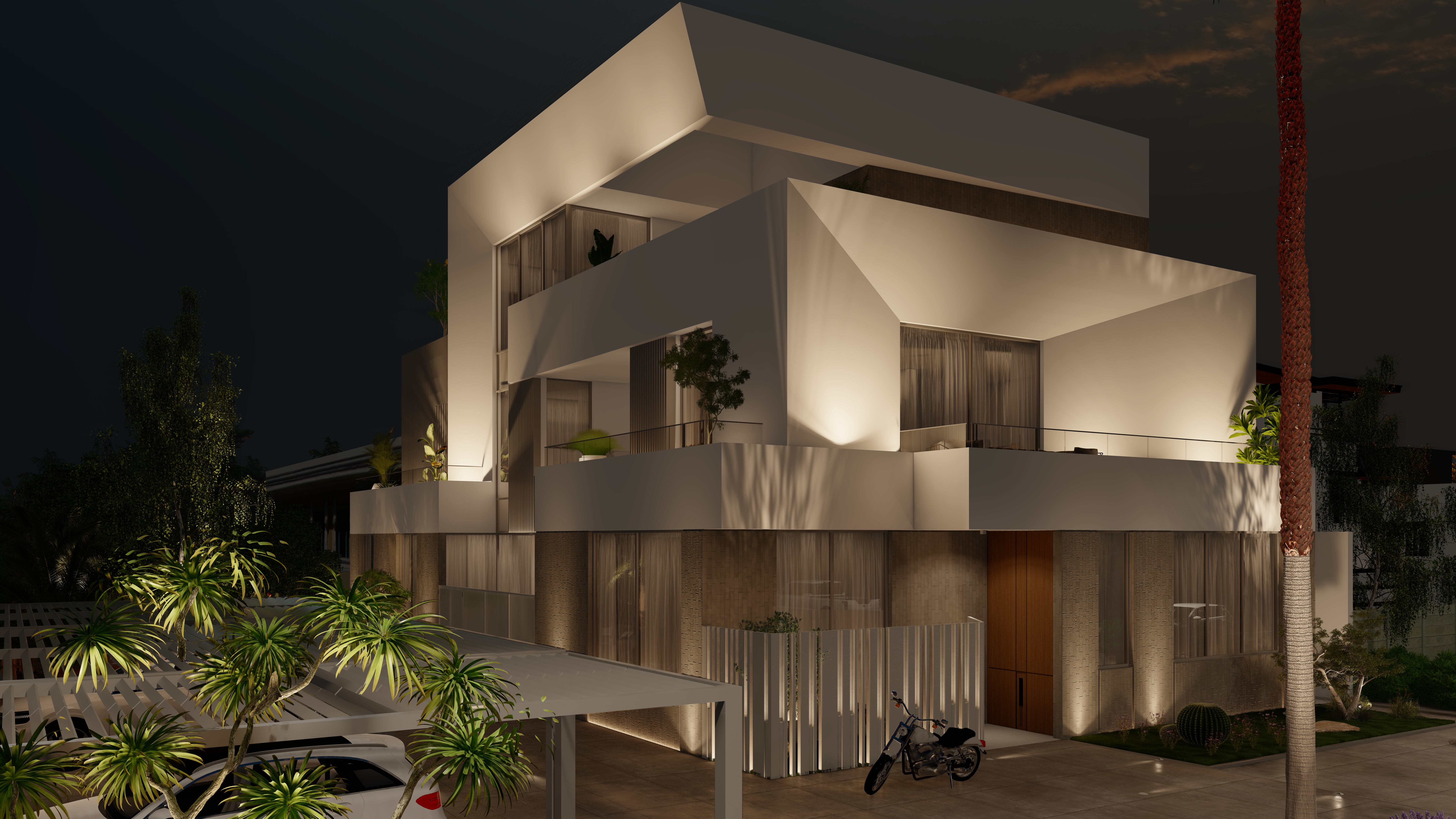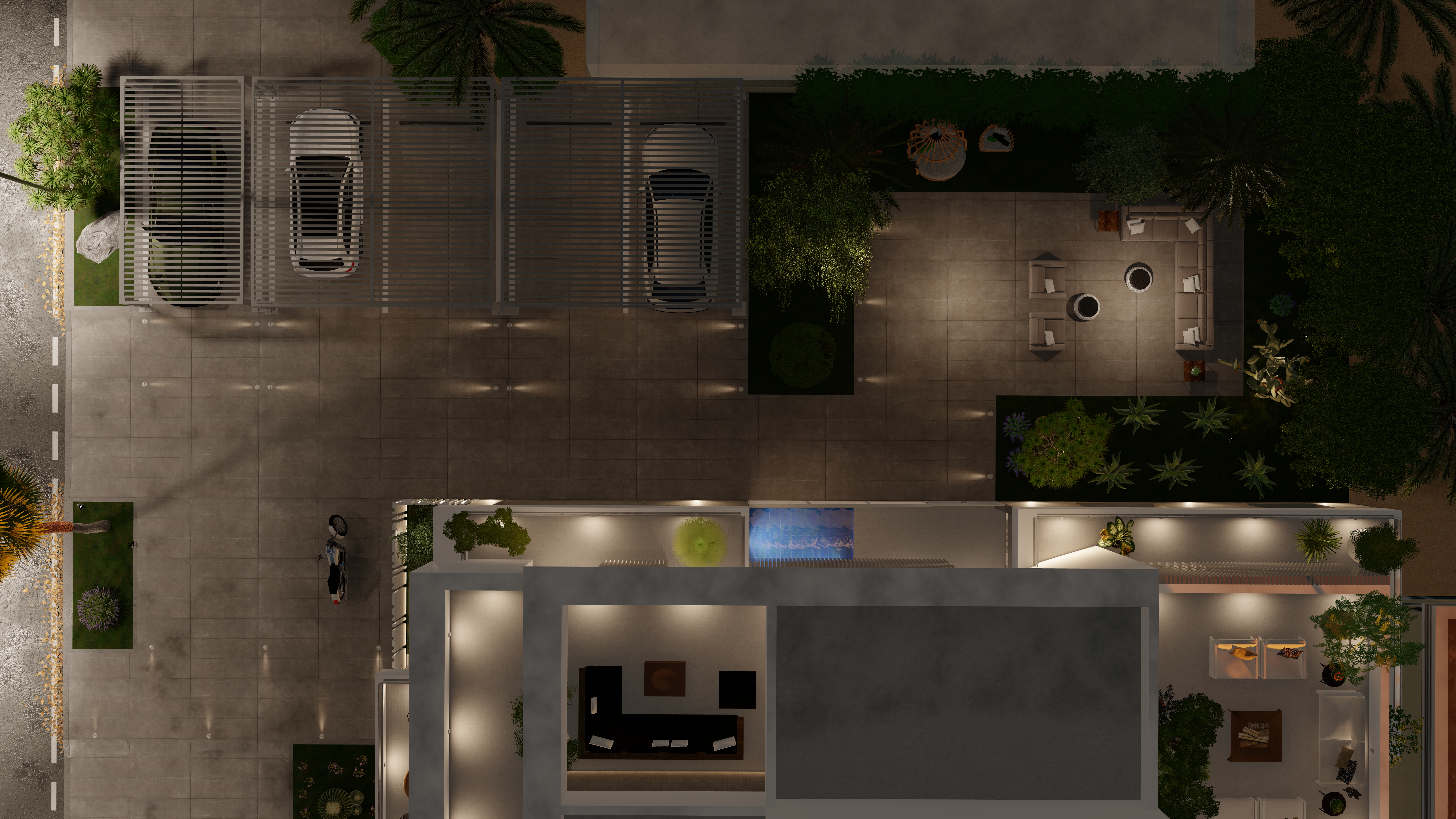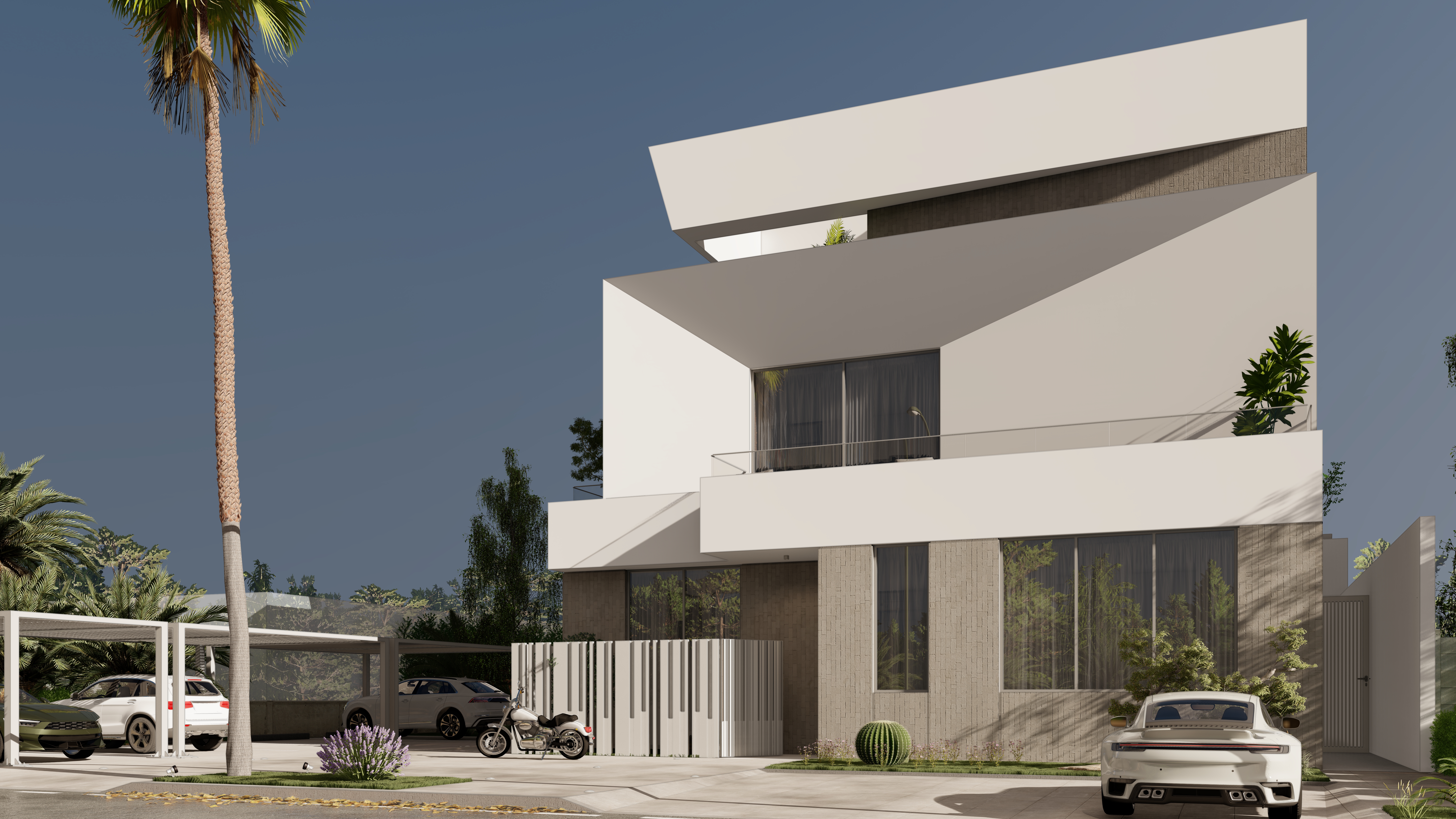 An interplay of stacked volumes and recessed terraces, where outdoor living blends seamlessly with interior spaces. Elevated balconies and rooftop gardens extend the architecture upward, while the landscaped court and shaded parking anchor the design at street level.