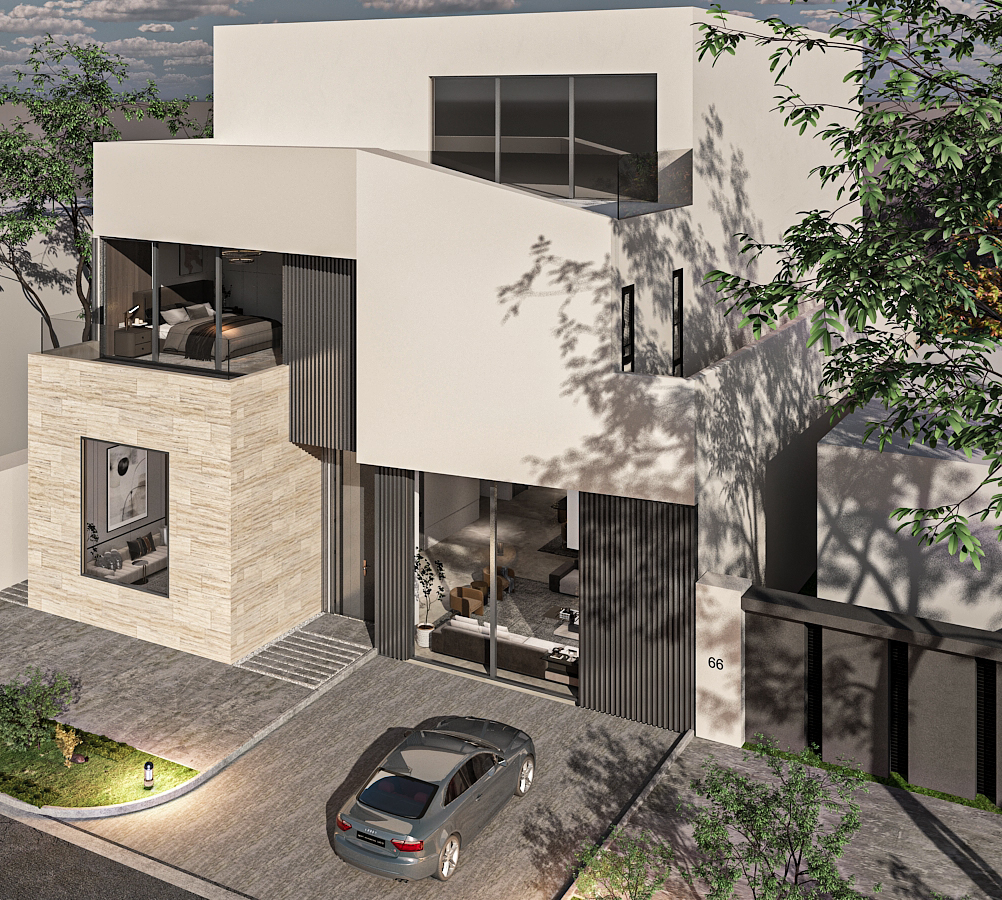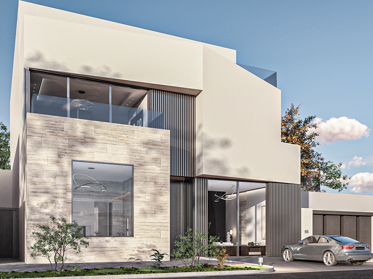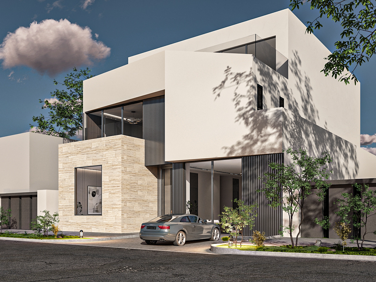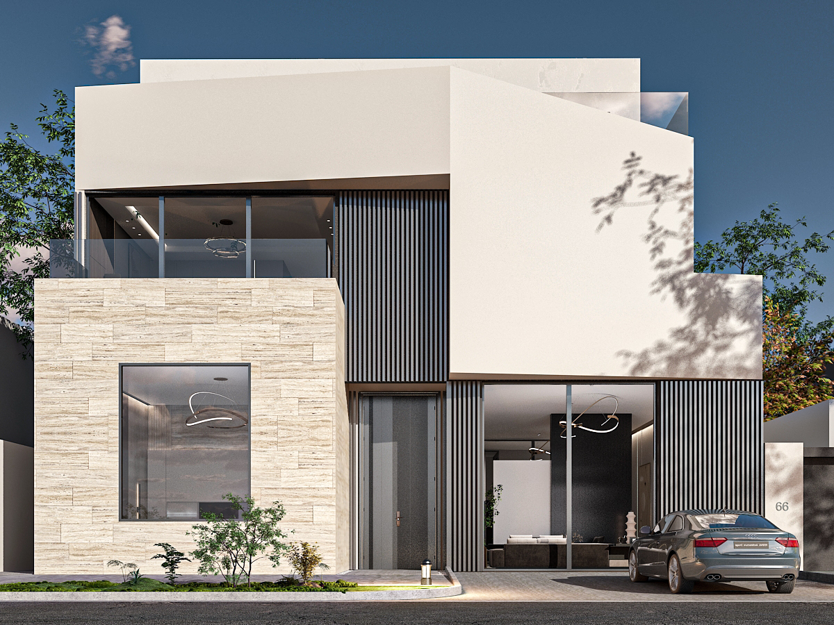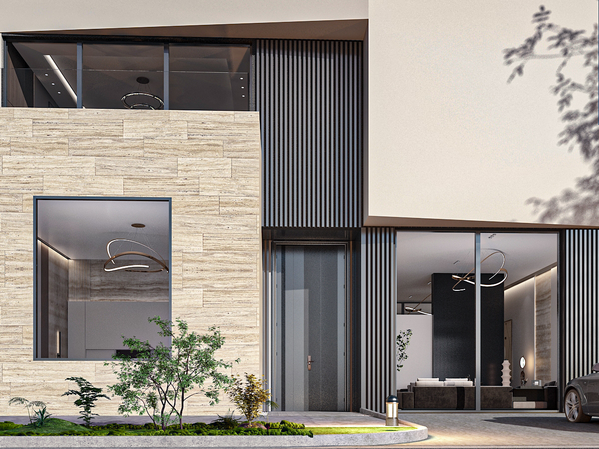 Architecturally, the façade composition is defined by clean geometric volumes articulated through a restrained palette of stone cladding, vertical louvers, and crisp plaster surfaces. The interplay of solid and transparent elements creates a balance of privacy and openness—large glazing frames the social spaces on the ground floor while emphasizing vertical proportions. The use of natural stone at the base grounds the structure, while the upper white volumes project a sense of lightness and modernity. Vertical louvers not only provide shading and privacy but also add rhythm and texture to the elevation, reinforcing the villa’s minimal yet dynamic architectural identity.