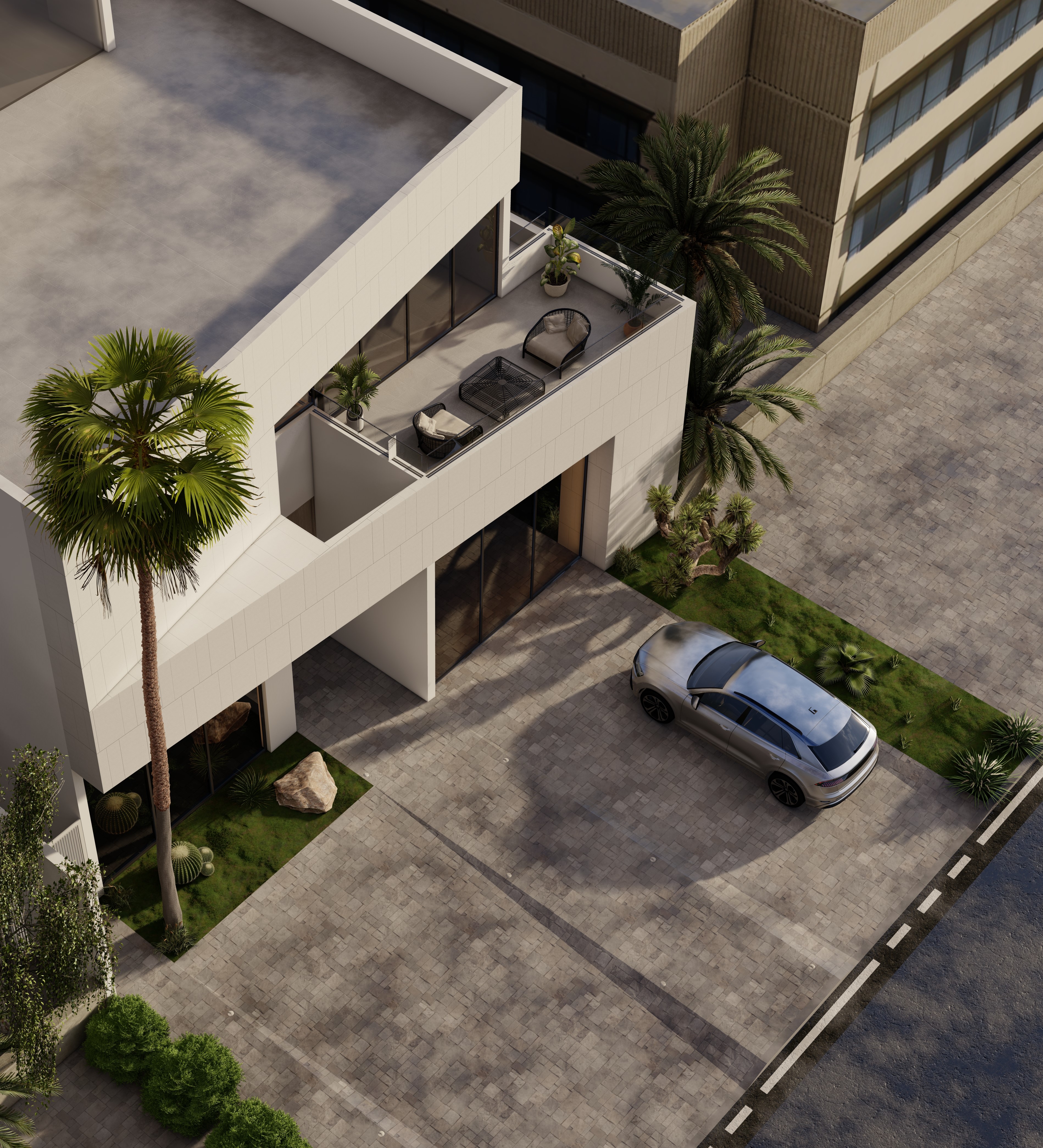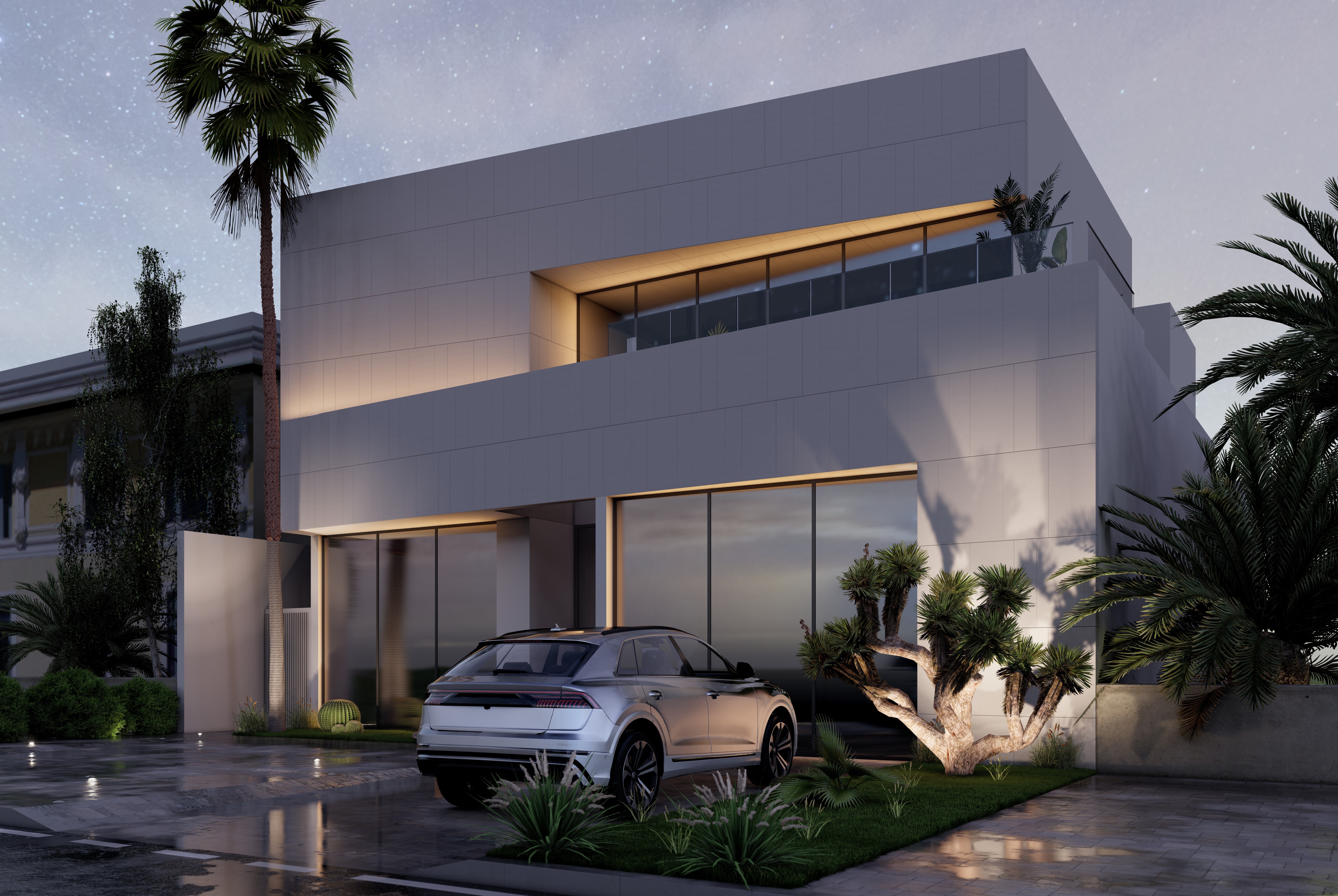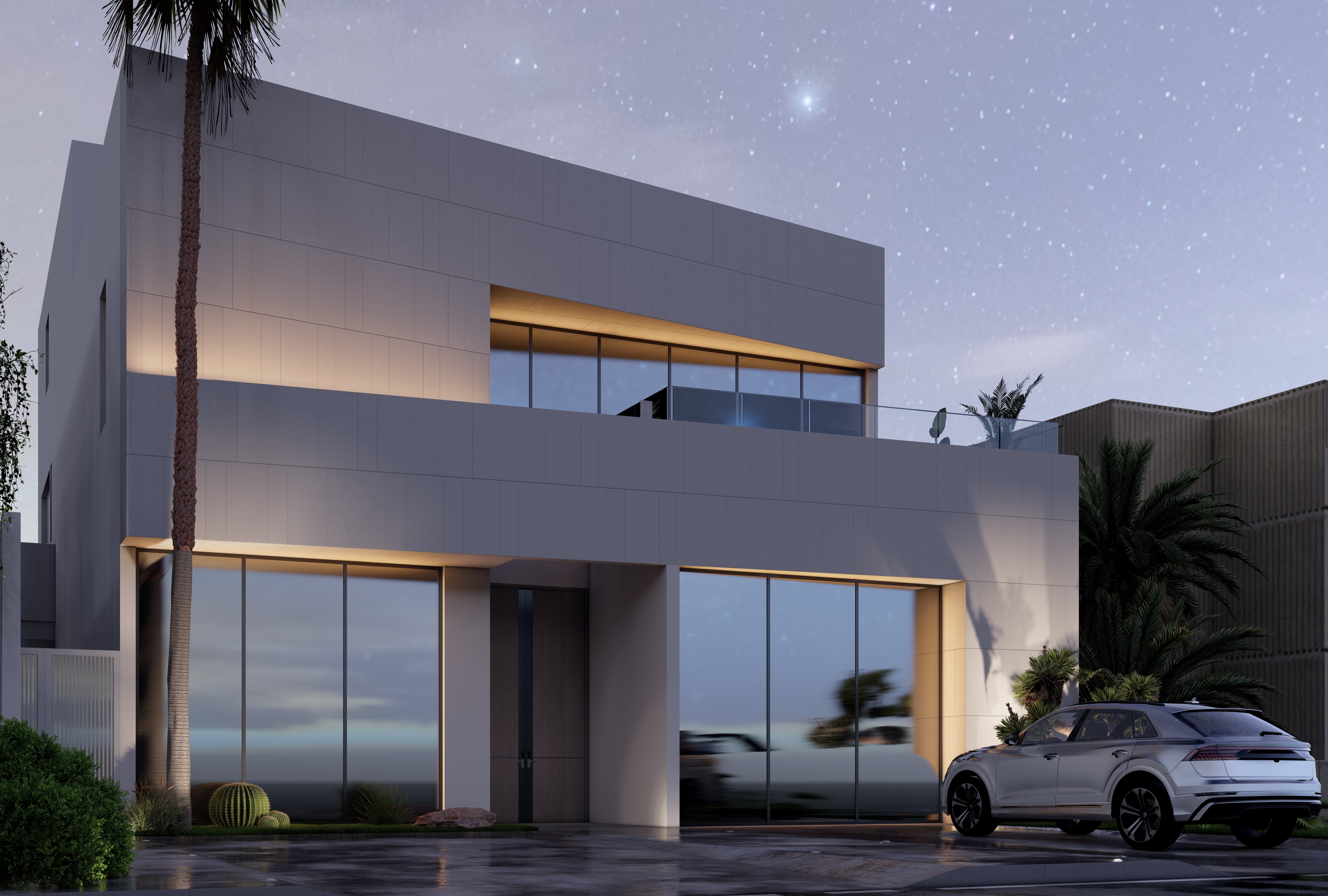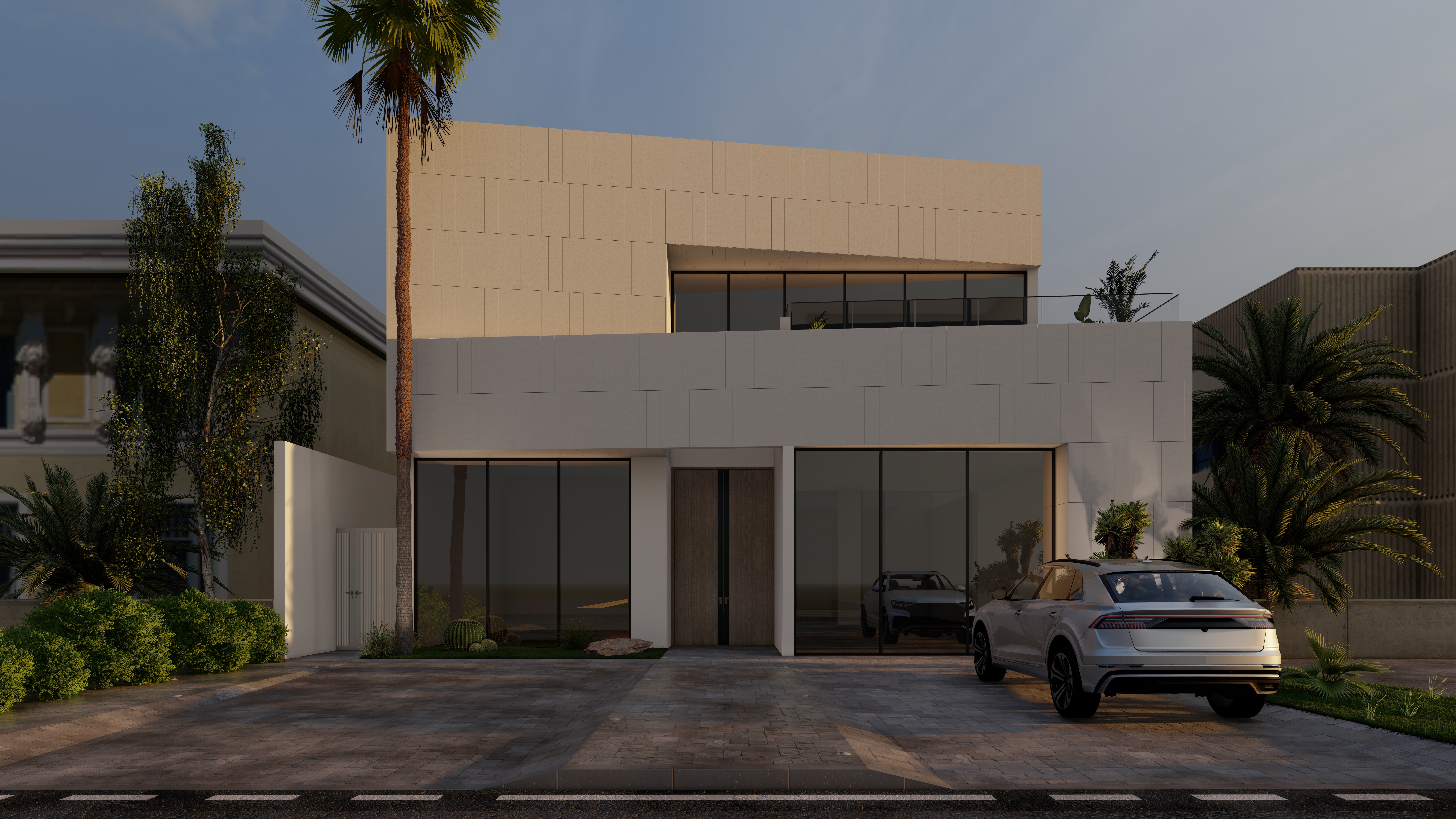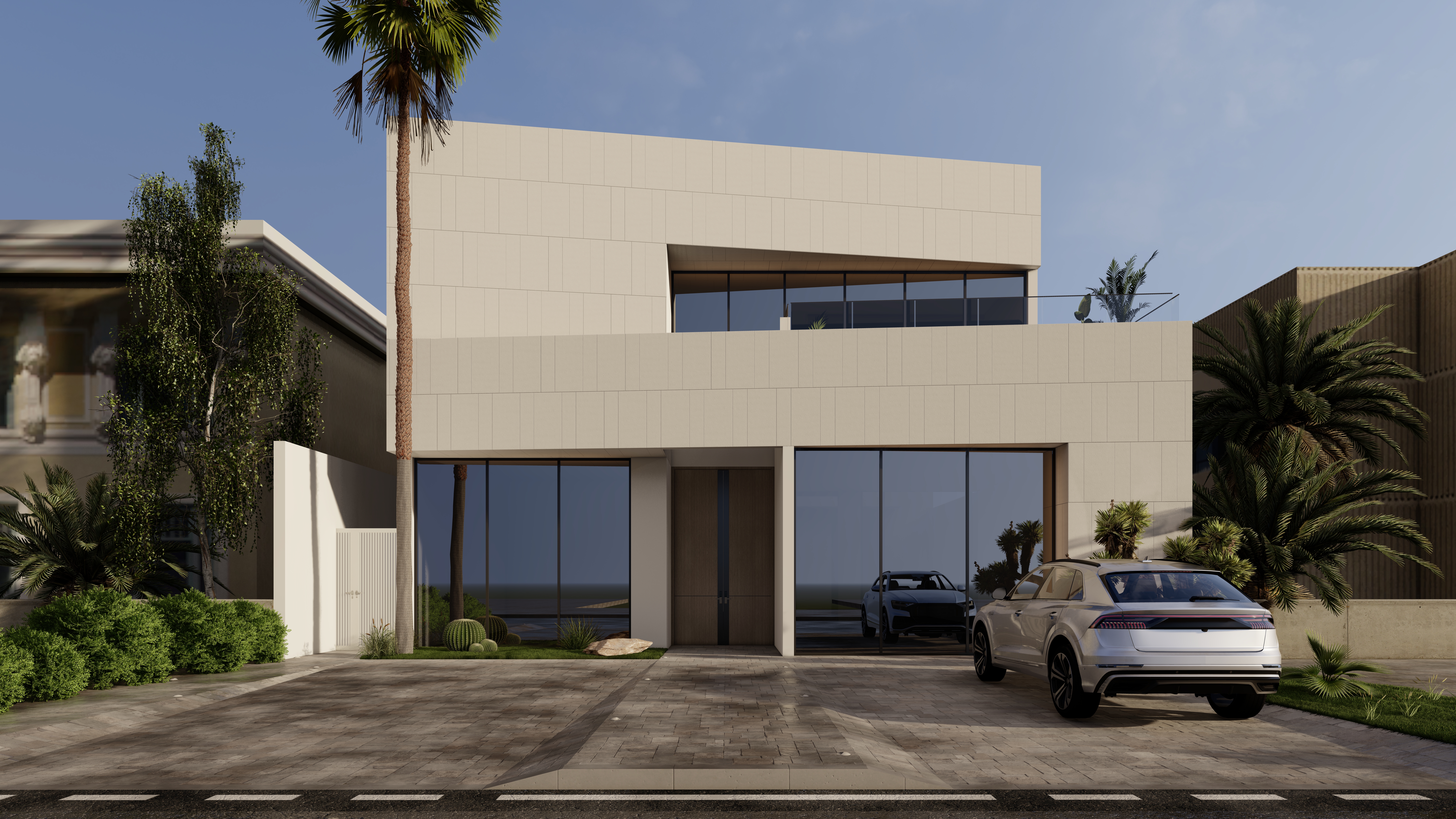 A bold interplay of solid volumes and glazed openings defines the façade, where a cantilevered upper mass frames terraces and living spaces, blending privacy with openness in a refined contemporary expression.