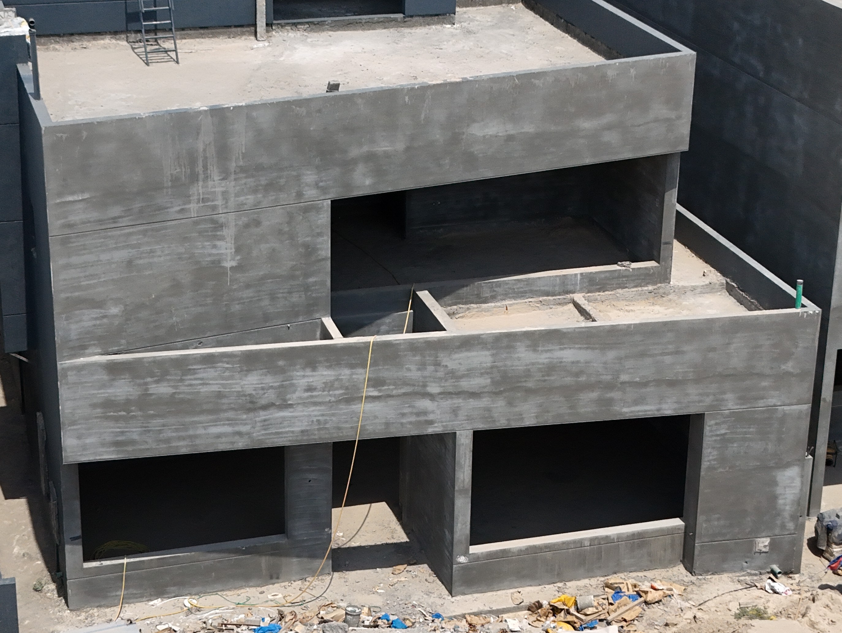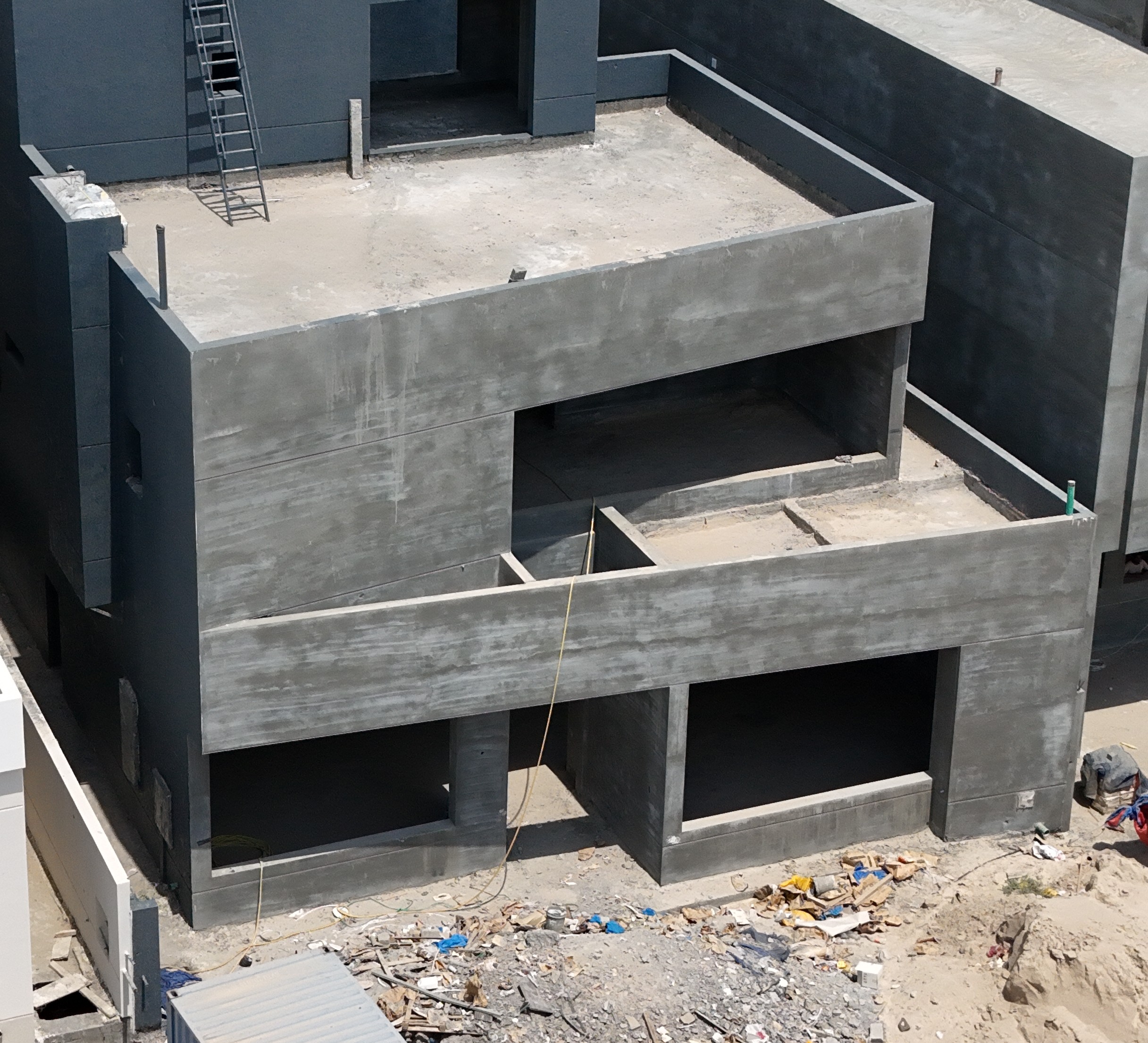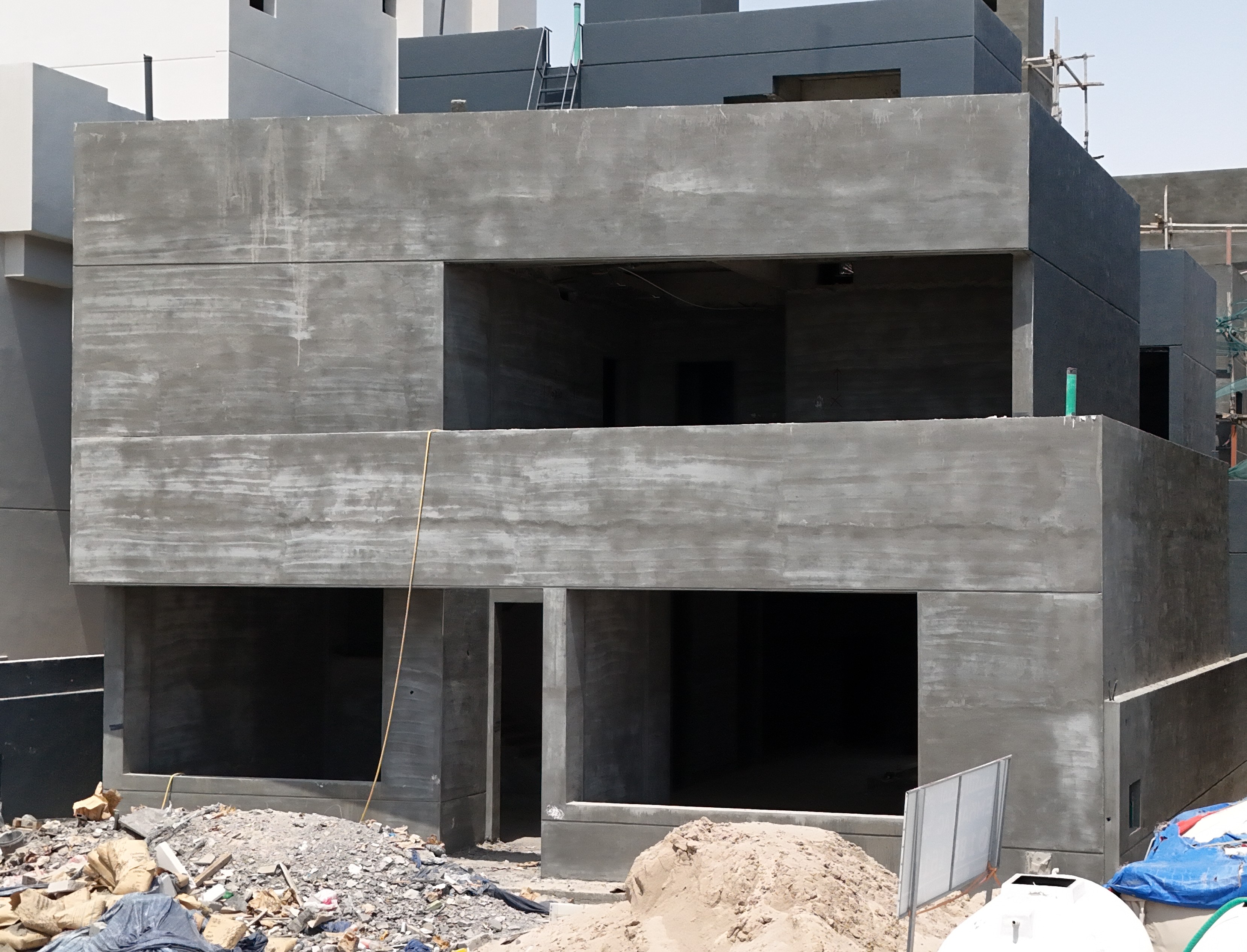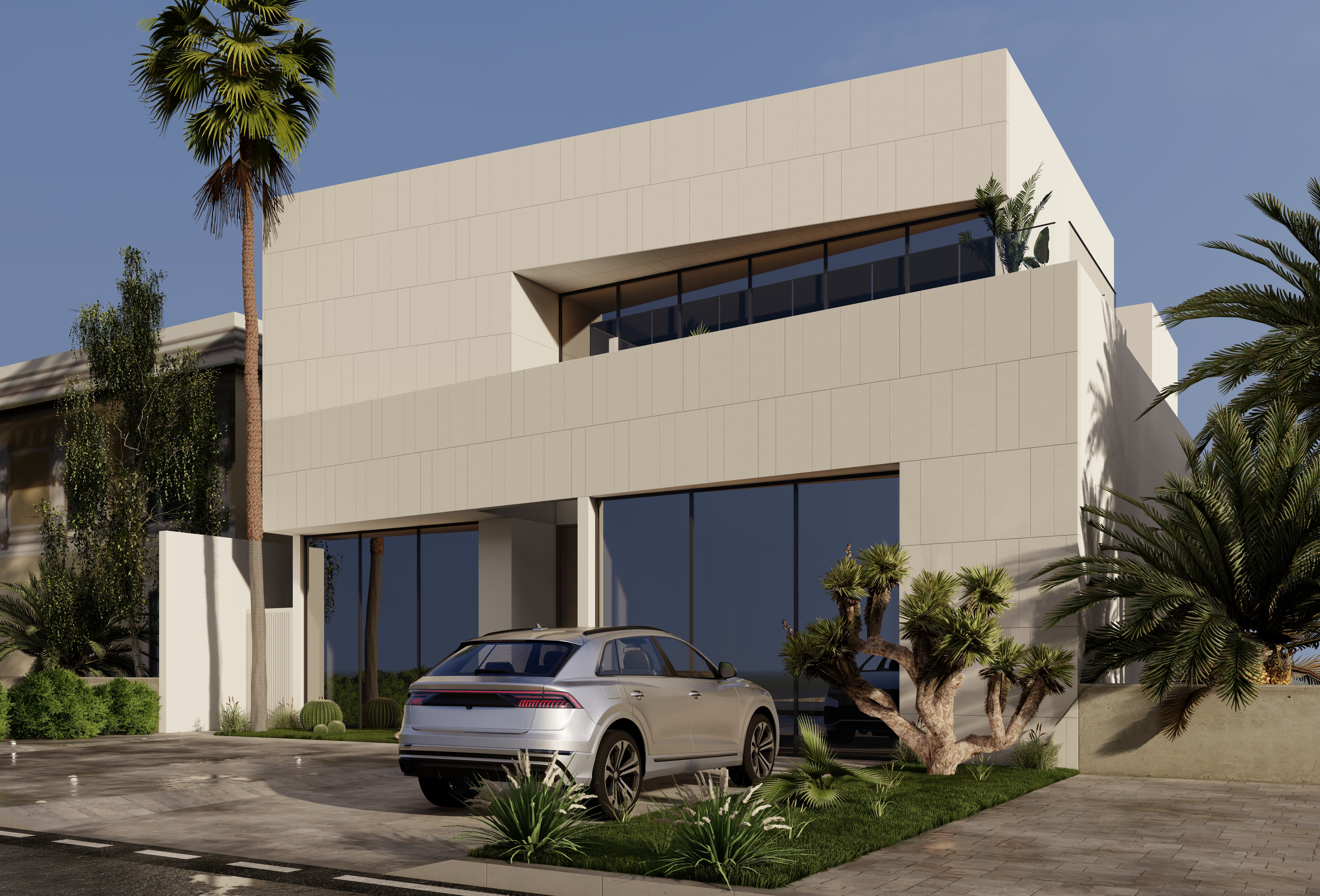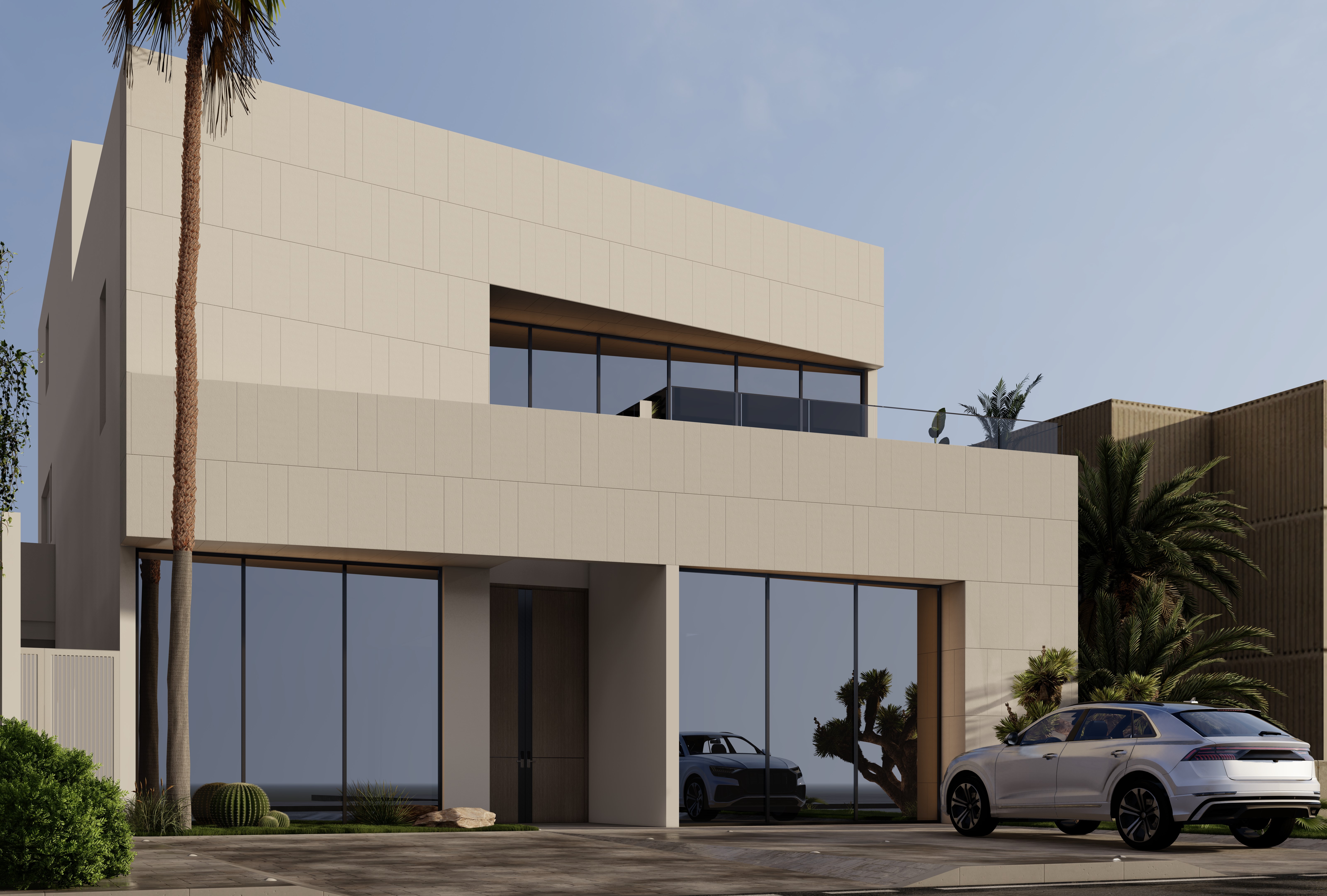 A bold interplay of solid volumes and glazed openings defines the façade, where a cantilevered upper mass frames terraces and living spaces, blending privacy with openness in a refined contemporary expression.
