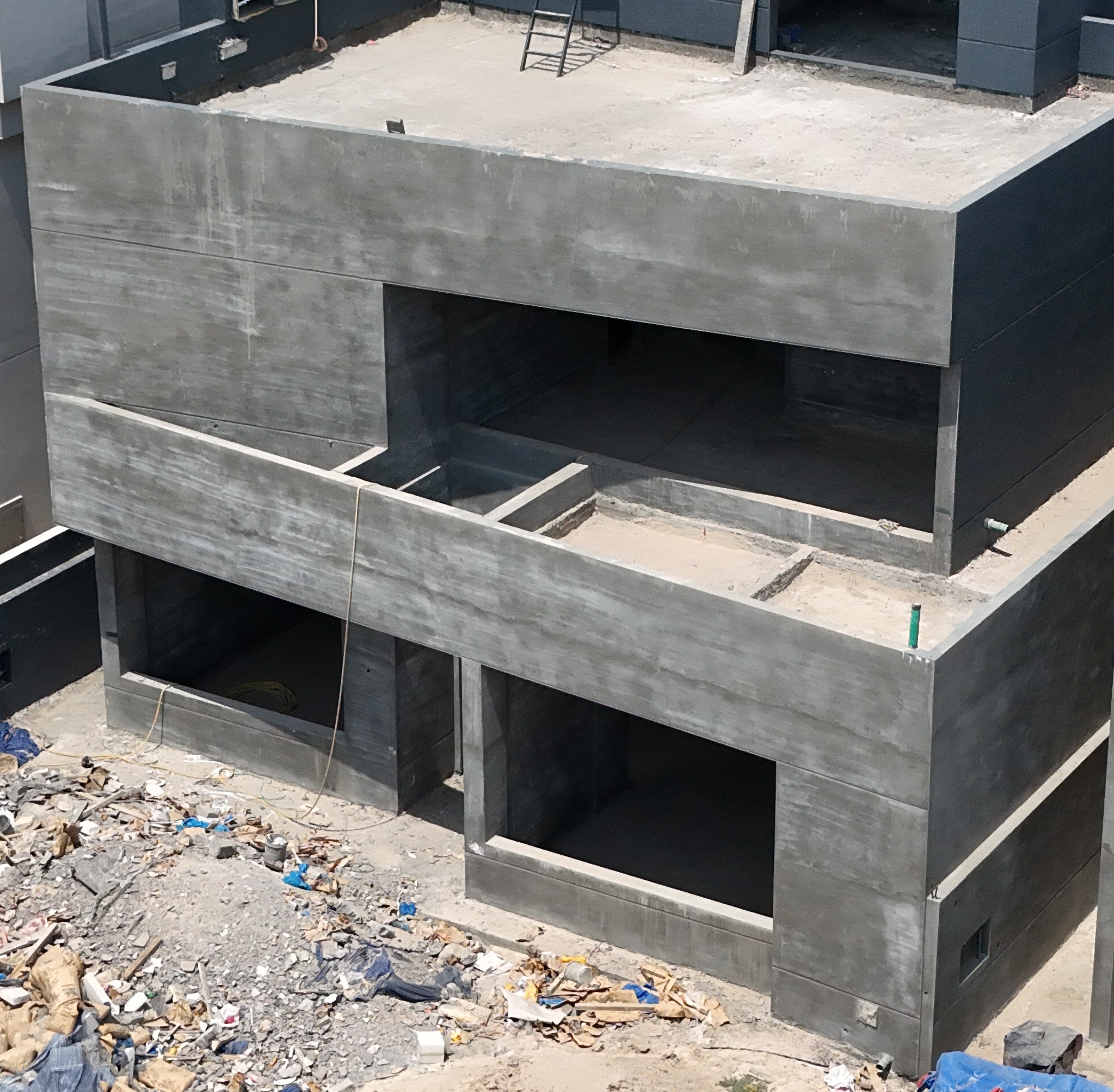 Stacked volumes and recessed voids frame a glazed base with a projecting terrace above.