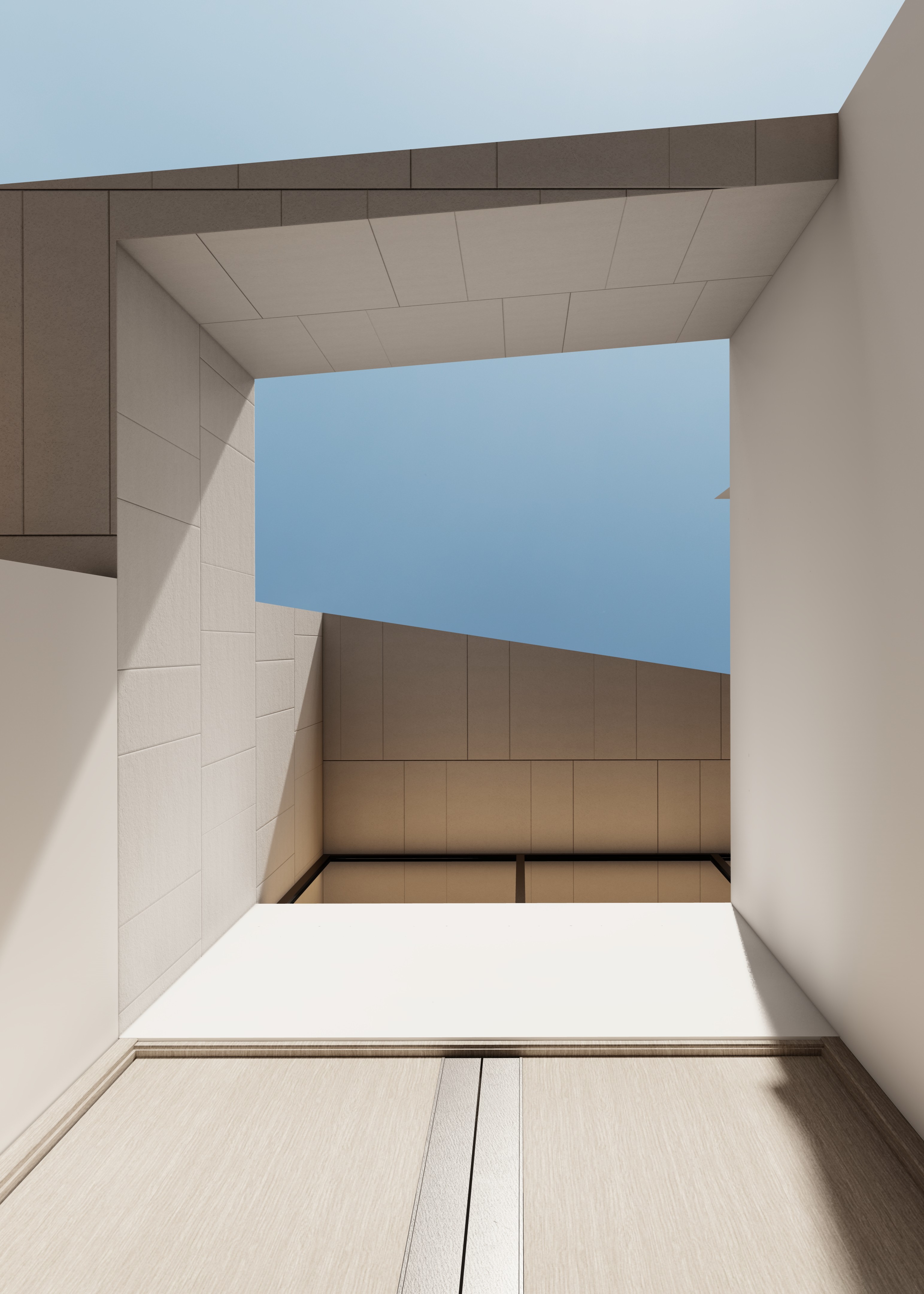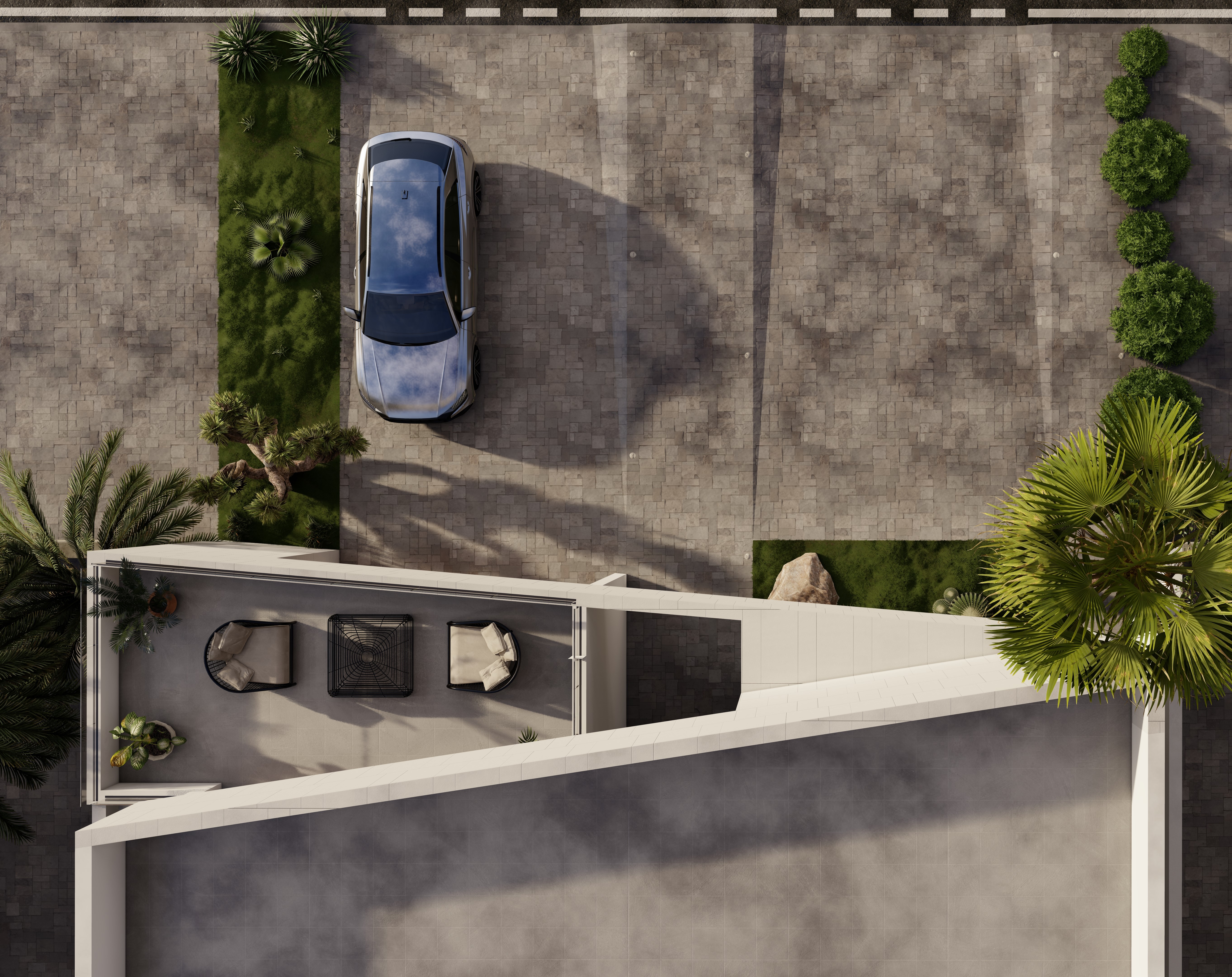 On the first floor, the private spaces are organized into three master bedrooms, with the main suite positioned along the street façade. Its design takes advantage of a generous terrace, created through the careful shifting of volumes that define the exterior expression of the house. These volumetric shifts not only provide outdoor living areas but also articulate the façade with recessed and projecting forms, balancing transparency and solidity.