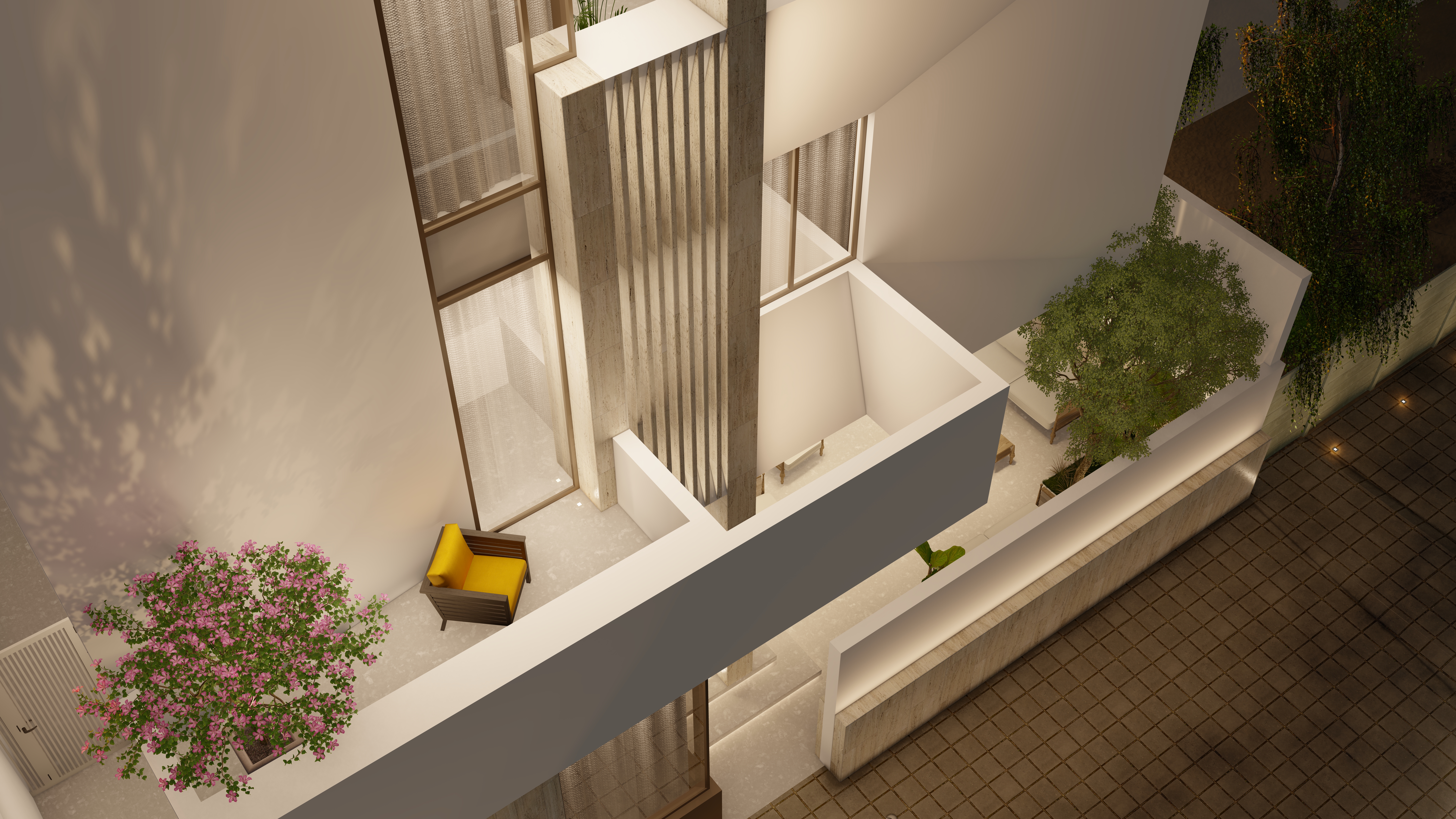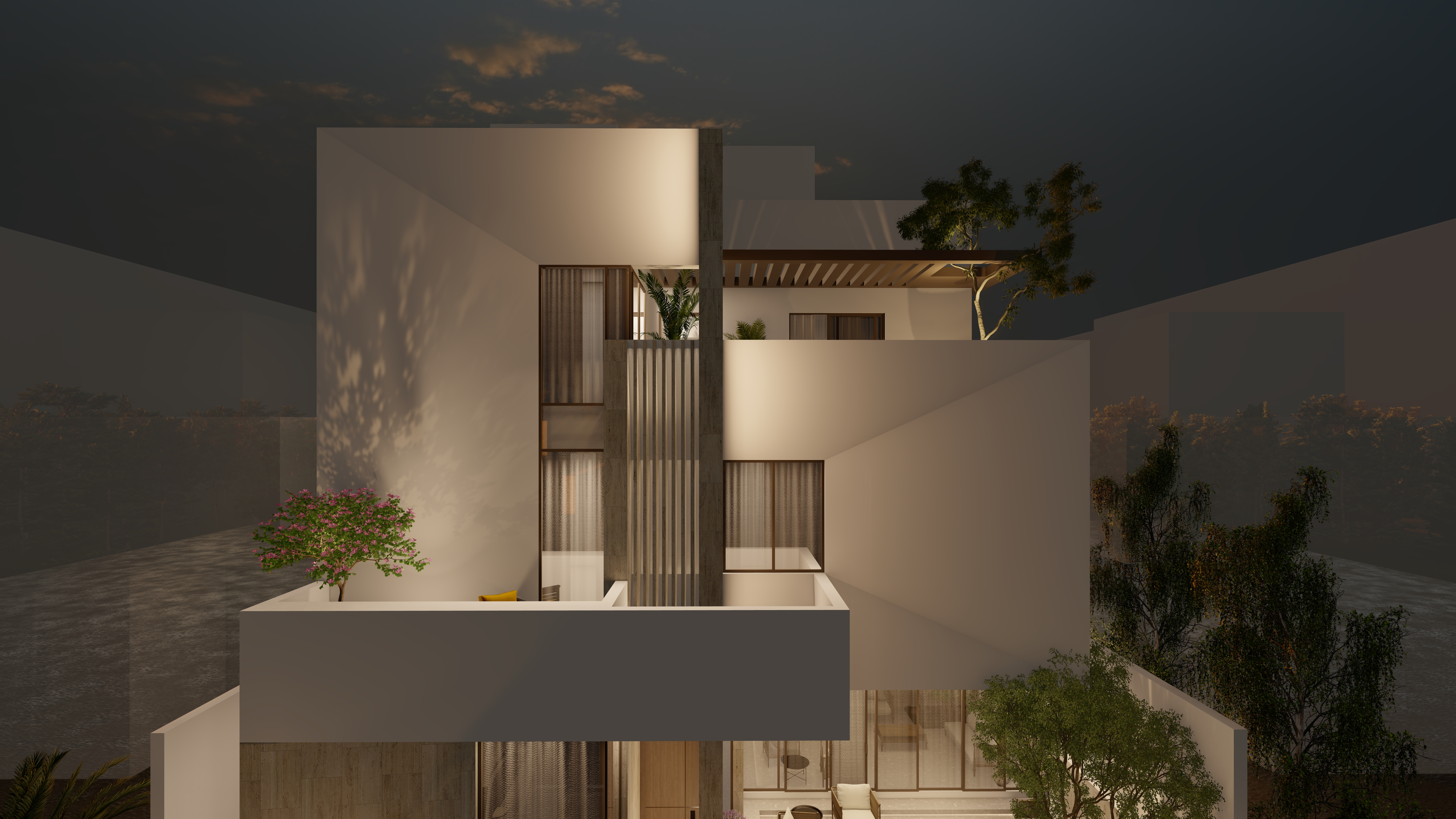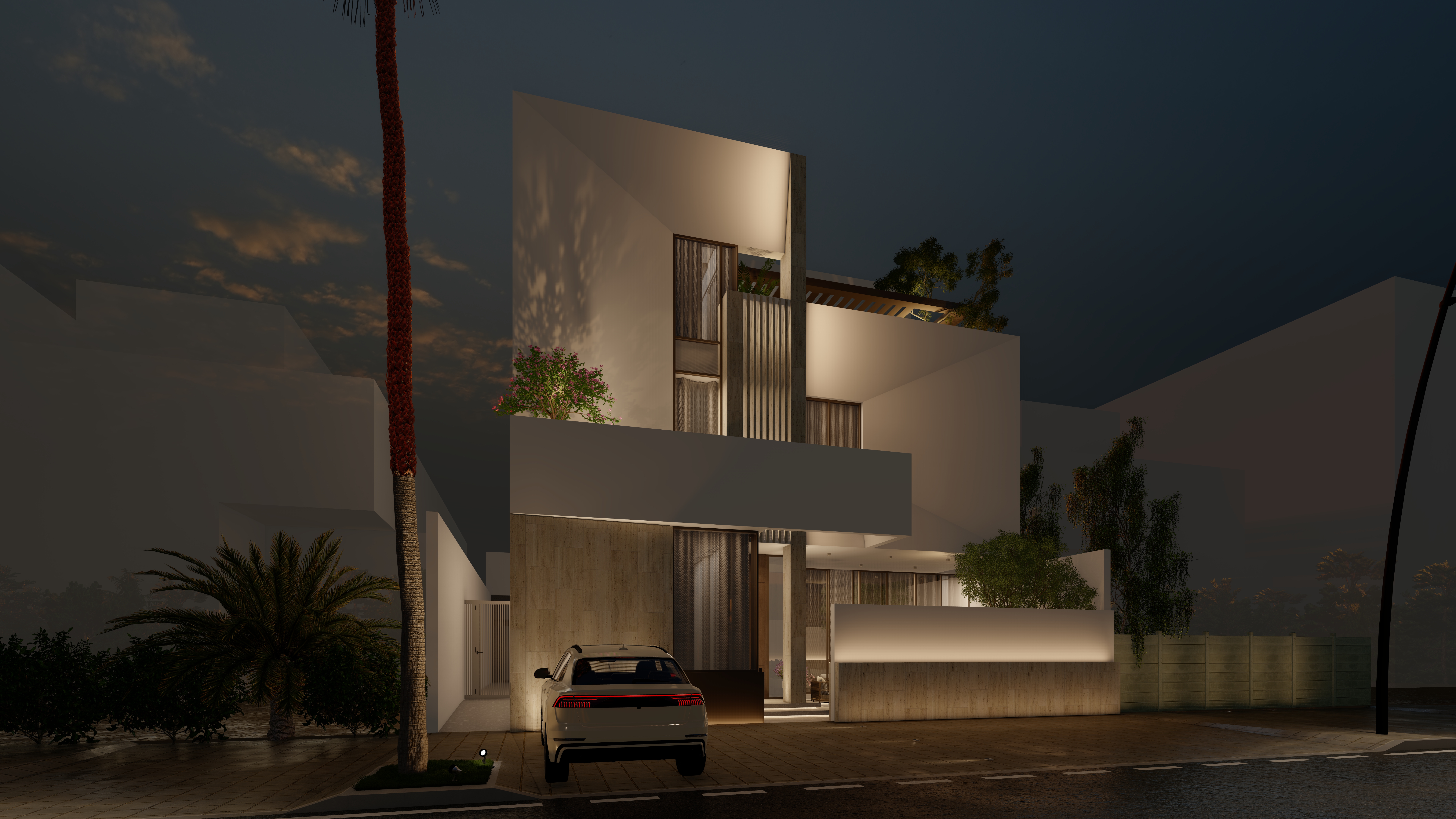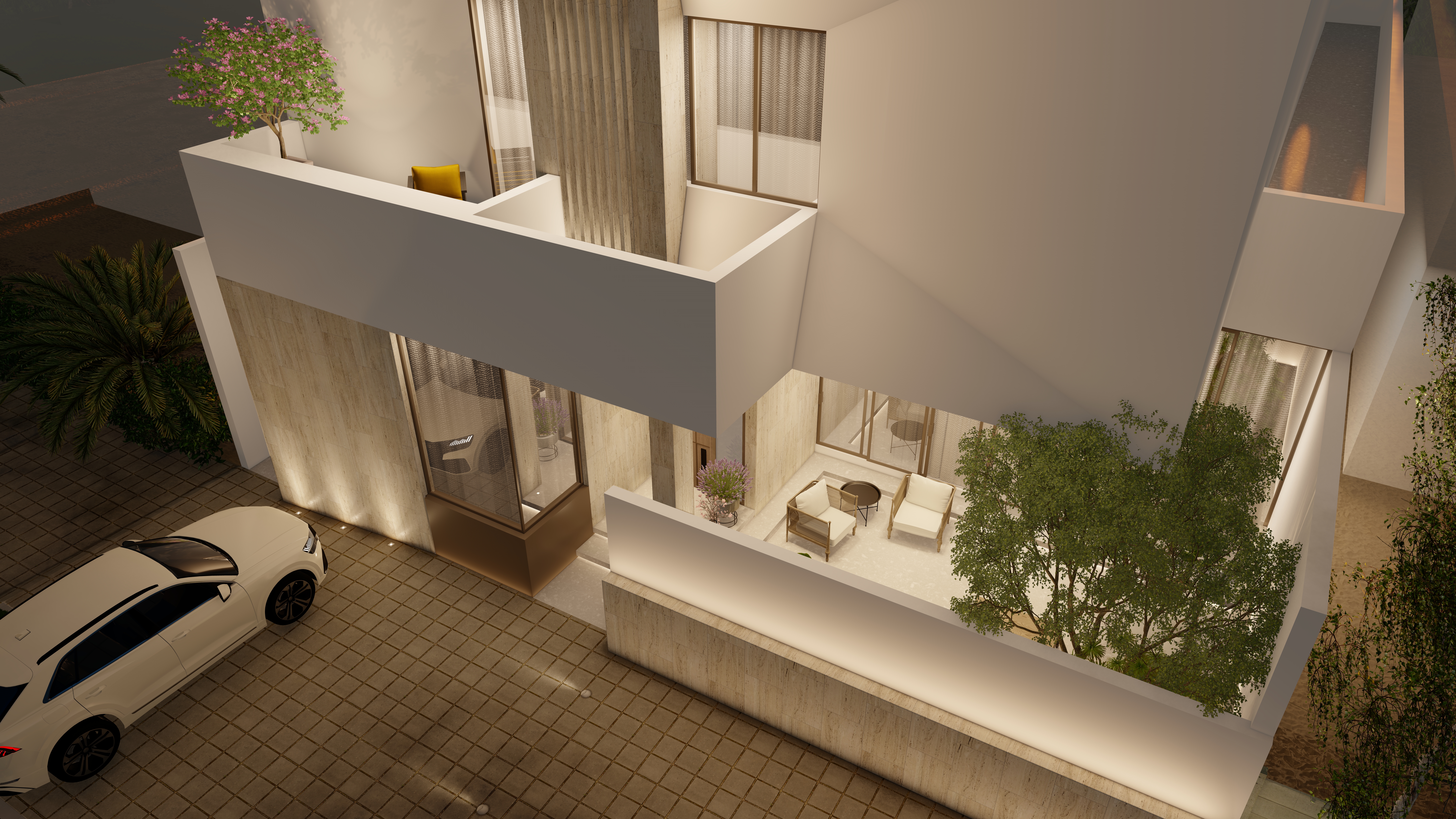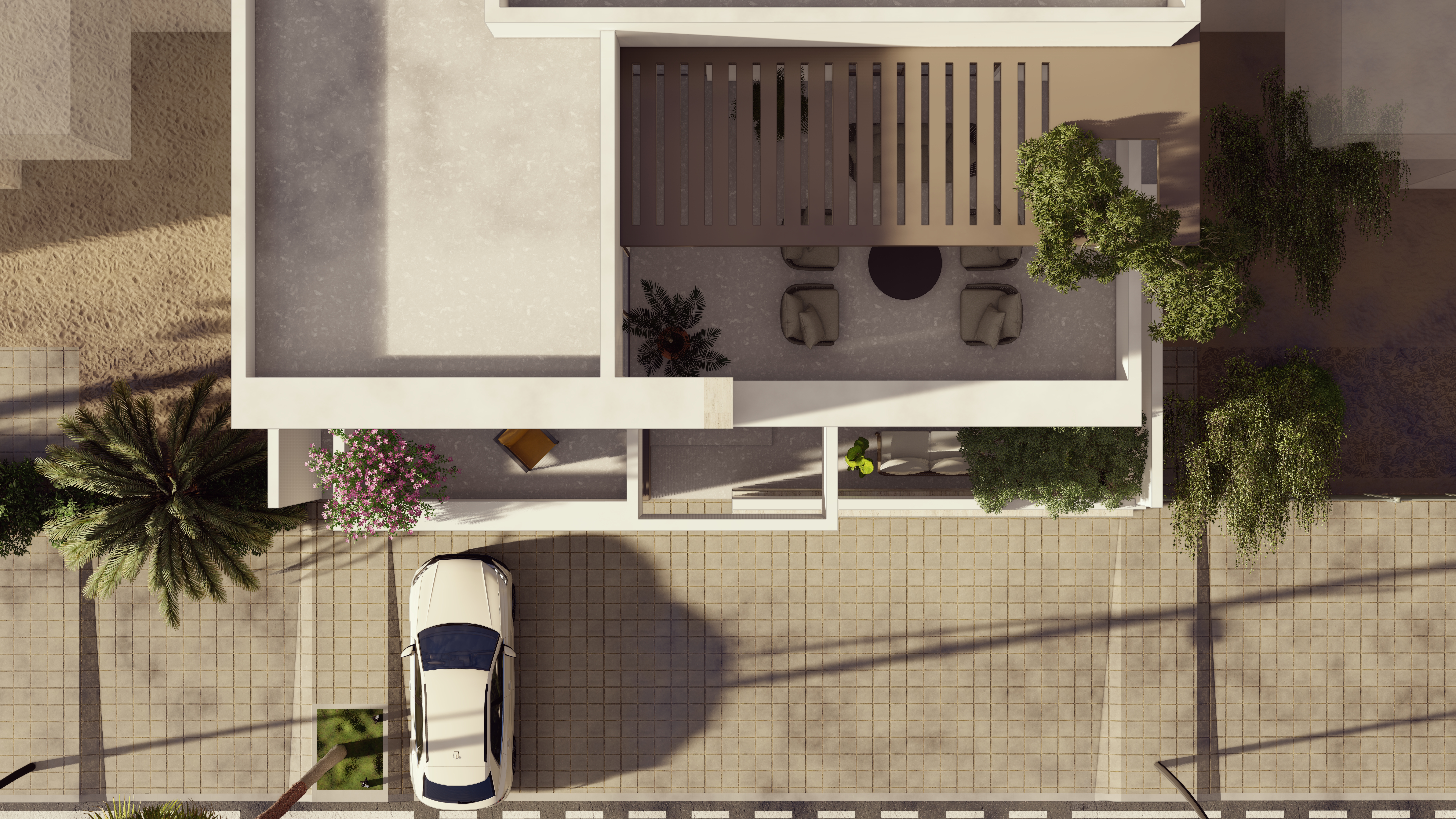 A private forecourt blends light, shadow, and nature at the home’s entry.
