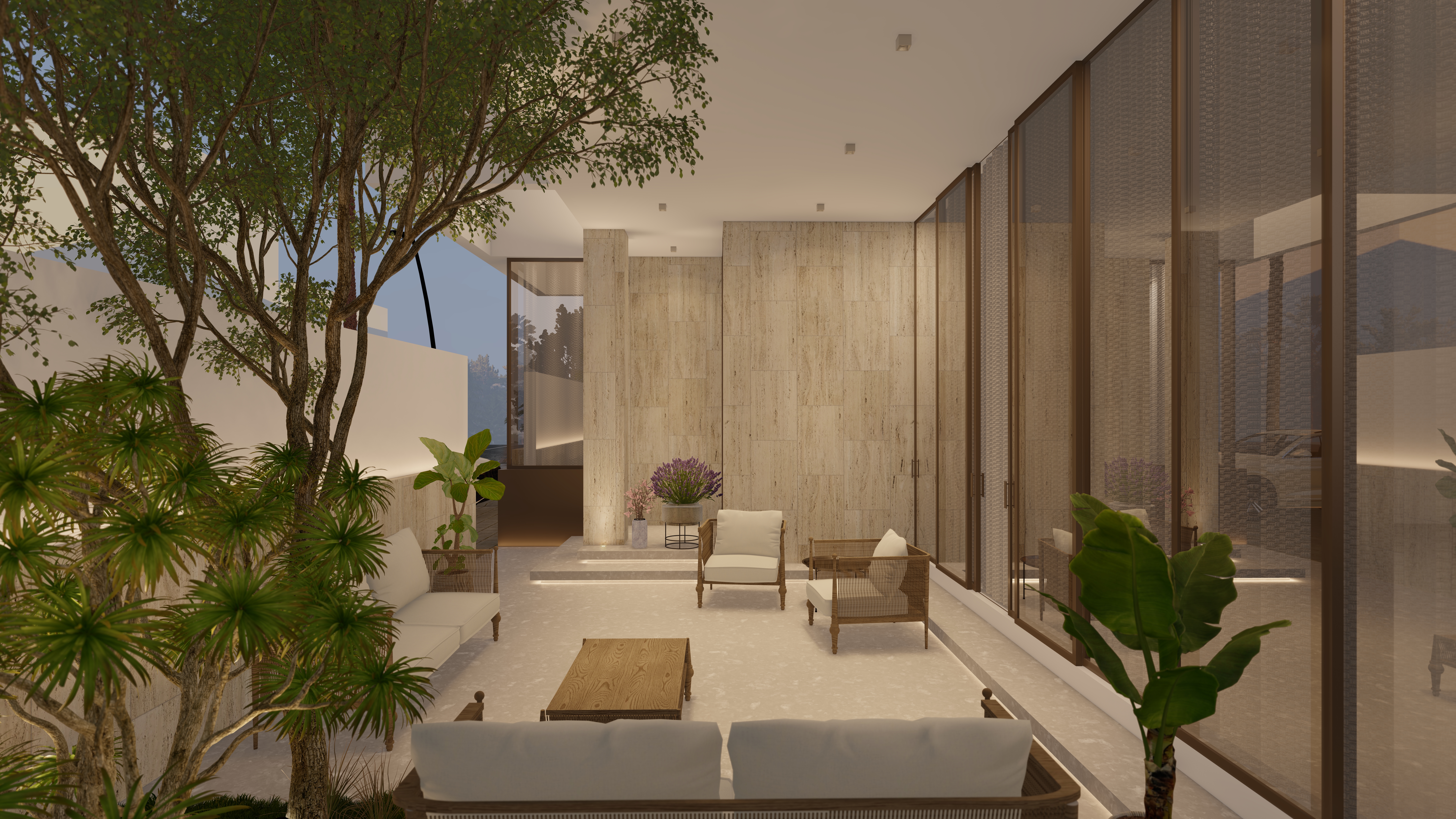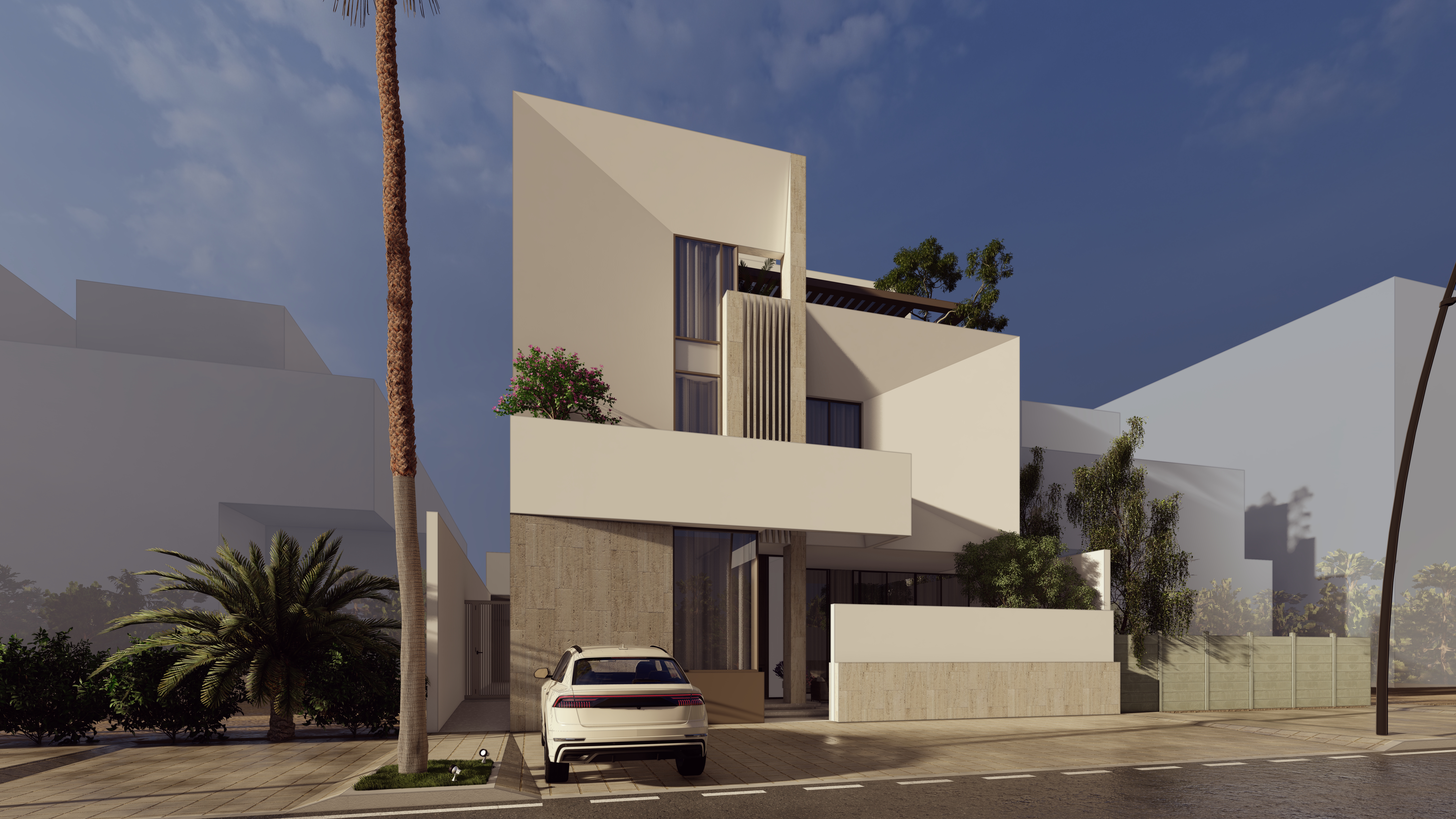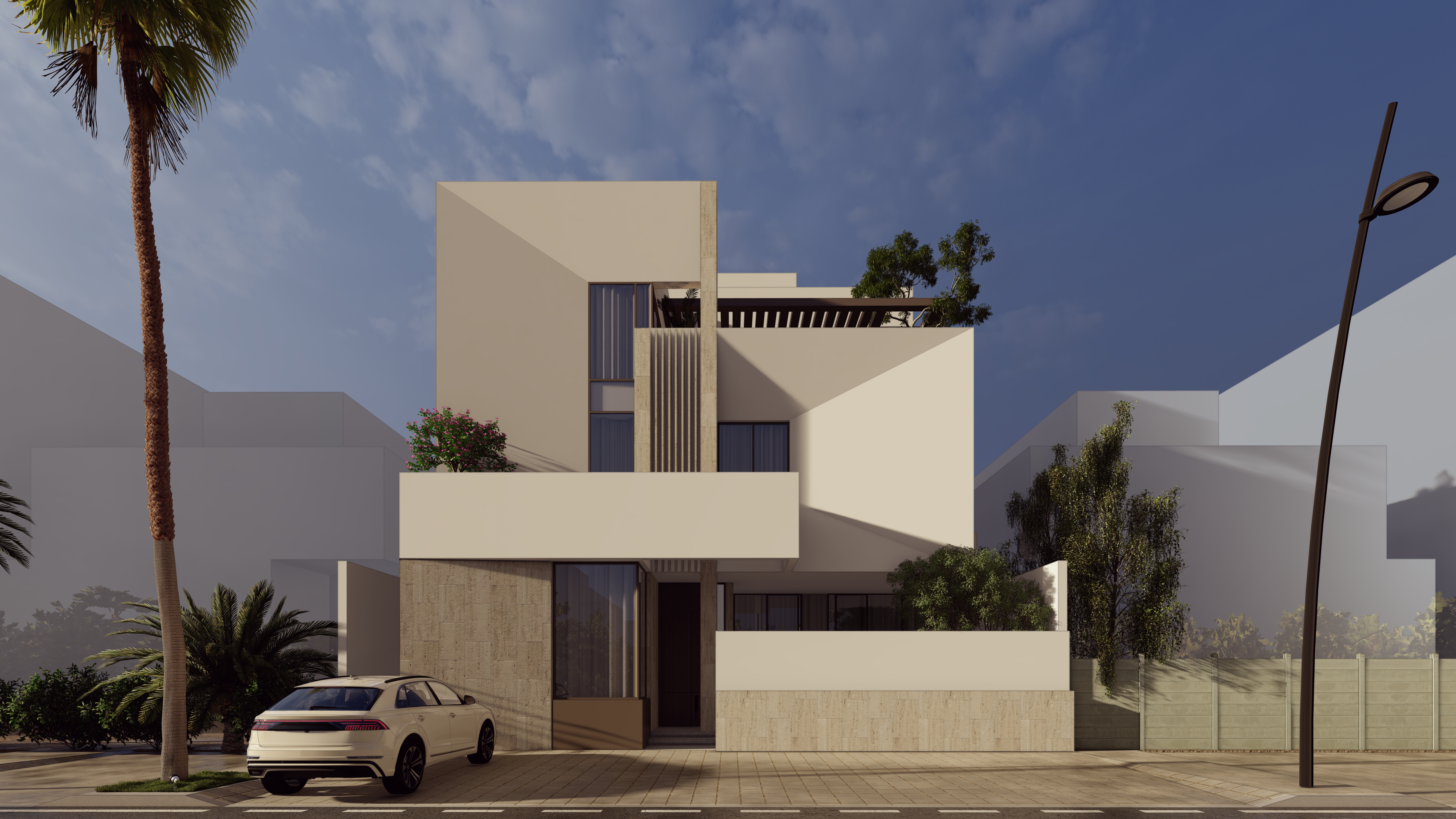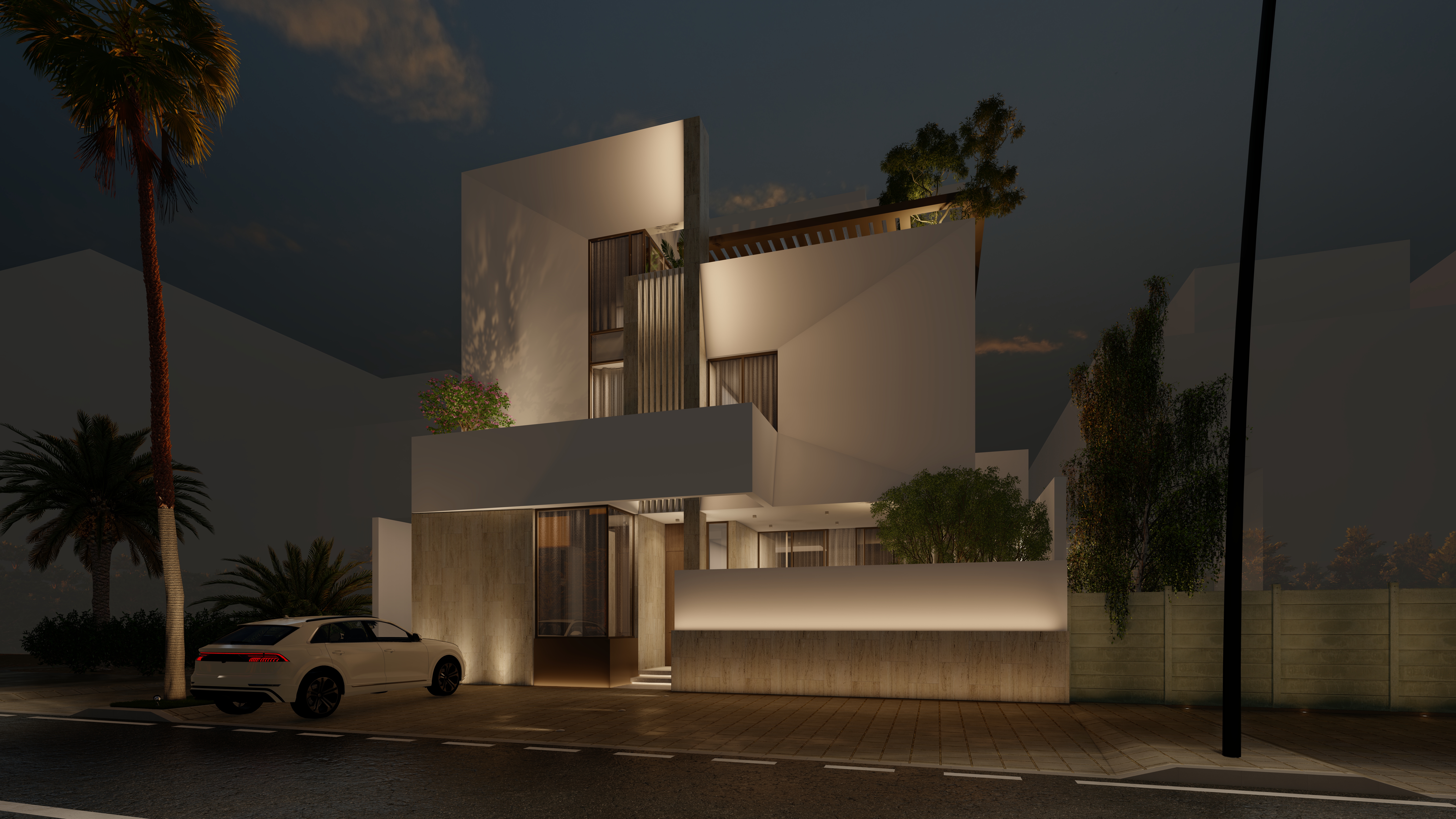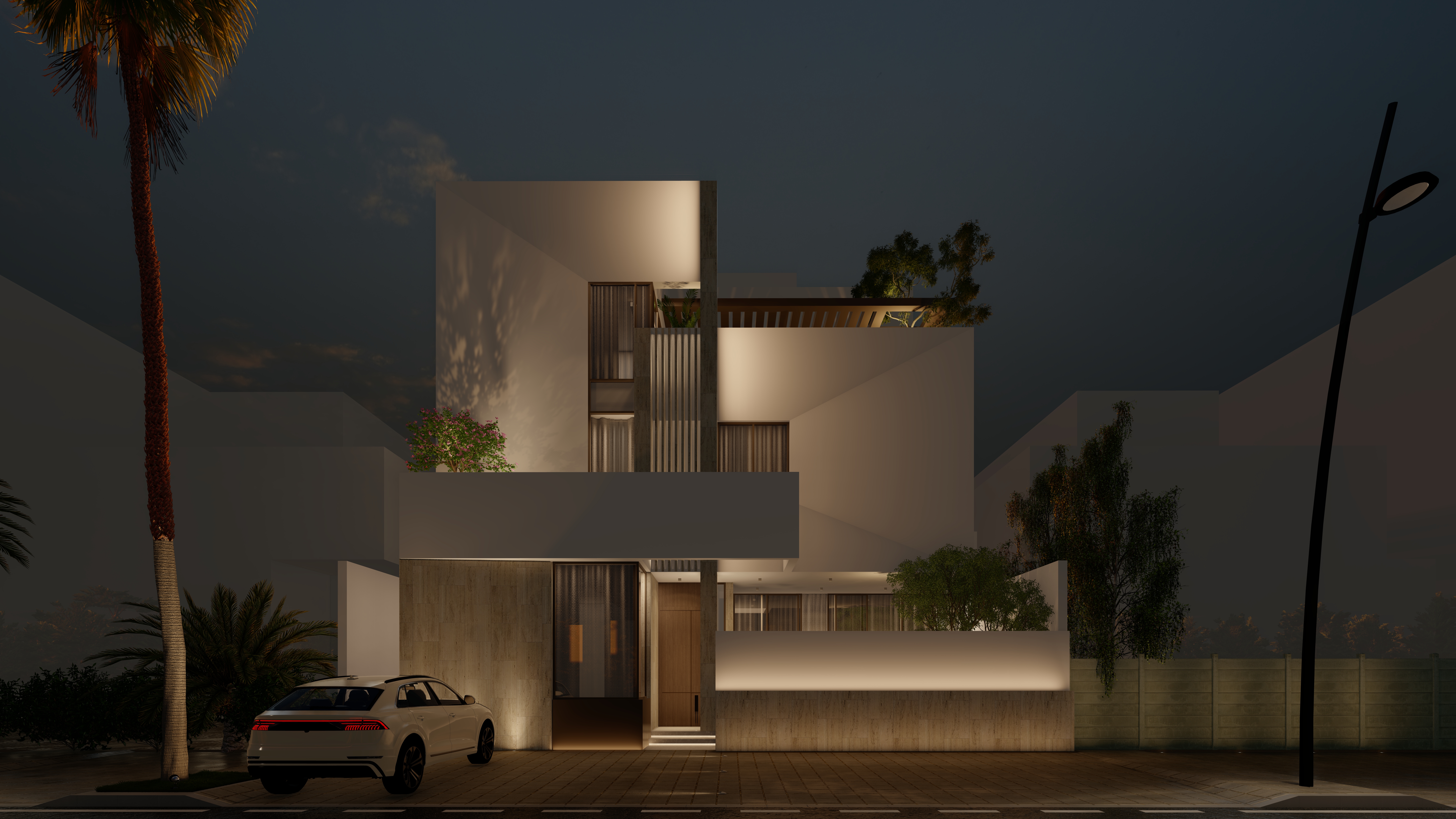 A private forecourt blends light, shadow, and nature at the home’s entry.