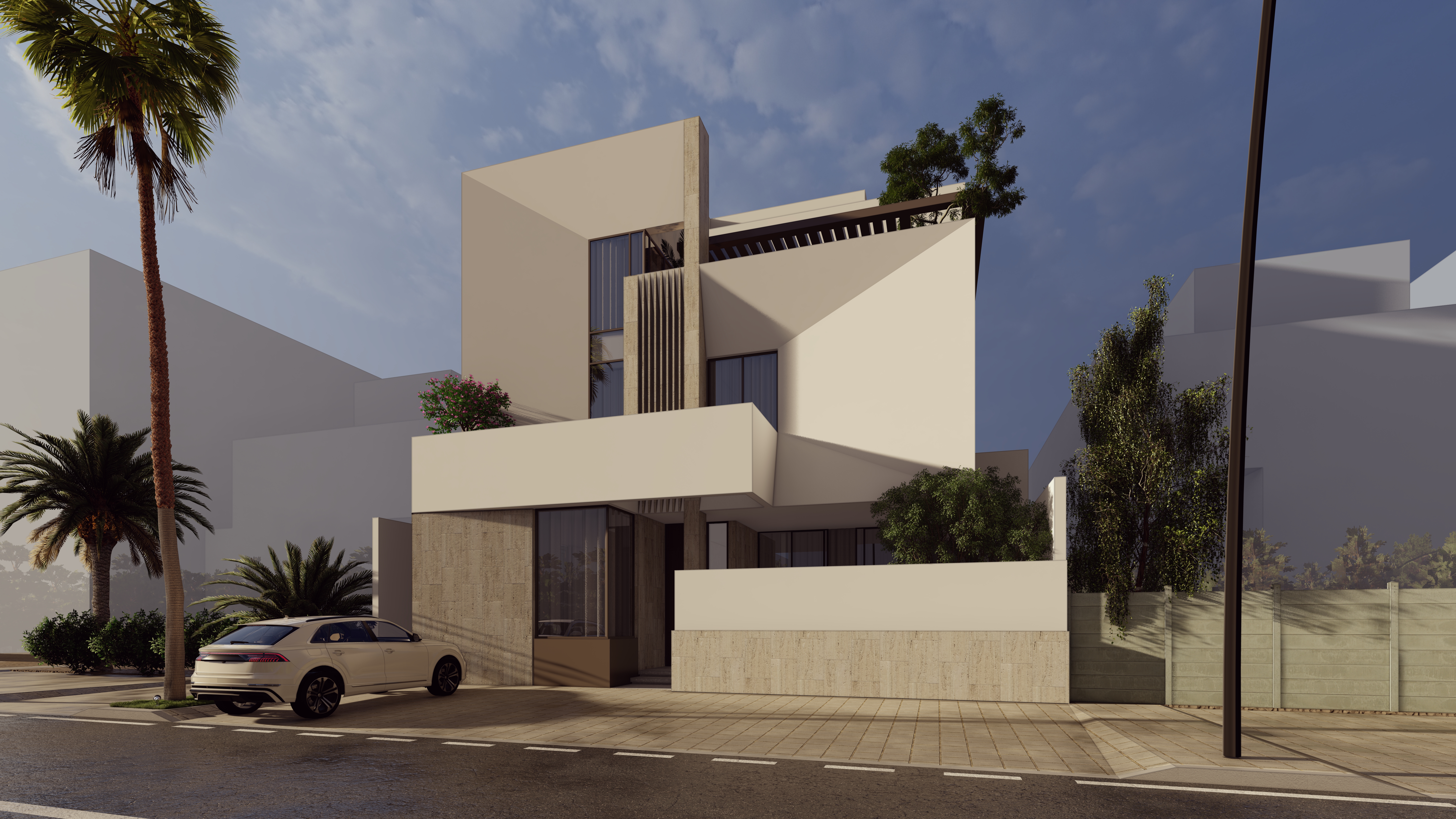 A vertical finned element adds depth, texture, and shadow play to the façade.