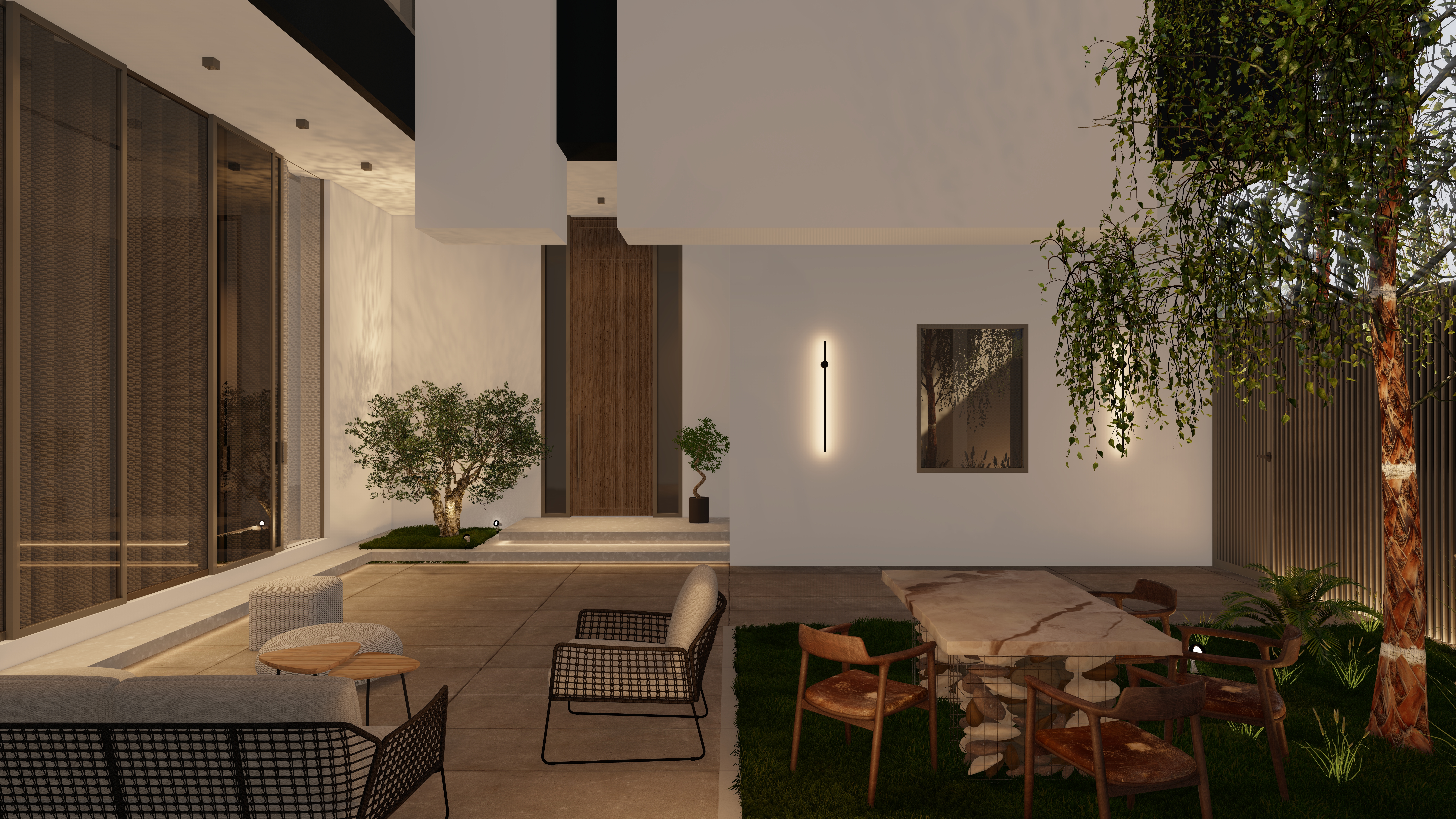 A serene entry unfolds through a private court, where architecture and landscape blend to create a welcoming threshold before the home.